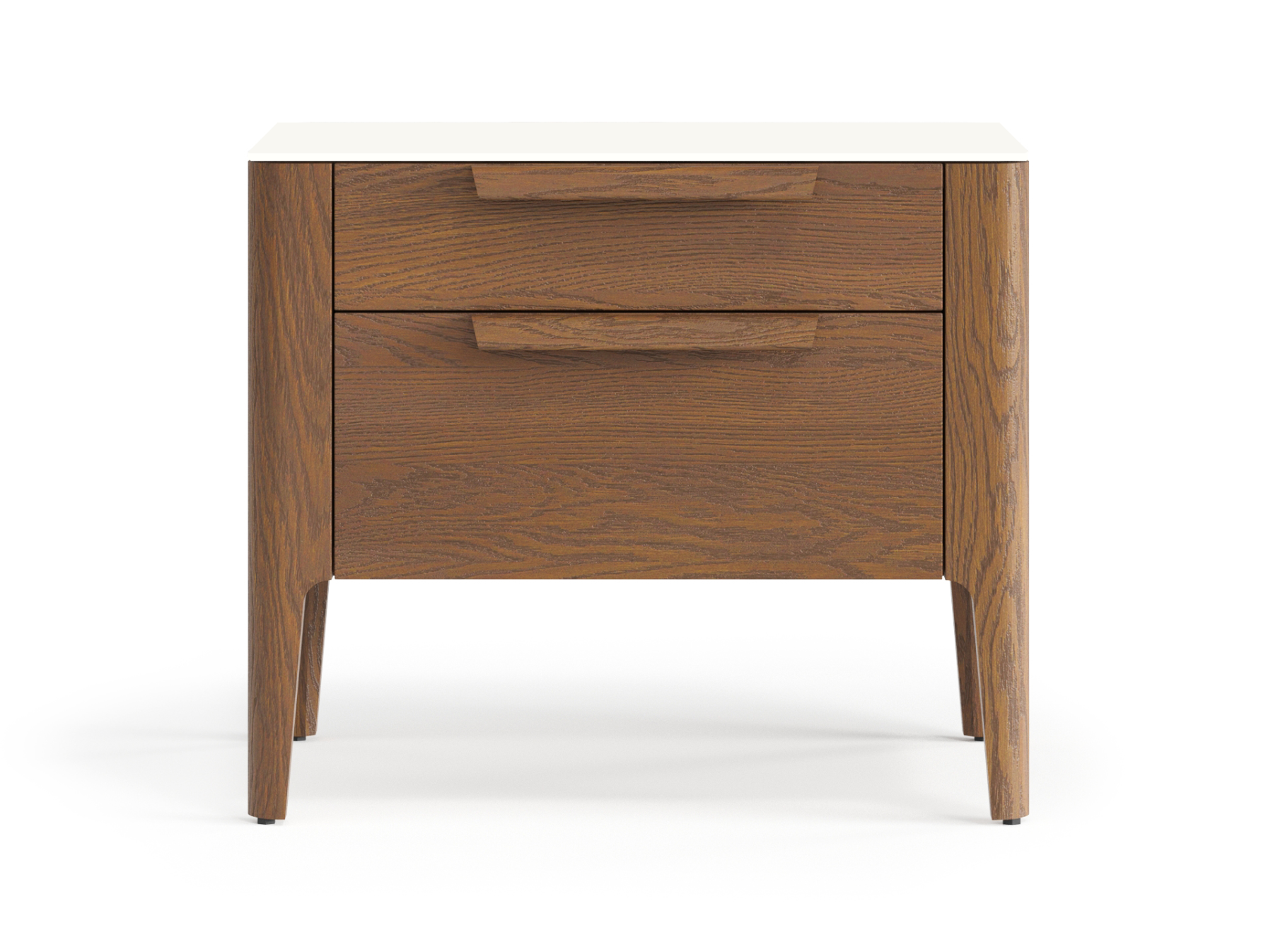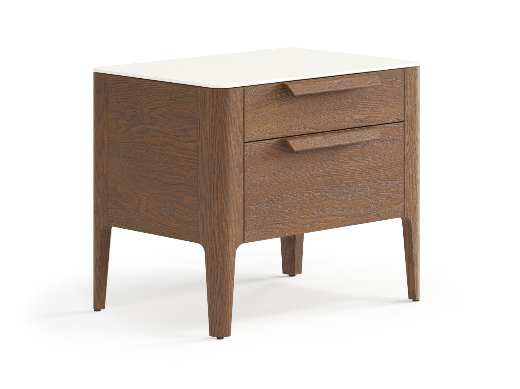 Два выдвижных ящика прикроватной тумбы позволяют вместить все необходимые вещи, которые нужны под рукой в важные утренние и вечерние минуты. Направляющие ящиков скрыты от глаз — ничто не отвлекает внимания от эстетики дизайнерского изделия, а встроенный в механизм доводчик делает пользование тумбой тихим и комфортным.