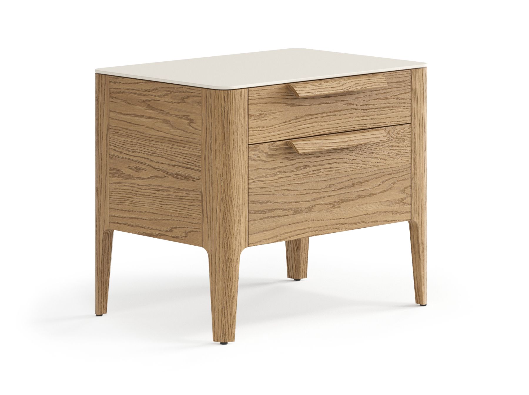 Два выдвижных ящика прикроватной тумбы позволяют вместить все необходимые вещи, которые нужны под рукой в важные утренние и вечерние минуты. Направляющие ящиков скрыты от глаз — ничто не отвлекает внимания от эстетики дизайнерского изделия, а встроенный в механизм доводчик делает пользование тумбой тихим и комфортным.