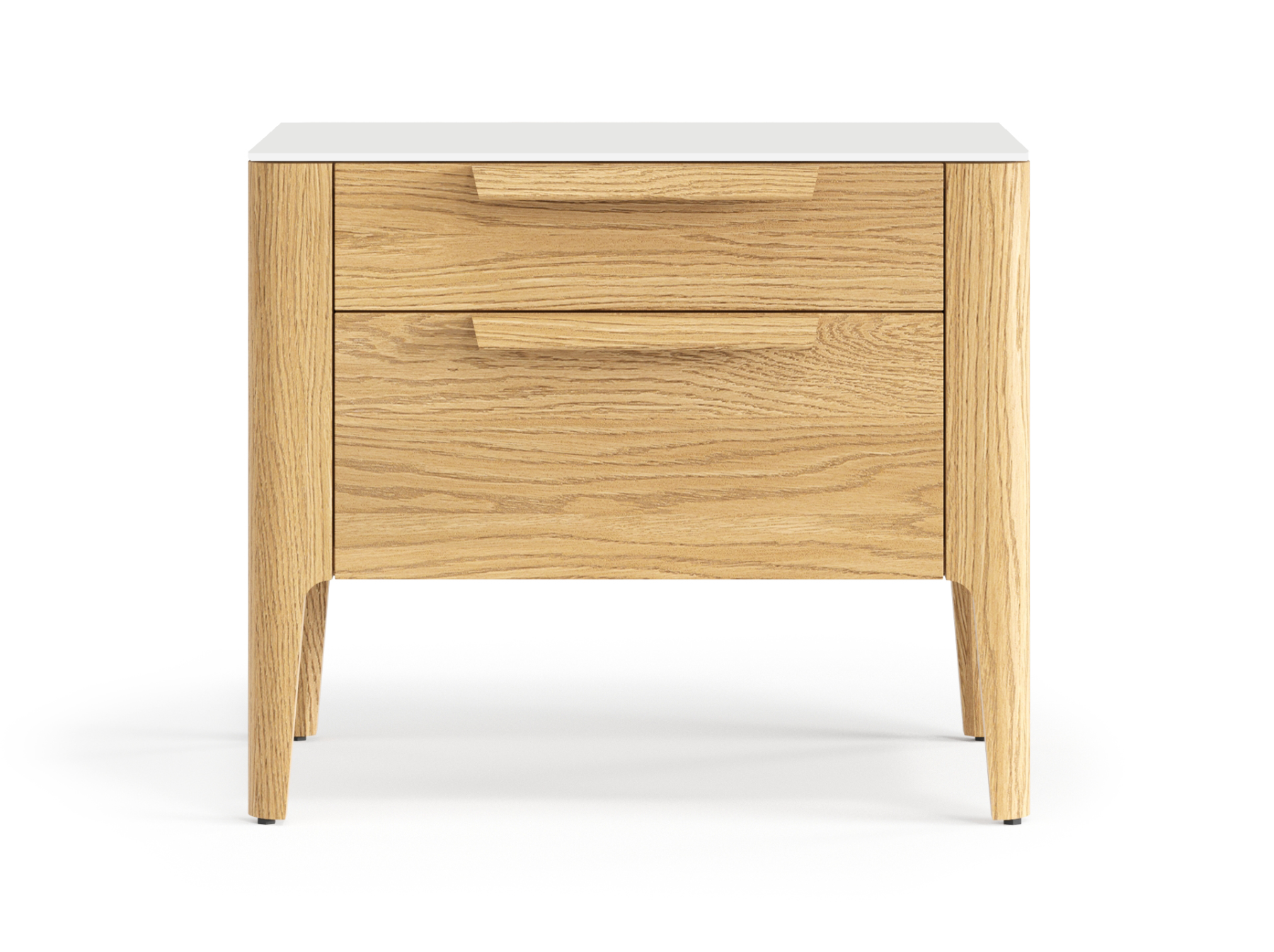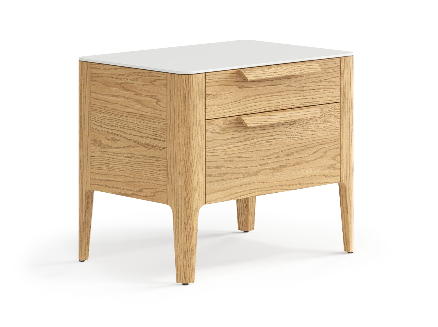Два выдвижных ящика прикроватной тумбы позволяют вместить все необходимые вещи, которые нужны под рукой в важные утренние и вечерние минуты. Направляющие ящиков скрыты от глаз — ничто не отвлекает внимания от эстетики дизайнерского изделия, а встроенный в механизм доводчик делает пользование тумбой тихим и комфортным.