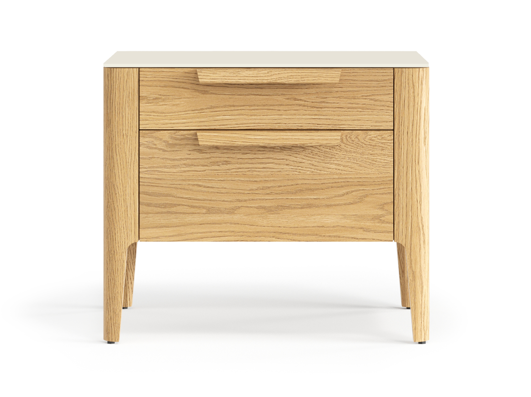 Два выдвижных ящика прикроватной тумбы позволяют вместить все необходимые вещи, которые нужны под рукой в важные утренние и вечерние минуты. Направляющие ящиков скрыты от глаз — ничто не отвлекает внимания от эстетики дизайнерского изделия, а встроенный в механизм доводчик делает пользование тумбой тихим и комфортным.