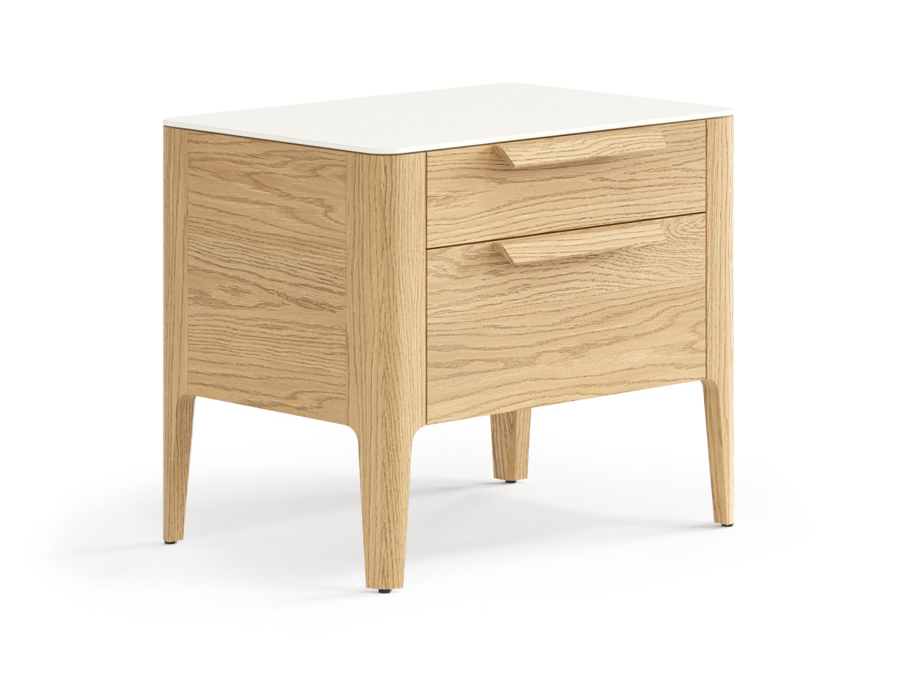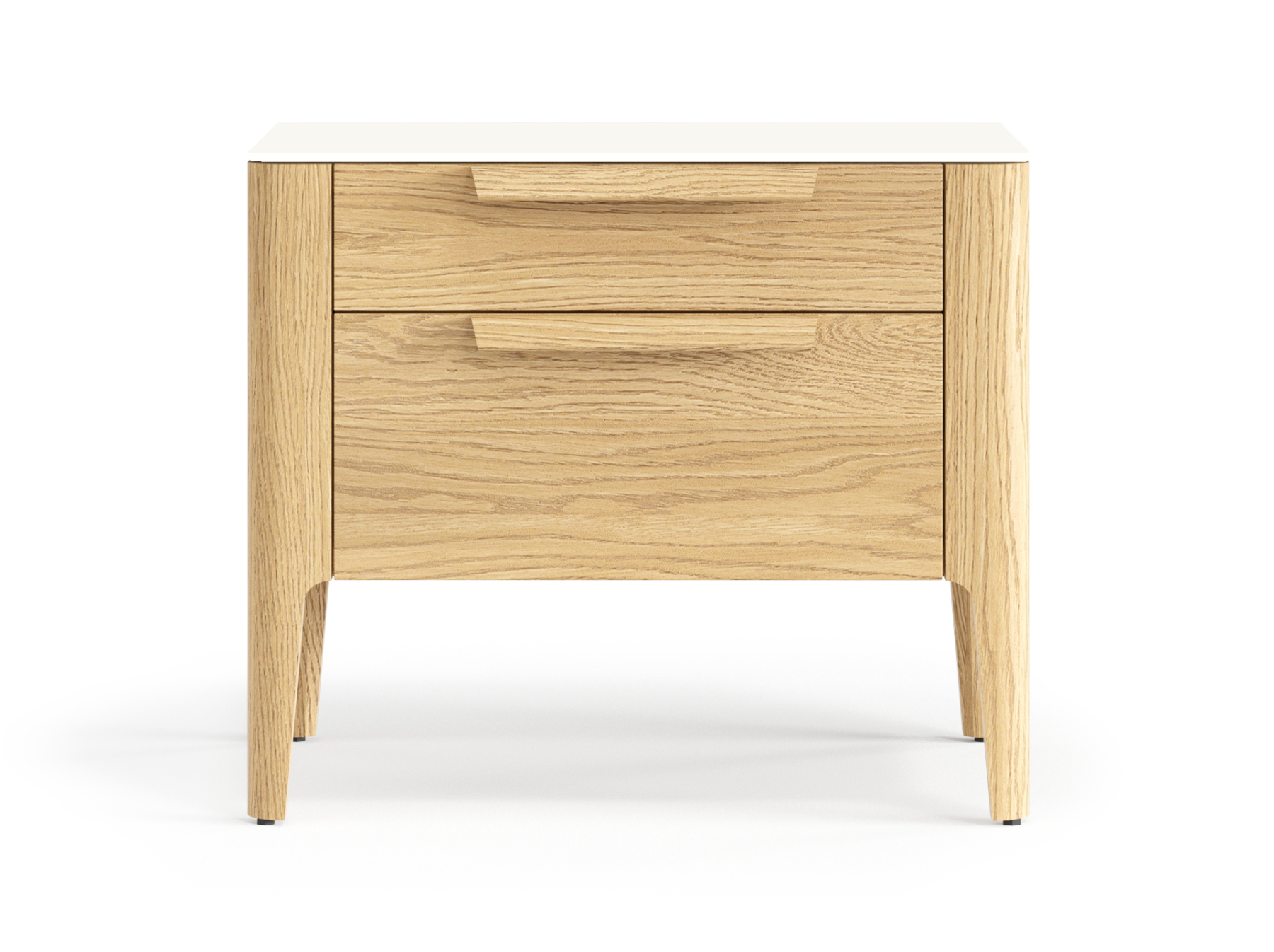 Два выдвижных ящика прикроватной тумбы позволяют вместить все необходимые вещи, которые нужны под рукой в важные утренние и вечерние минуты. Направляющие ящиков скрыты от глаз — ничто не отвлекает внимания от эстетики дизайнерского изделия, а встроенный в механизм доводчик делает пользование тумбой тихим и комфортным.