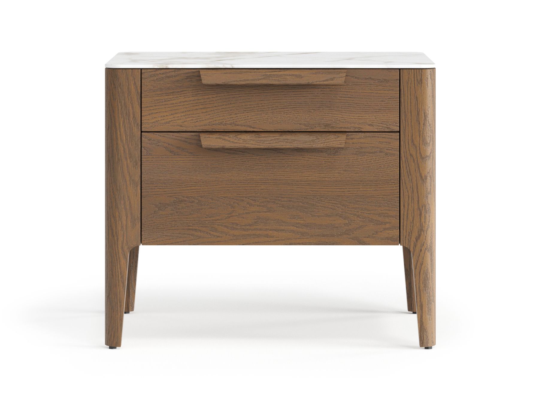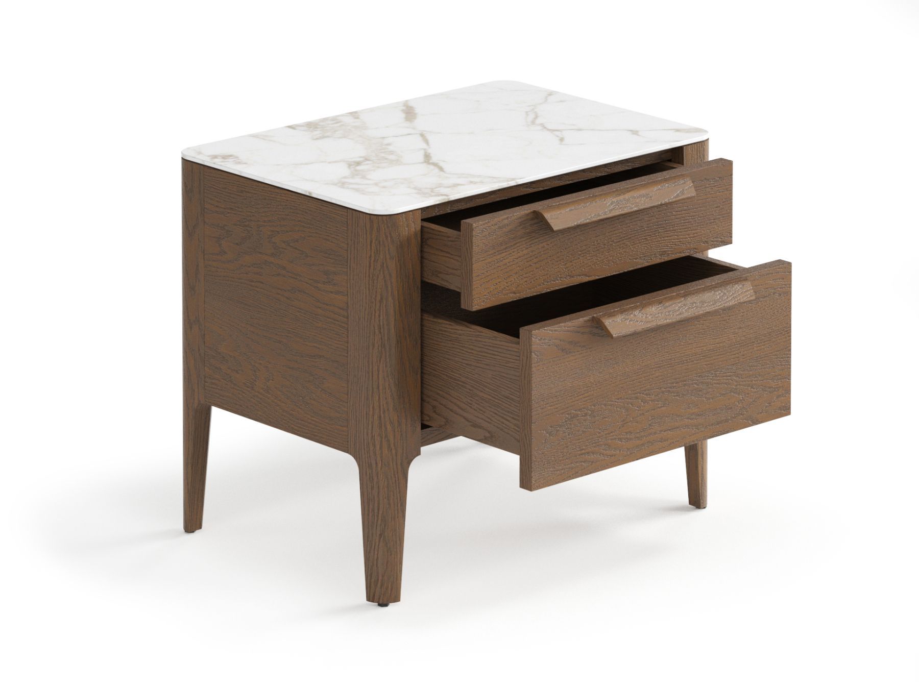 Два выдвижных ящика прикроватной тумбы позволяют вместить все необходимые вещи, которые нужны под рукой в важные утренние и вечерние минуты. Направляющие ящиков скрыты от глаз — ничто не отвлекает внимания от эстетики дизайнерского изделия, а встроенный в механизм доводчик делает пользование тумбой тихим и комфортным.