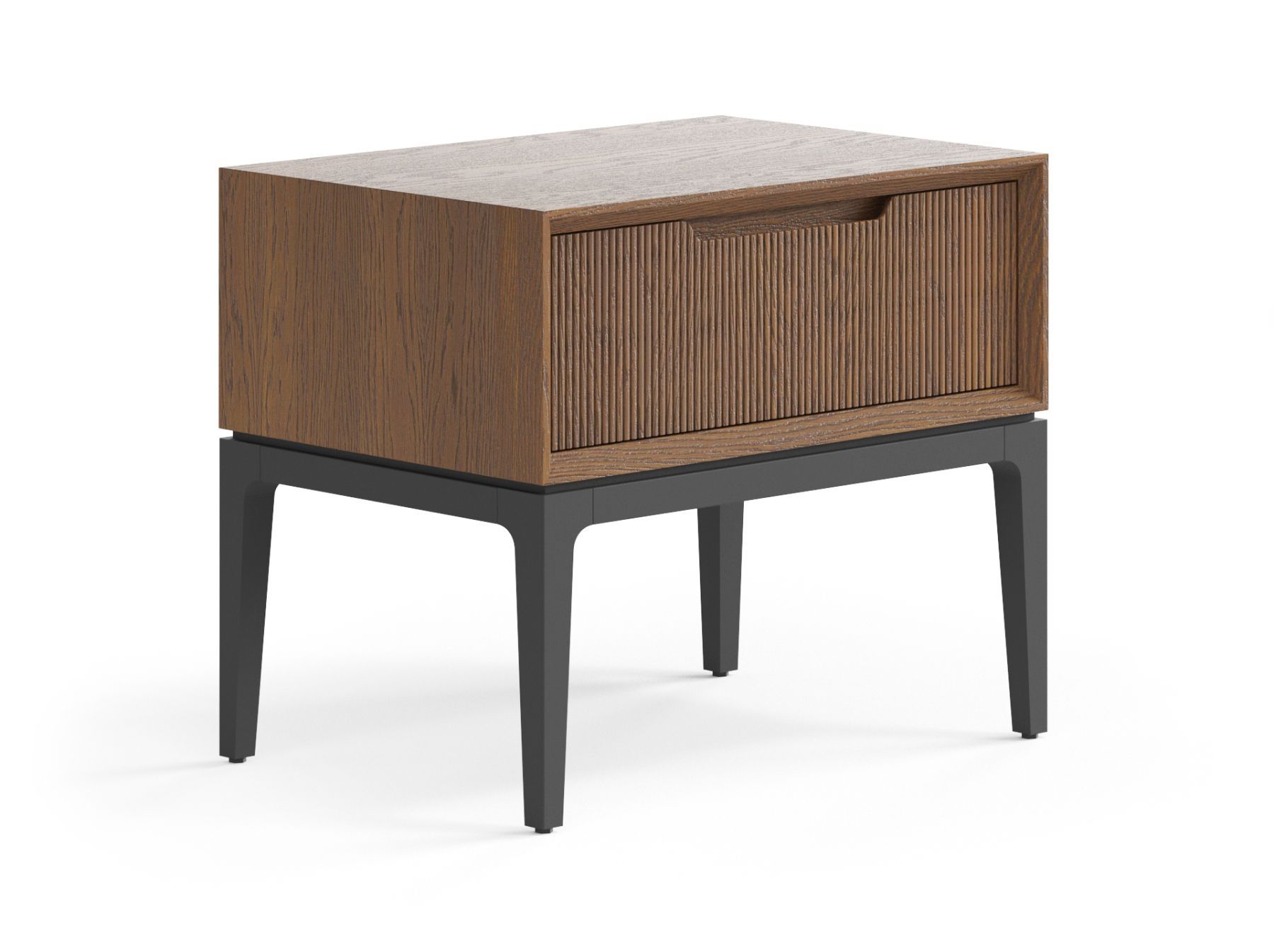 Стильная тумба с одним выдвижным ящиком гармонично впишется в интерьер спальни. Опоры, как и фасад изделия, выполнены из массива. Ножки могут быть древесными в цвет корпуса или же в чёрном матовом покрытии эмалью — любое решение будет выглядеть элегантно и современно.
