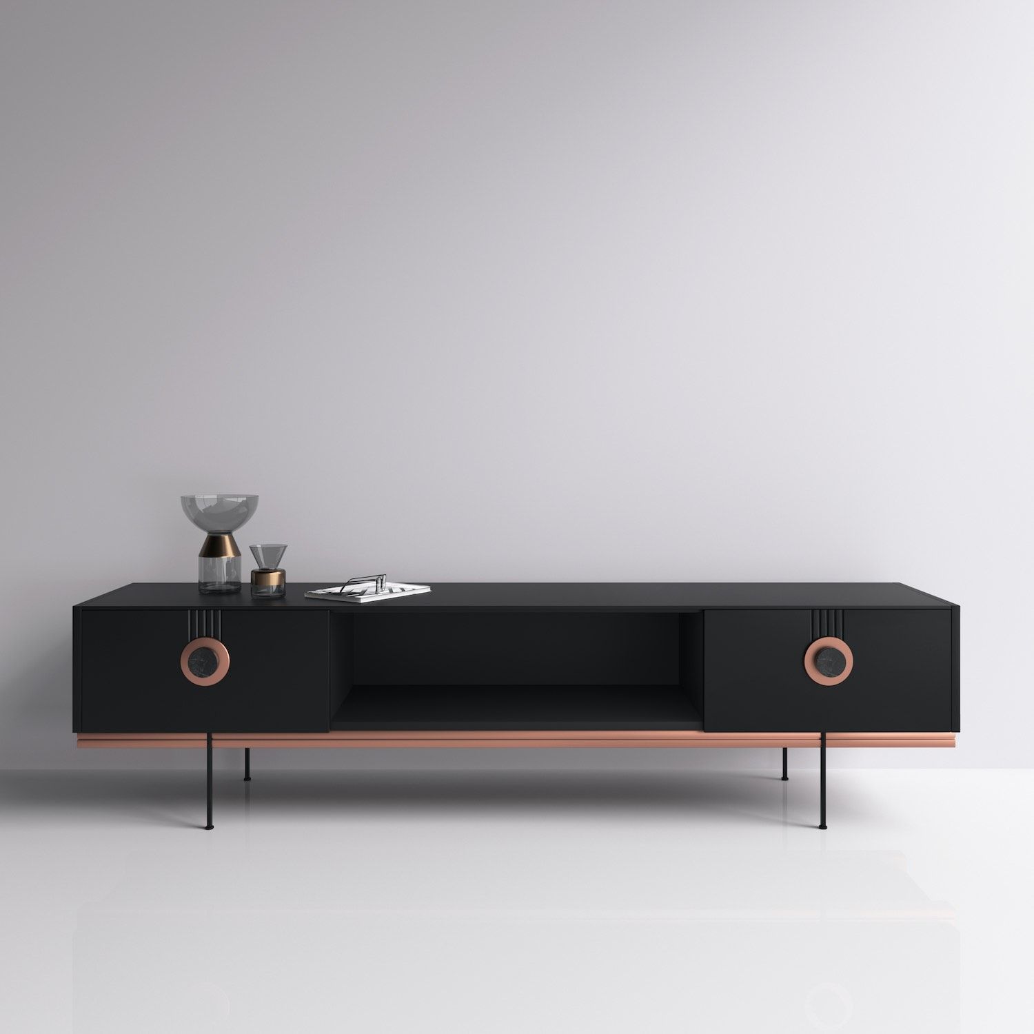 Распашные дверцы тумбы оснащены петлями с доводчиками плавного закрывания корпус, ниша и фасады-эмаль Ral 9011, кант ручек и основание-эмаль медь Ral 8029