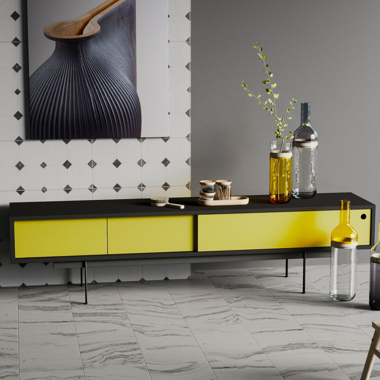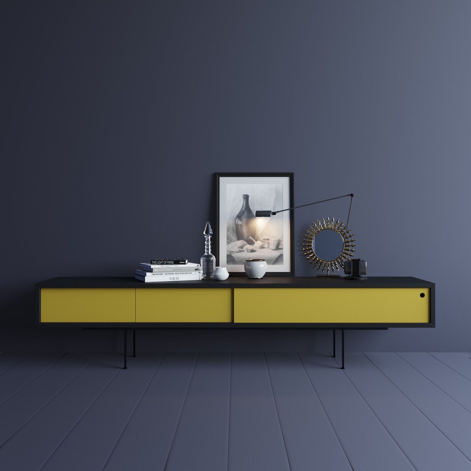 Тумба ТВ Long new из коллекции Tube отличается лаконичным дизайном и функциональностью. Тумба оснащена одной раздвижной дверцей и двумя ящикам, система открывания Push Корпус и ножки-эмаль черная ral 9004/ фасады- эмаль желтая ral design 095 70 60.
