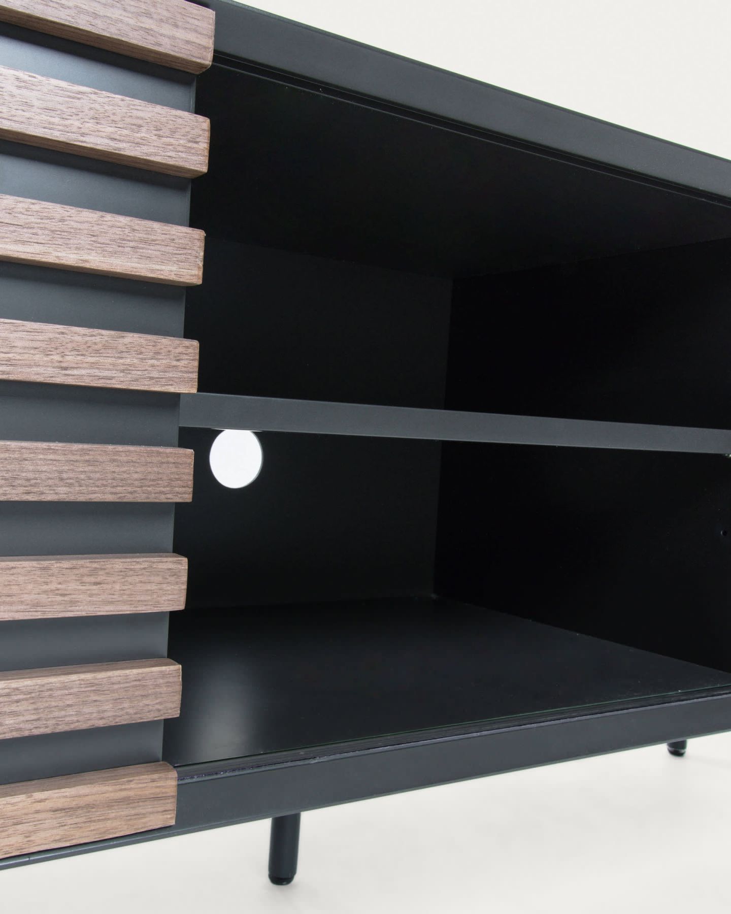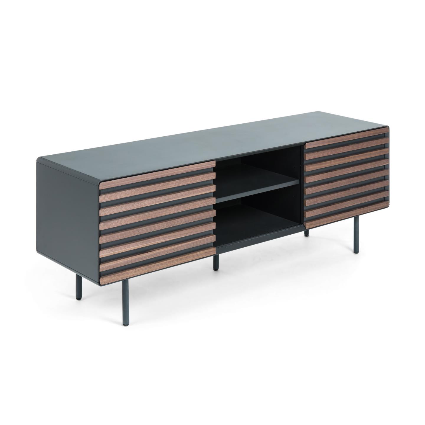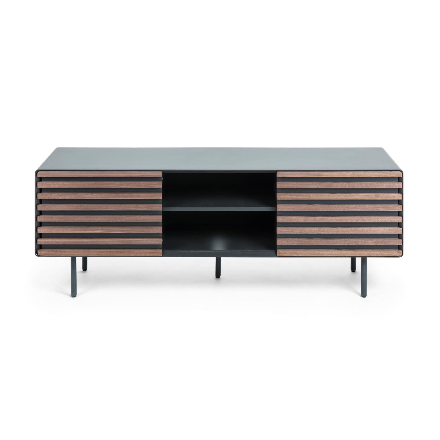 Тумба под ТВ Mahon орех от фабрики La Forma – стильный дизайн и лаконичная конструкция. Тумба под ТВ Mahon выглядит эффектно и стильно. Главная особенность модели – это полосатый фасад, созданный из двух оттенков дерева. Он первый привлекает внимание своим ярким видом. Раздвижная конструкция – второй плюс, относящийся уже к эргономике модели. В зависимости от интерьера или содержимого тумбы, положение дверей можно менять всего за мгновение. Тумба прямоугольной формы. Каркас сборный, со скругленными углами. Он вертикально поделен перегородкой на два или три отделения (зависит от выбранной модели). Полки и каркас сделаны из МДФ с матовой ламинацией графитового цвета. Покрытие обеспечивает стойкость к негативным внешним воздействиям, облегчает уход за изделием. Изделие оснащено одной или двумя передвижными дверями, которые вставлены в металлические полозья. Они работает по принципу «купе». Двери также сделаны из МДФ, на который насажены рейки из шпона орехового дерева. Ножки из металла, трубчатые. Их высота – 19,5 см, диаметр – 2,5 см. Для защиты напольного покрытия от повреждений, есть стабилизирующие наконечники. Размеры: длина – 120 или 162 см, глубина – 45 см, высота – 48,5 или 58 см. Потребуется сборка. Инструкция и крепеж входят в комплектацию. В коллекцию Mahon также включены консоль, буфет, письменный стол.