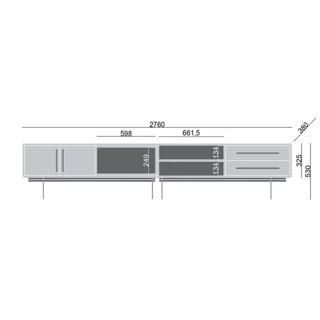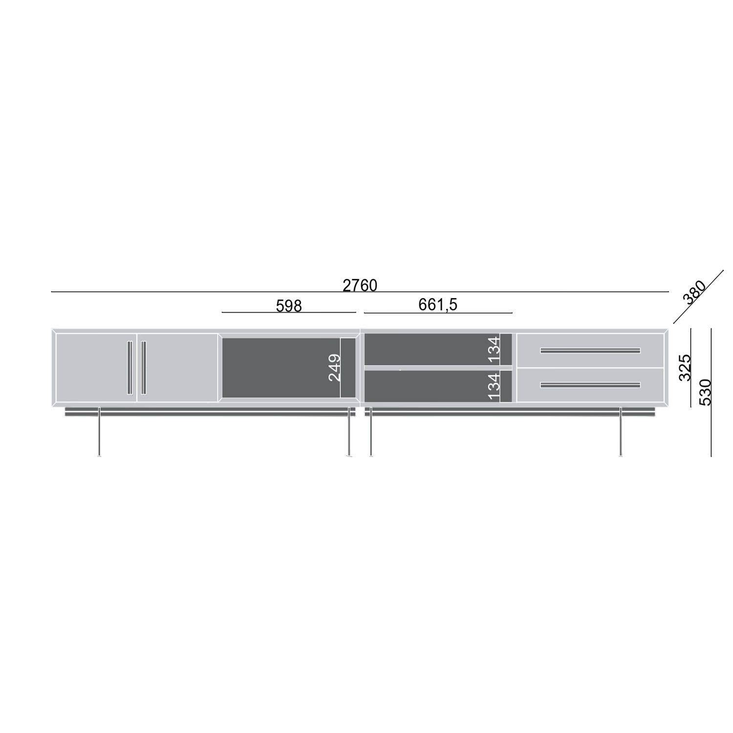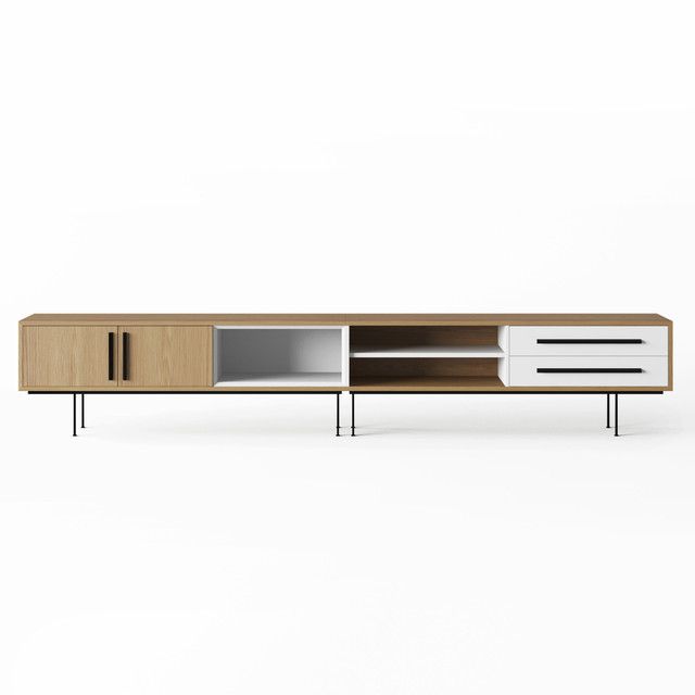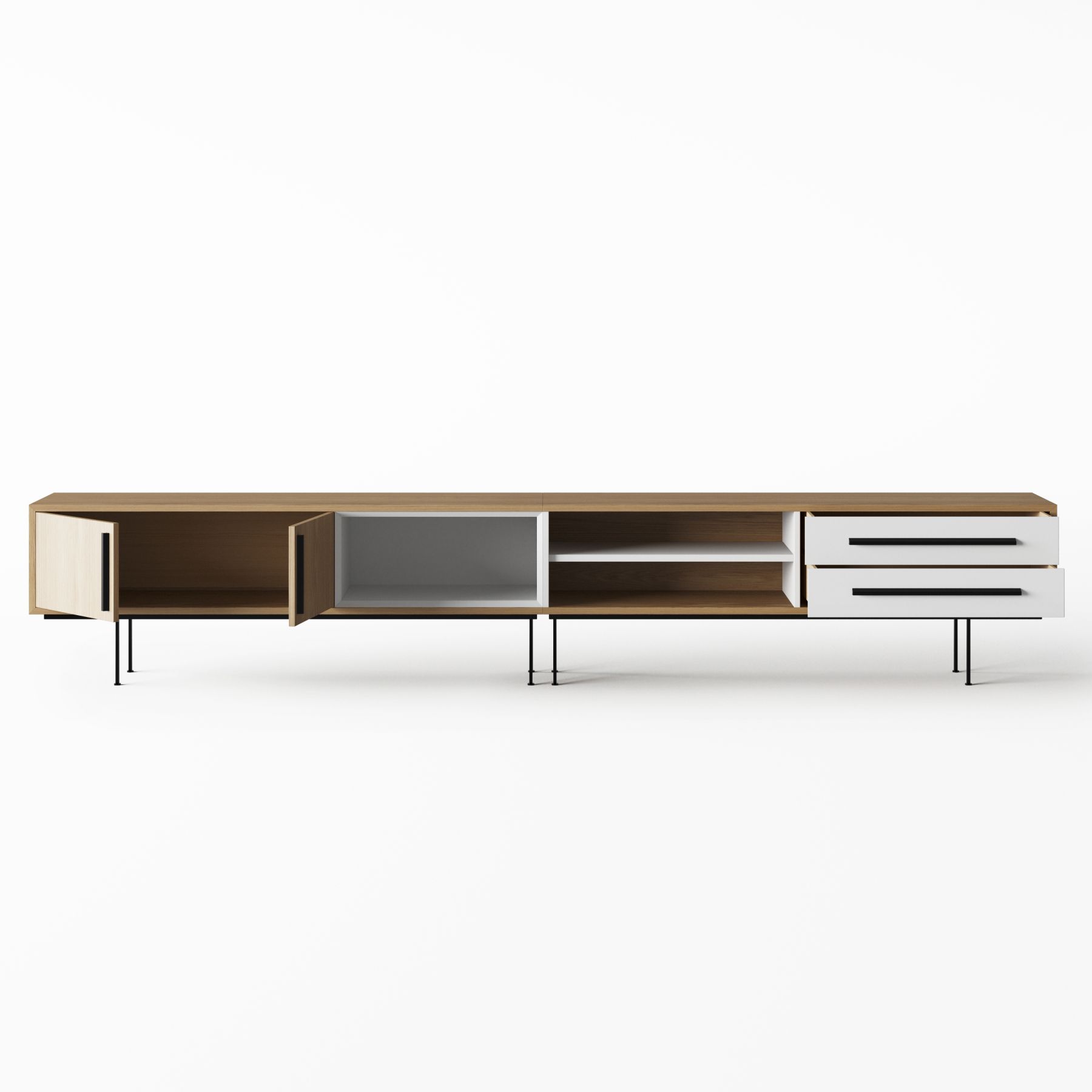 Оснащение тумбы- 2 ниши, 2 выдвижных ящика с доводчиками и секция с распашными фасадами. Тумба состоит из 2-х частей. Корпус и распашные фасады-шпон дуба натурального, фасады ящиков -эмаль беля ral 9003, ручки, ножки и основание-эмаль черная ral 9011, ниша и полка- эмаль белая ral 9003
