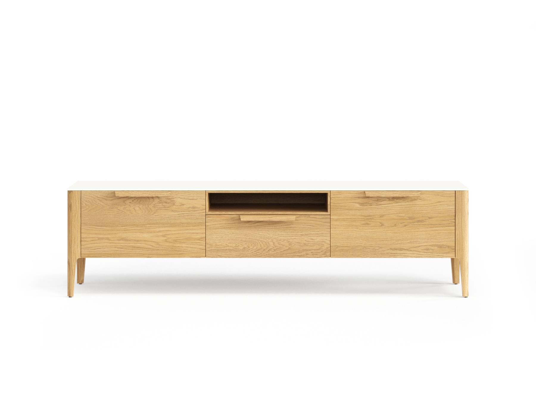 Боковые дверцы и центральный выдвижной ящик позволят разместить все необходимые вещи за гладкими фасадами. Ничто не будет отвлекать вас от отдыха и просмотров любимых фильмов.