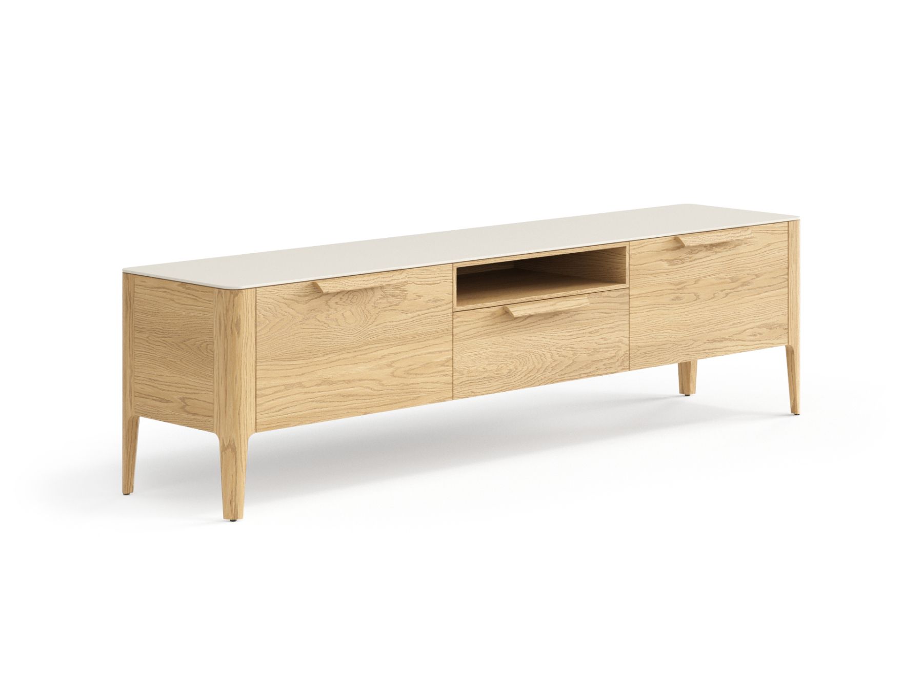 Боковые дверцы и центральный выдвижной ящик позволят разместить все необходимые вещи за гладкими фасадами. Ничто не будет отвлекать вас от отдыха и просмотров любимых фильмов.