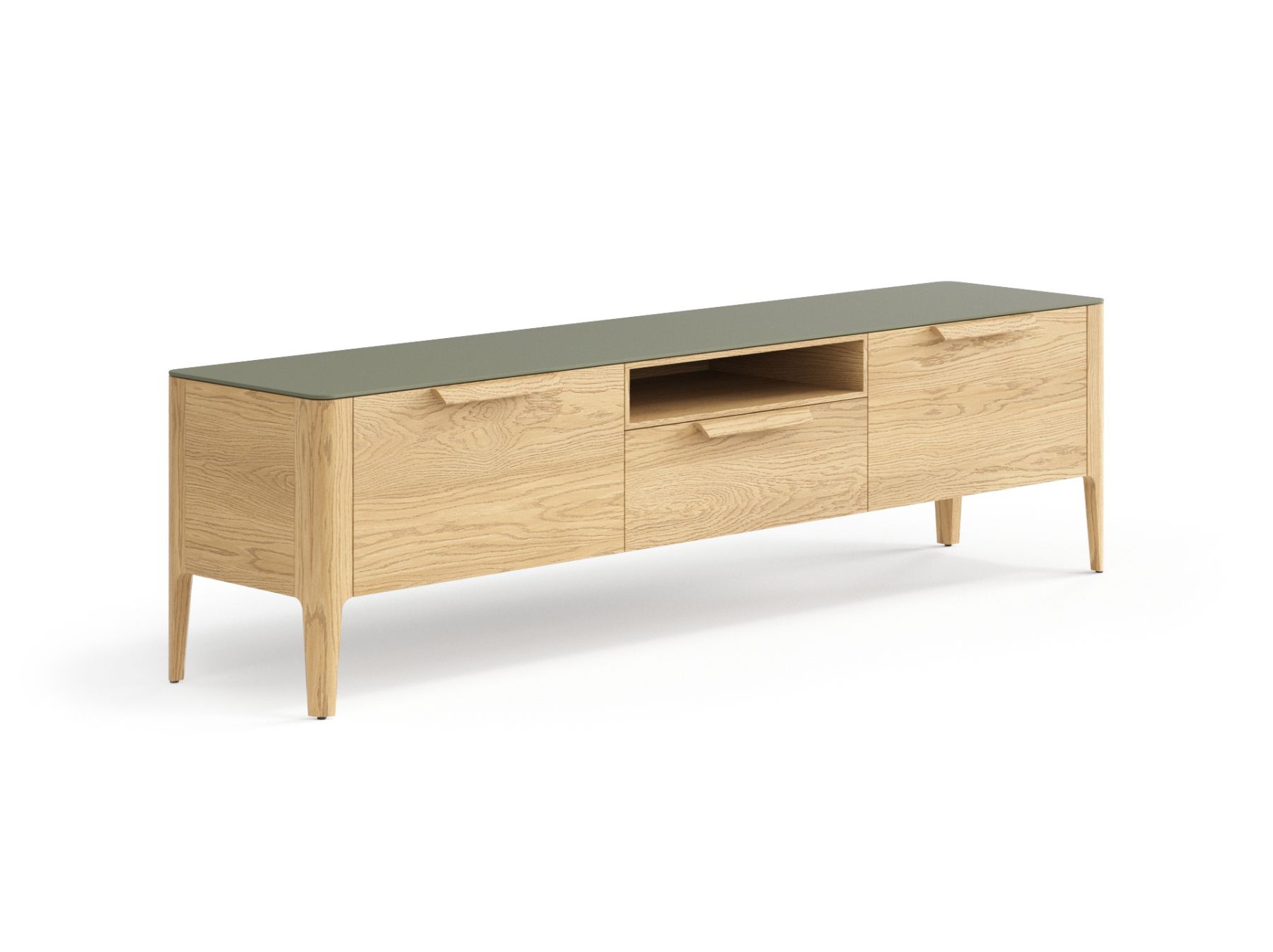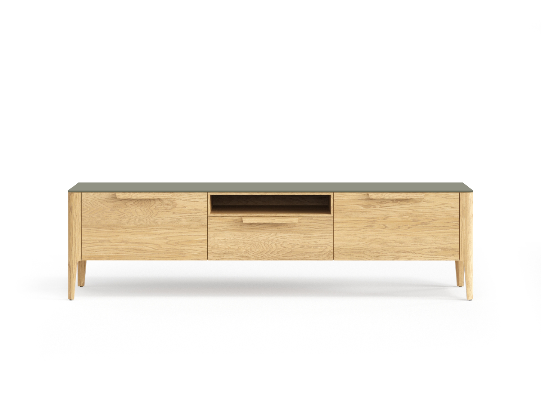 Боковые дверцы и центральный выдвижной ящик позволят разместить все необходимые вещи за гладкими фасадами. Ничто не будет отвлекать вас от отдыха и просмотров любимых фильмов.