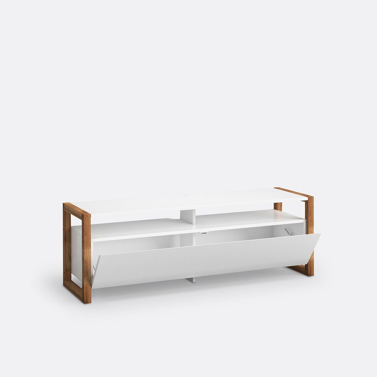 Современная ТВ-тумба Compo сочетает в себе скандинавский стиль, массив дуба и МДФ белого цвета. Описание ТВ-тумбы с откидной крышкой, Compo: