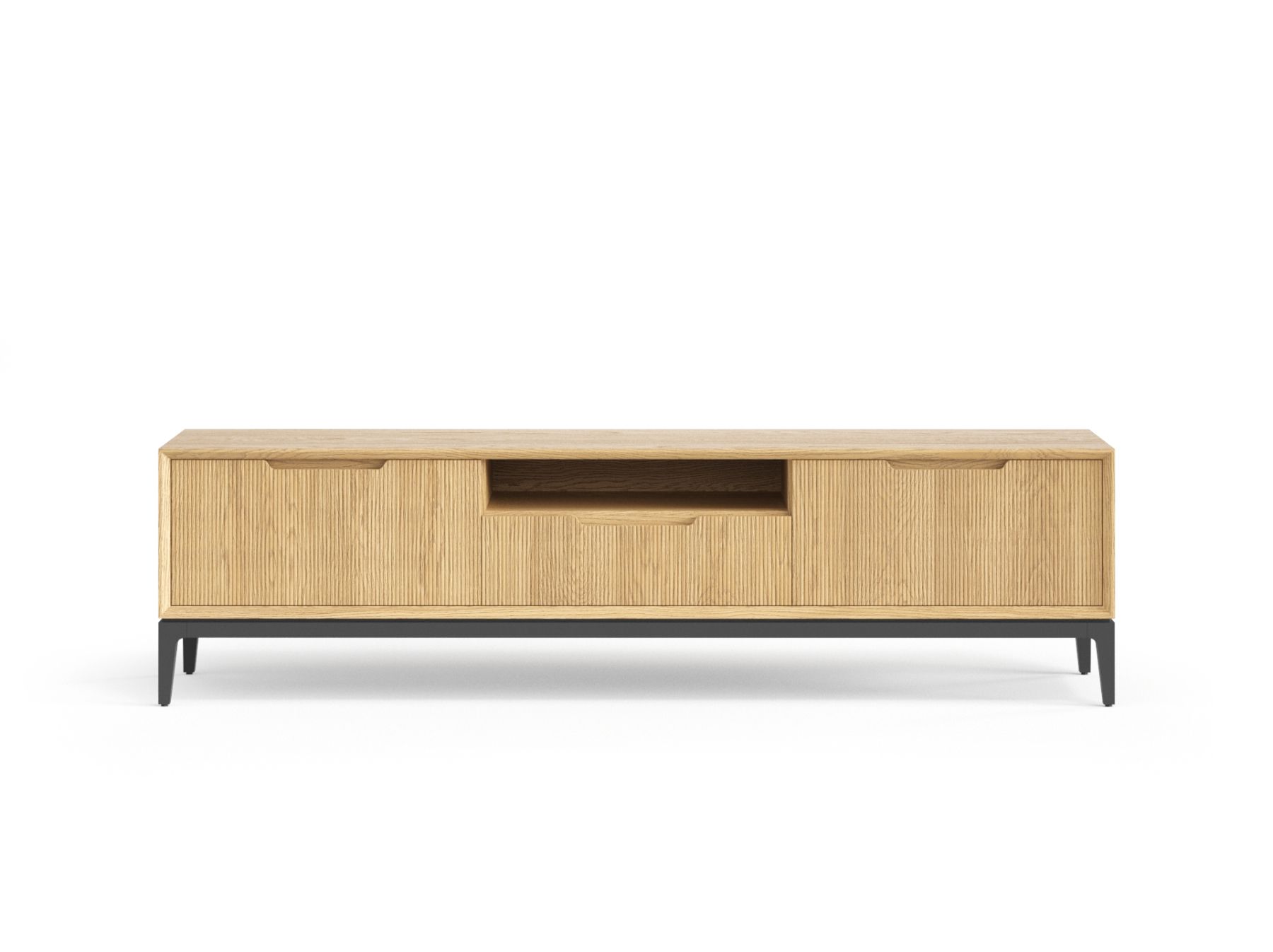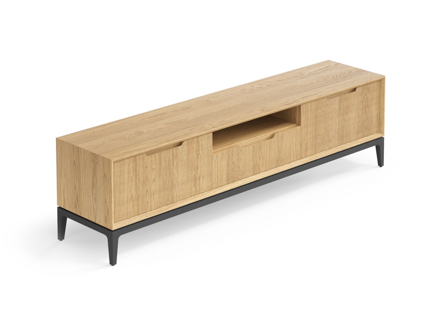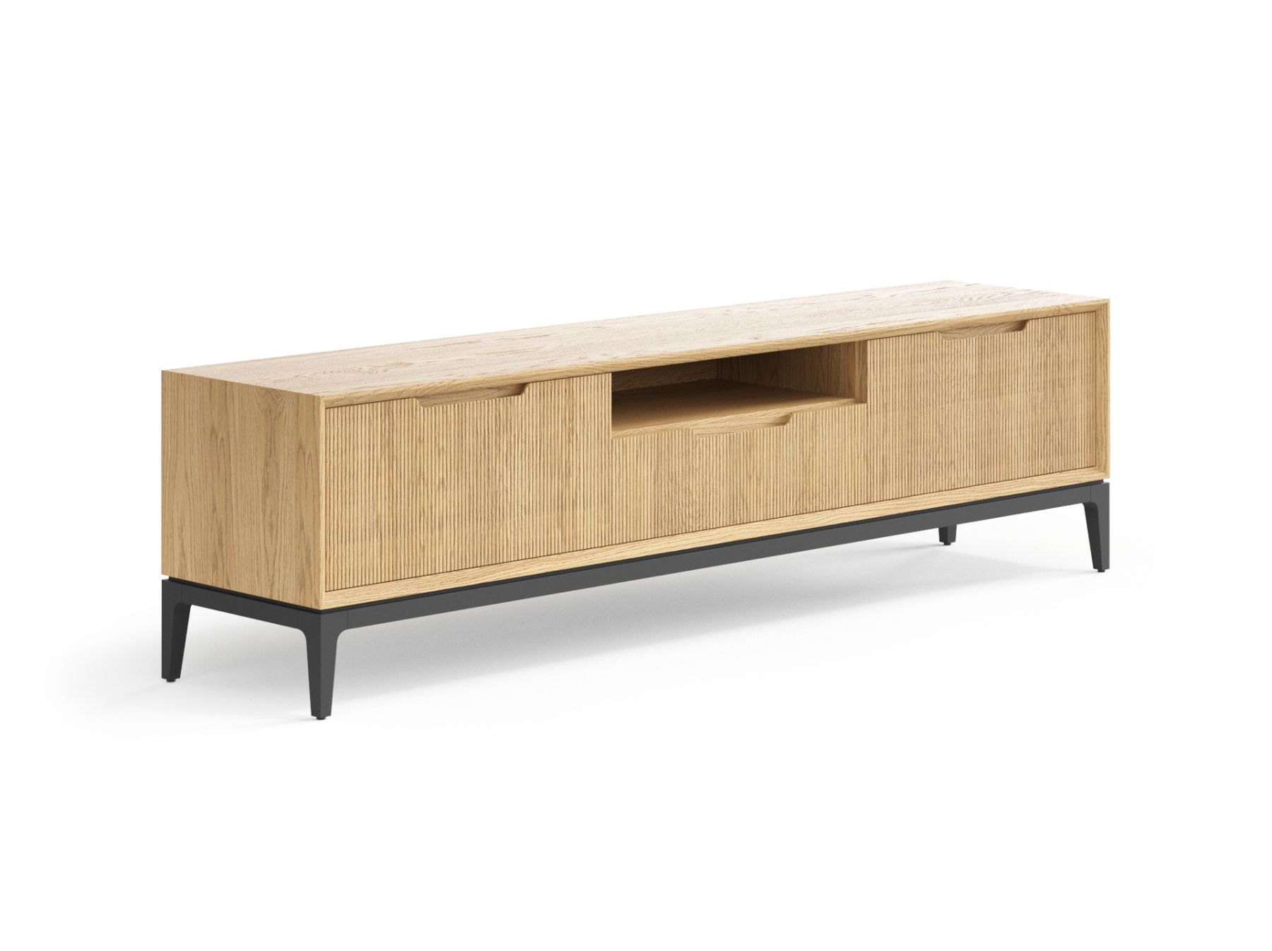 Боковые дверцы и центральный выдвижной ящик позволят разместить все необходимые вещи за фасадами с рельефной фрезеровкой. Ничто не будет отвлекать вас от отдыха и просмотров любимых фильмов.