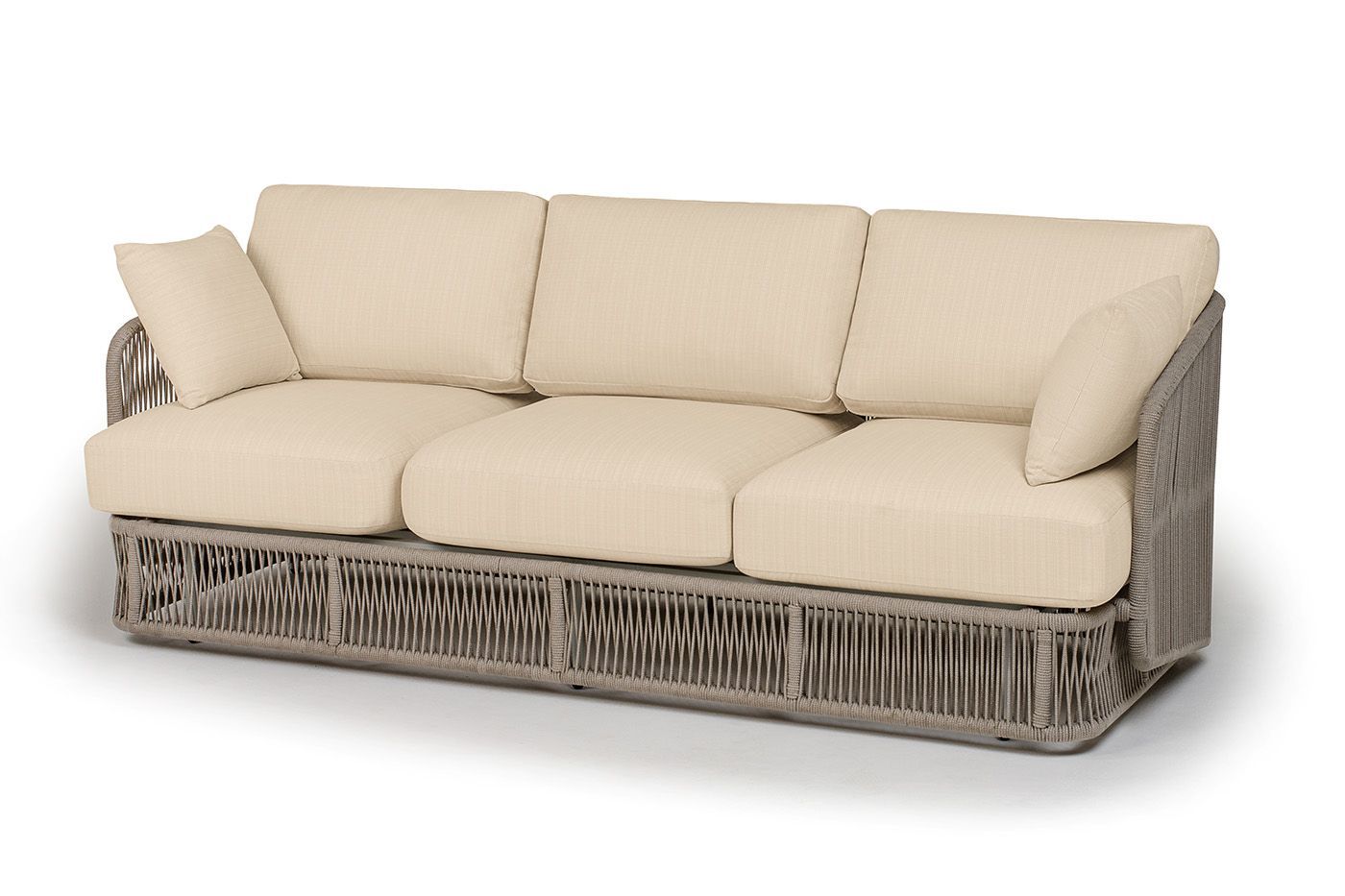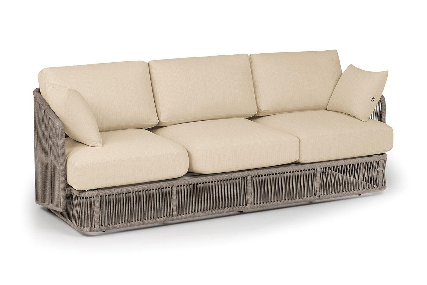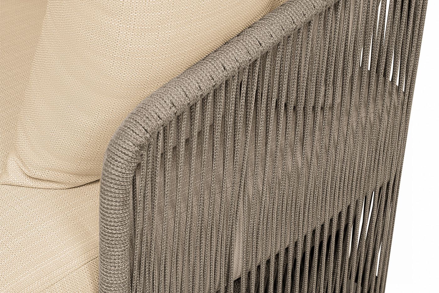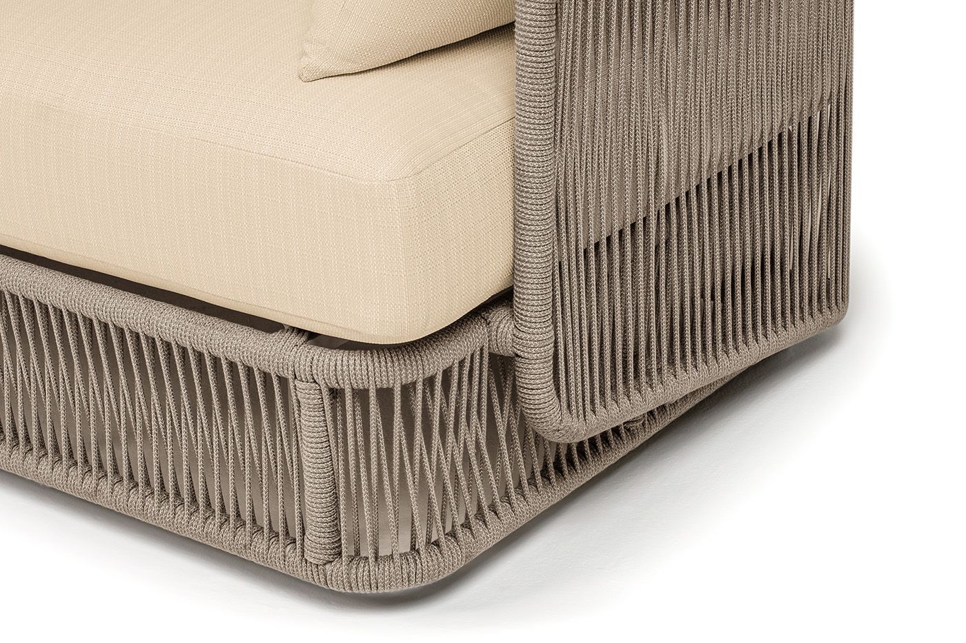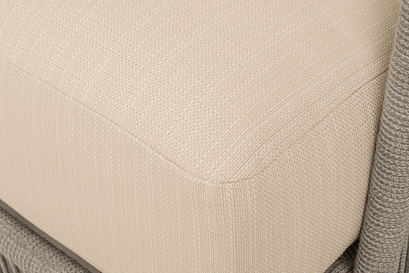 Диван имеет алюминиевый каркас, окрашенный порошковой краской в светло-серый (RAL7035) цвет. Боковины каркаса и спинка вручную оплетены роупом - эластичными синтетическими лентами, изготовленными из высокопрочных полиэфирных волокон. Цвет оплетки - серый меланж.