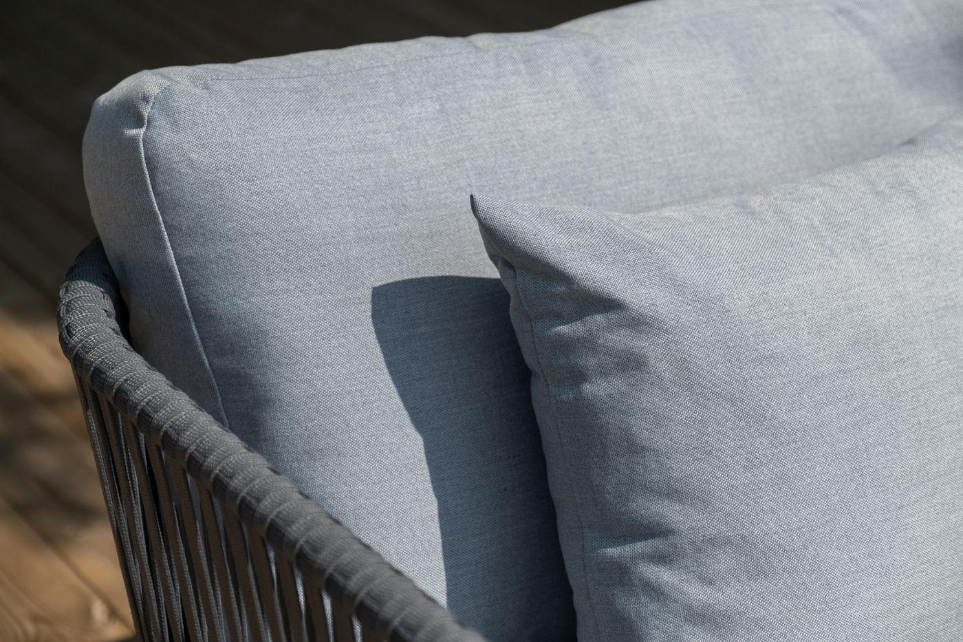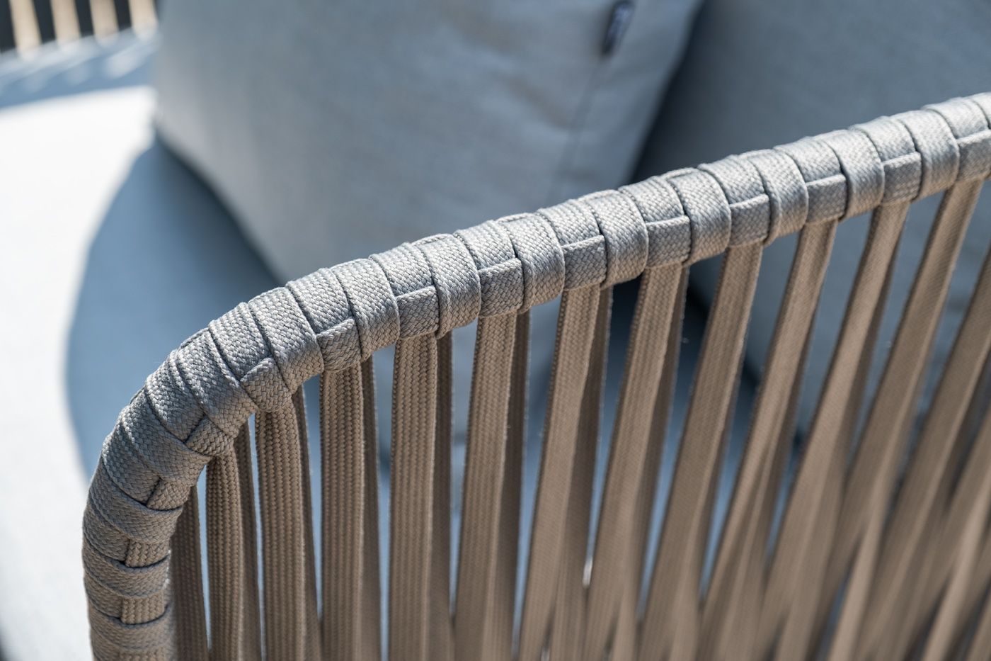 Диван имеет алюминиевый каркас, окрашенный порошковой краской в темно-серый (RAL7024) цвет. Боковины каркаса вручную оплетены роупом - эластичными синтетическими лентами, изготовленными из высокопрочных полиэфирных волокон. Цвет оплетки - серый.