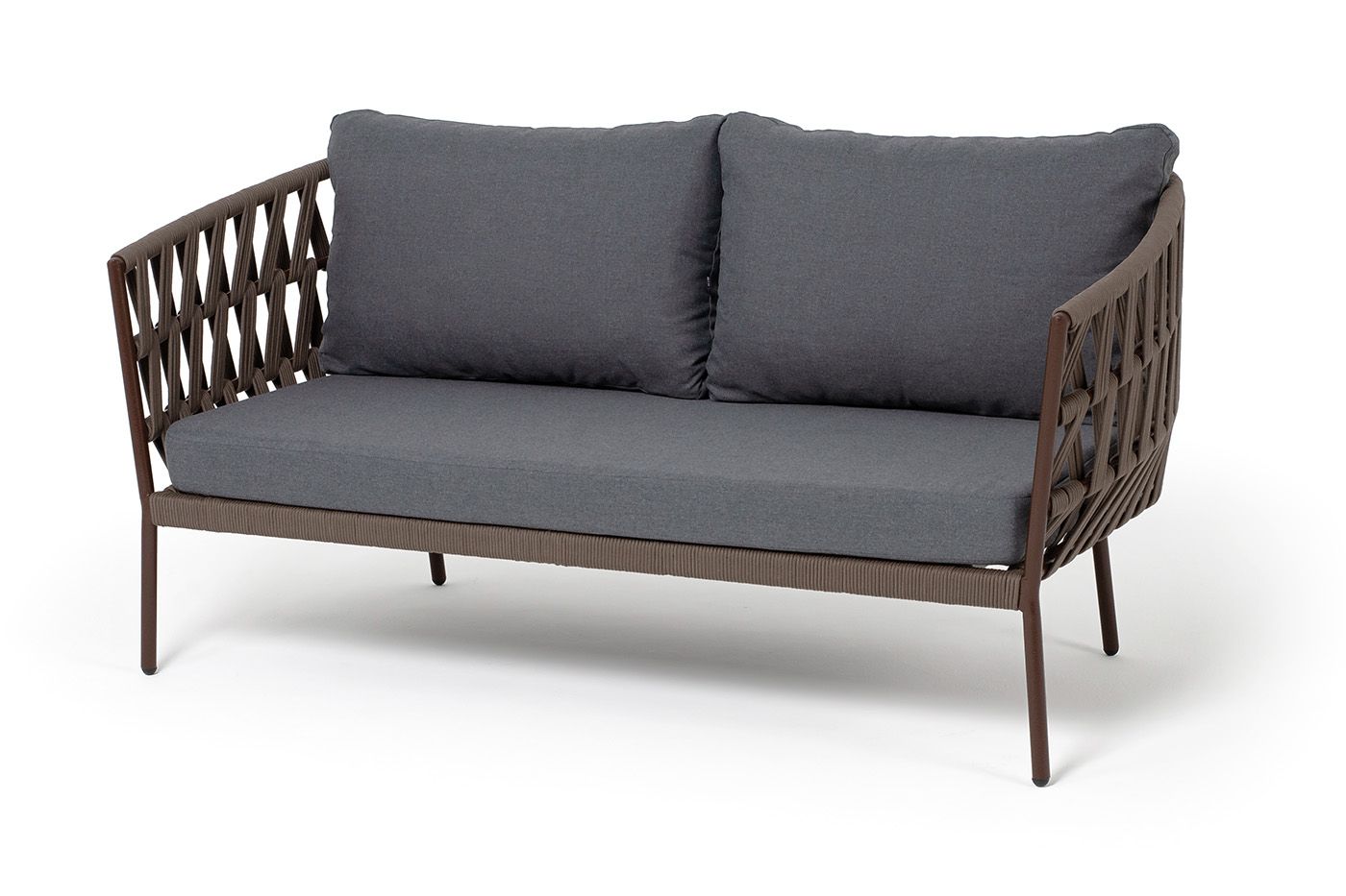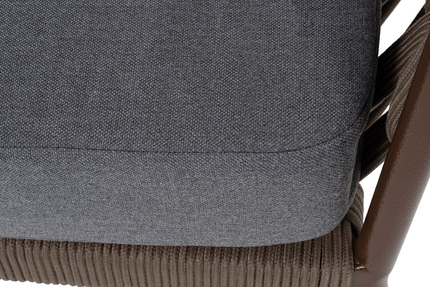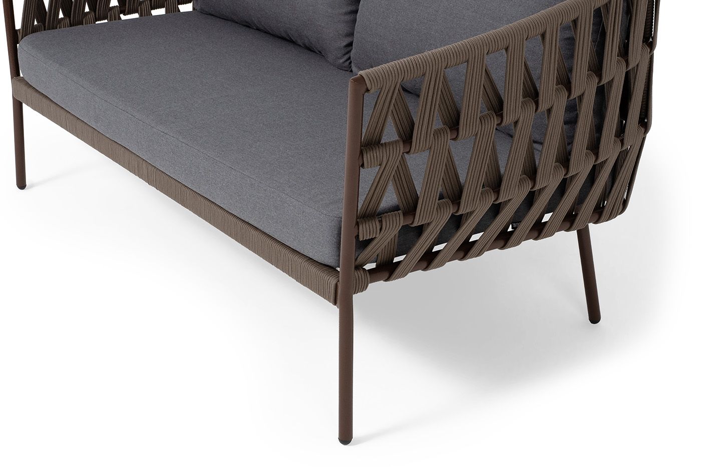 Диван имеет алюминиевый каркас, окрашенный порошковой краской в коричневый (RAL8016) цвет. Боковины каркаса и спинка вручную оплетены роупом - эластичными синтетическими лентами, изготовленными из высокопрочных полиэфирных волокон. Цвет оплетки - коричневый.