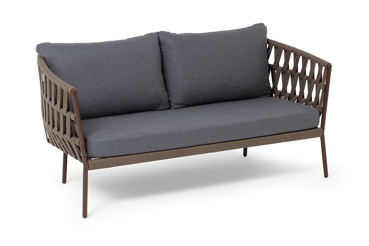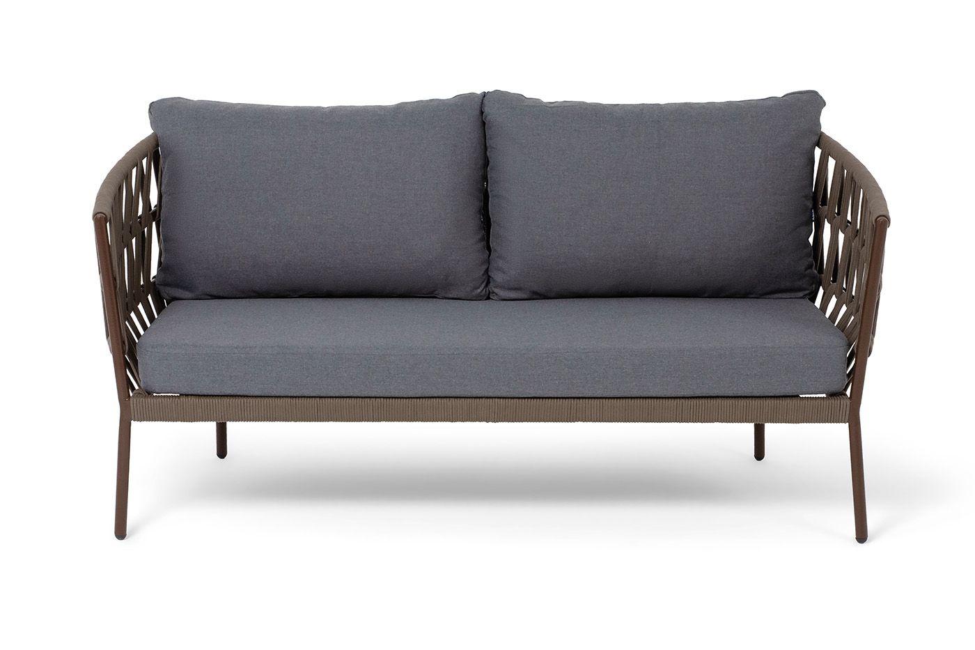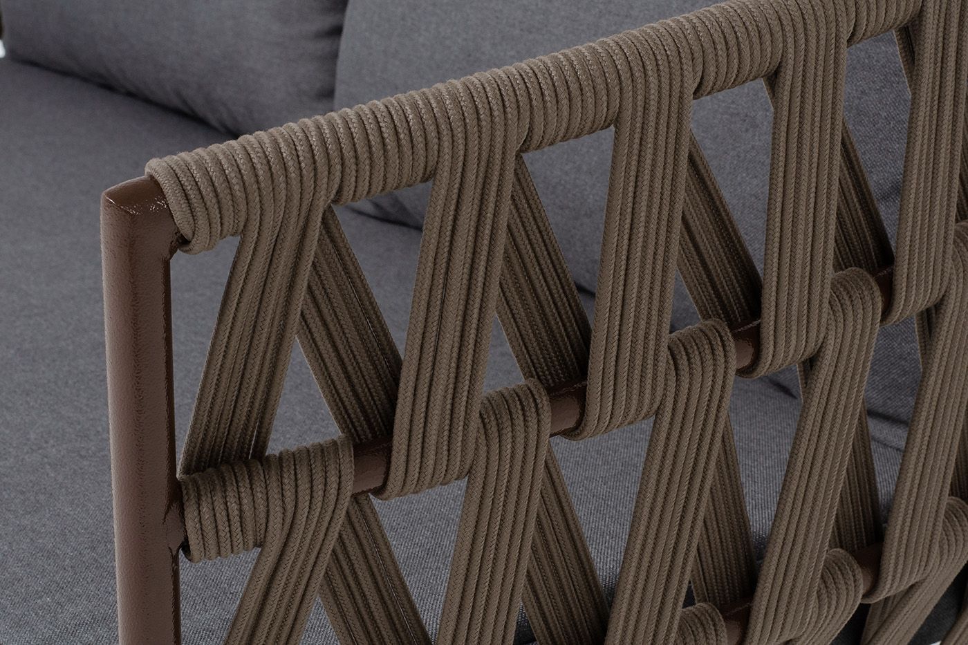 Диван имеет алюминиевый каркас, окрашенный порошковой краской в коричневый (RAL8016) цвет. Боковины каркаса и спинка вручную оплетены роупом - эластичными синтетическими лентами, изготовленными из высокопрочных полиэфирных волокон. Цвет оплетки - коричневый.