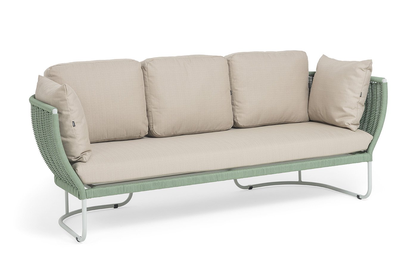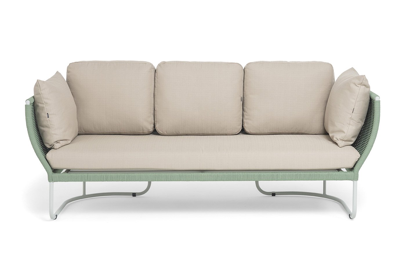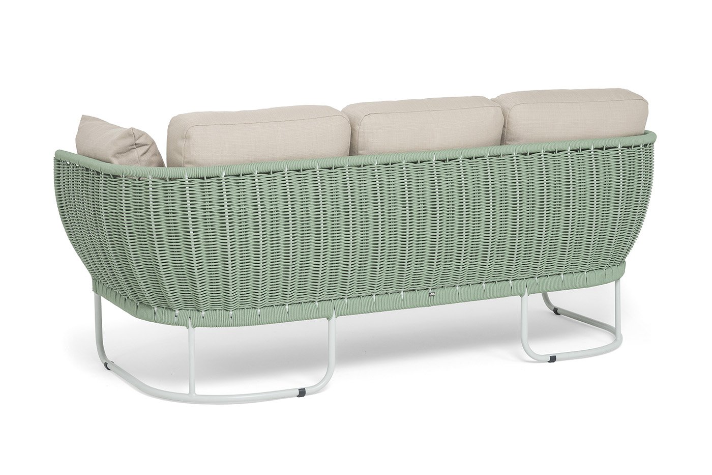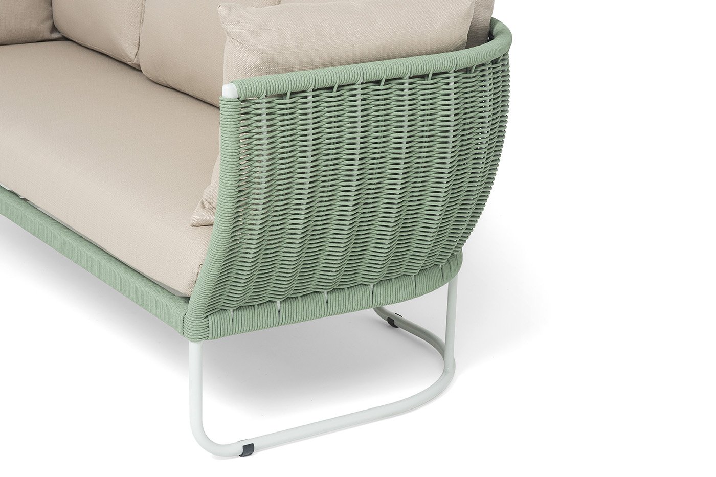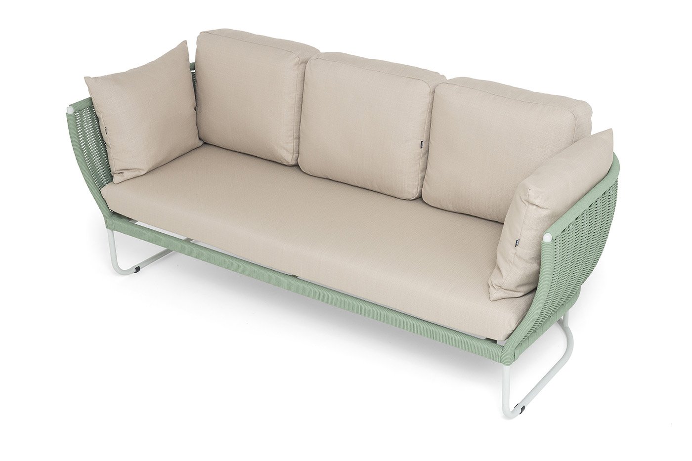 Каркас дивана выполнен из алюминия, окрашенного порошковой краской светло-серого (RAL7035) цвет. Легкость металла не уступает в прочности — конструкция устойчива к ежедневным нагрузкам и сохраняет форму годами.