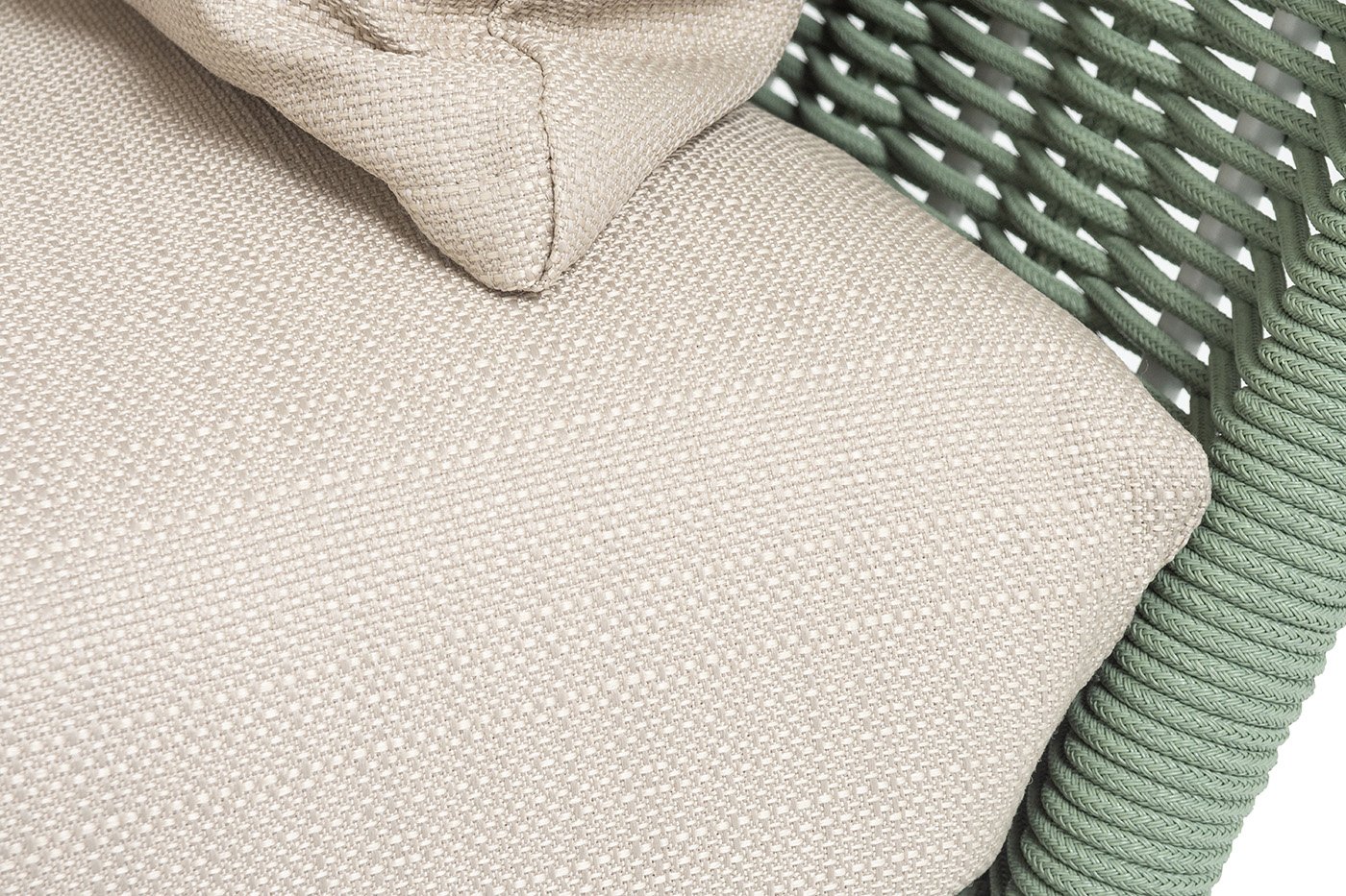 В комплект входят мягкие подушки с плотным наполнителем и съемными чехлами. Материал чехлов — Mossle бежевого оттенка, обработанный влагоотталкивающей пропиткой.