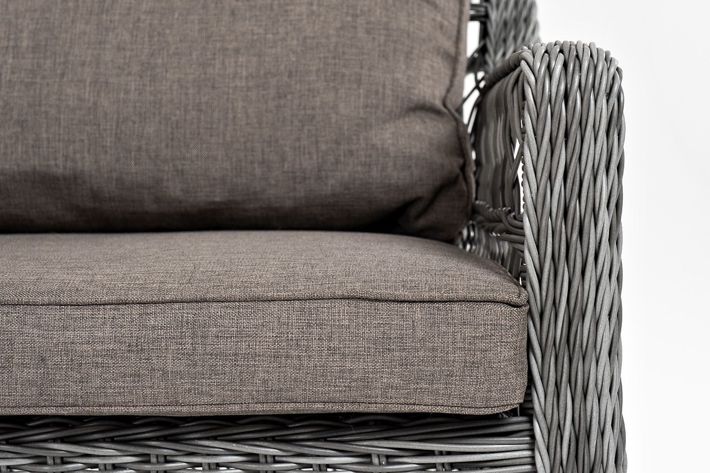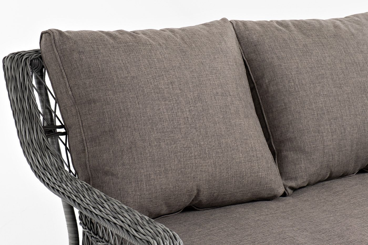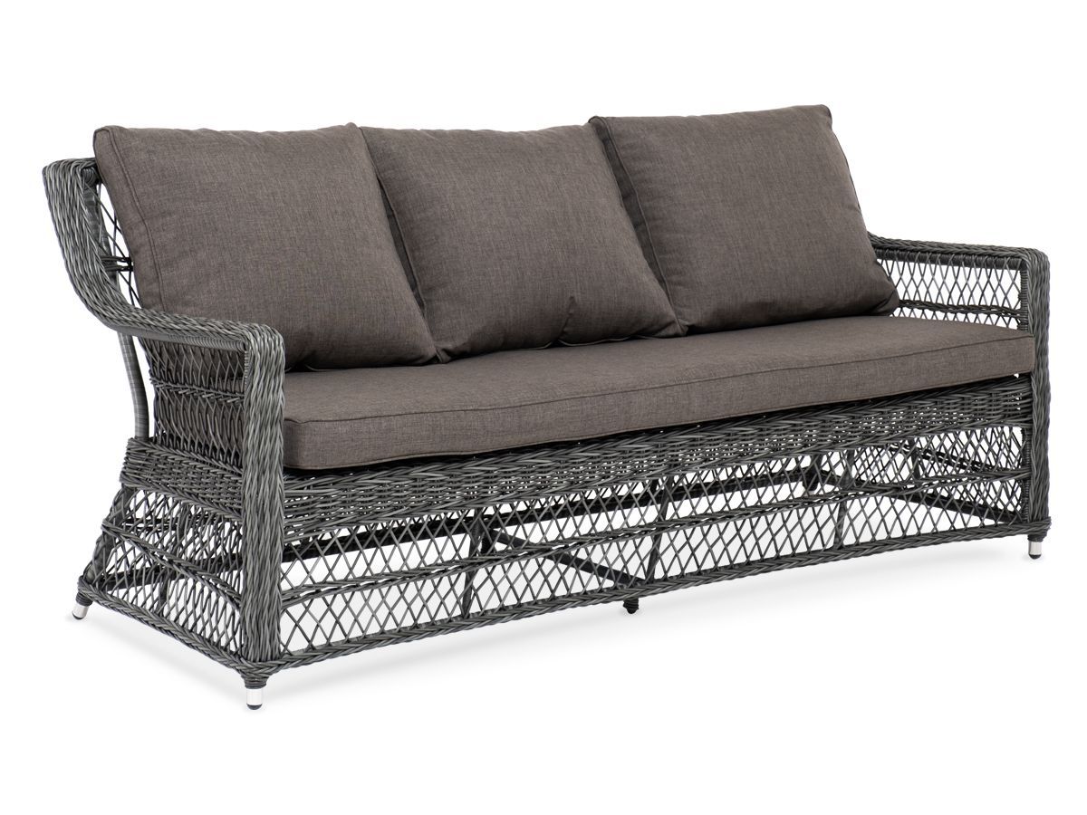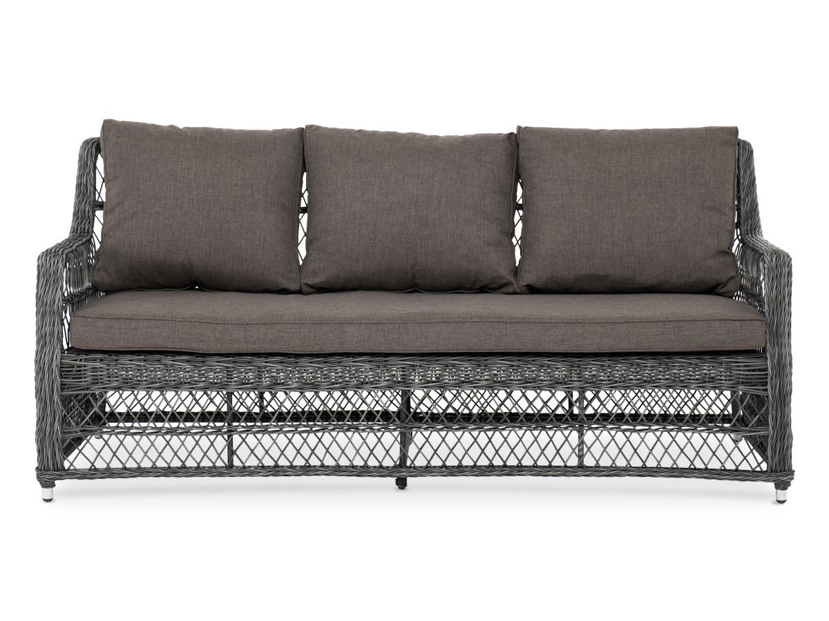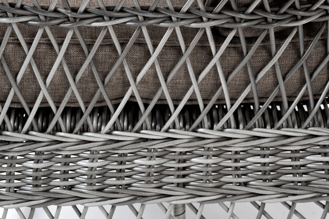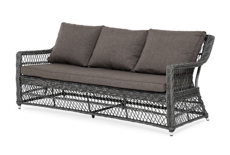 Модель выполнена с помощью ручного круглого плетения из искусственного ротанга. Трехместный диван представлен в графитовом цвете.