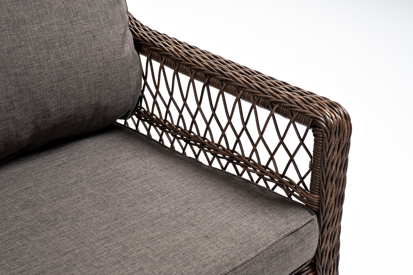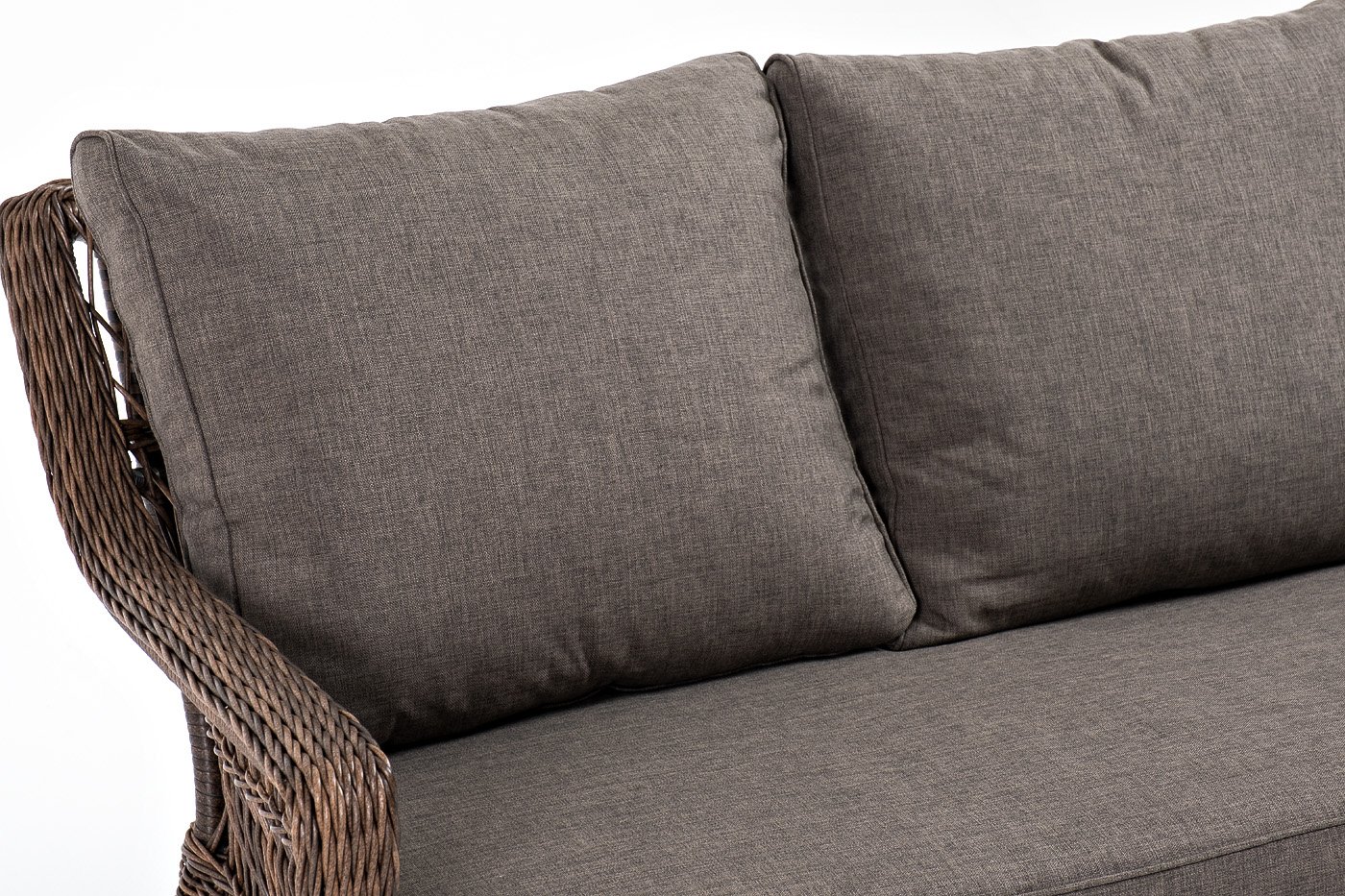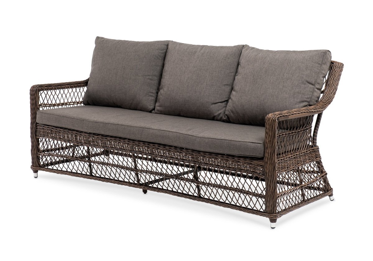 Модель выполнена с помощью ручного круглого плетения из искусственного ротанга. Трехместный диван представлен в коричневом цвете.