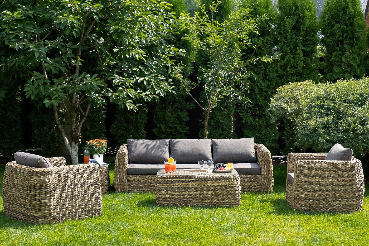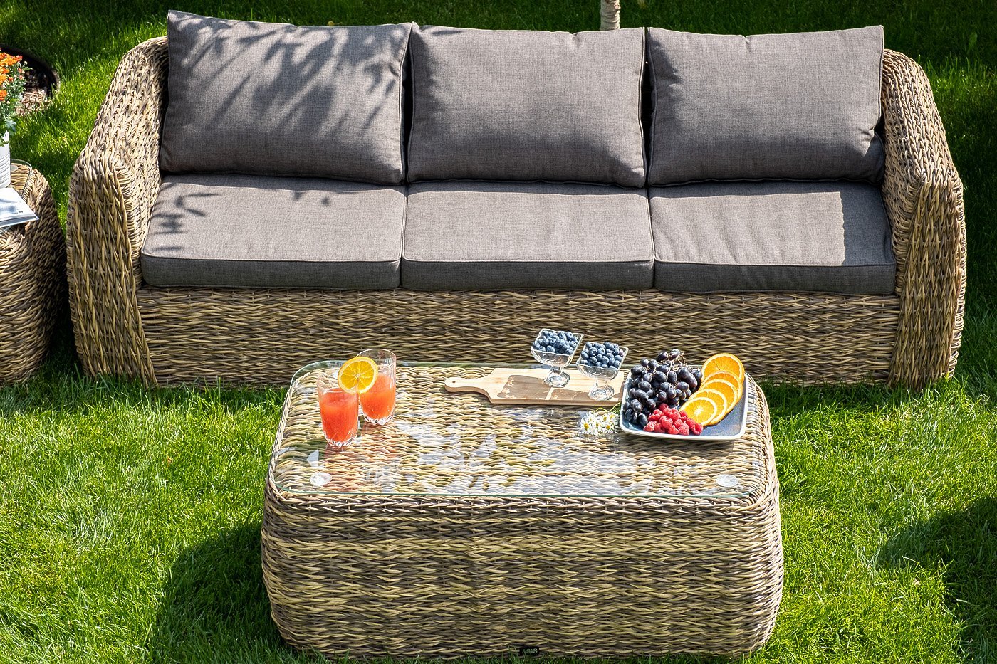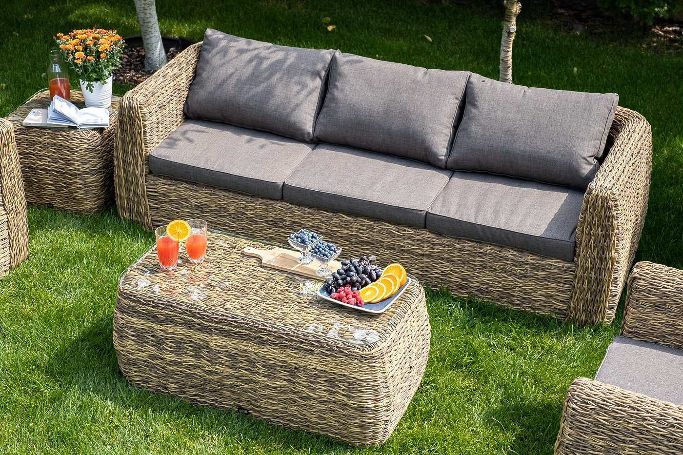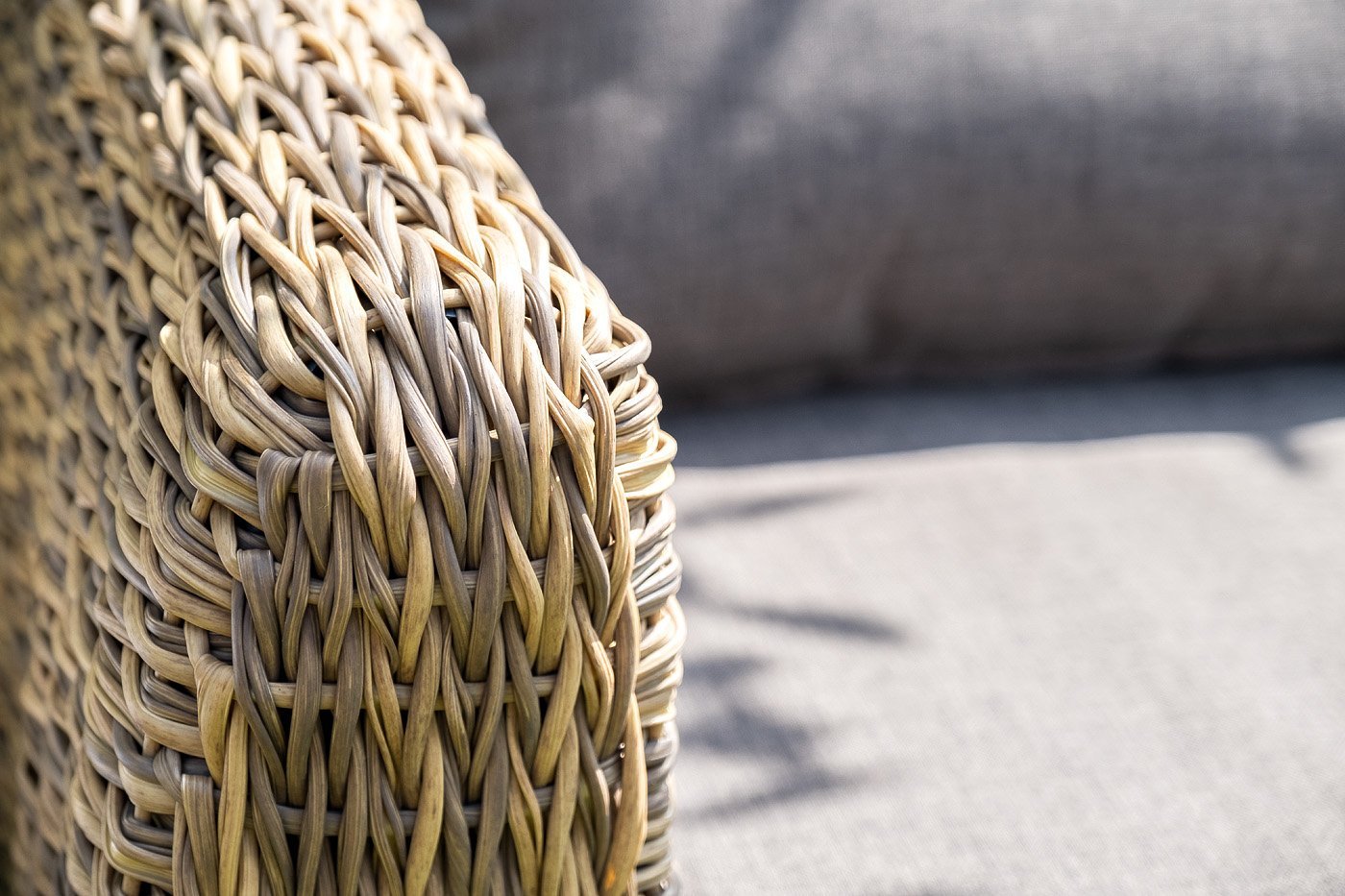 Ручное круглое плетение является основным декоративным элементом мебели. Оно выполнено из искусственного ротанга вида «гиацинт» в соломенном цвете.