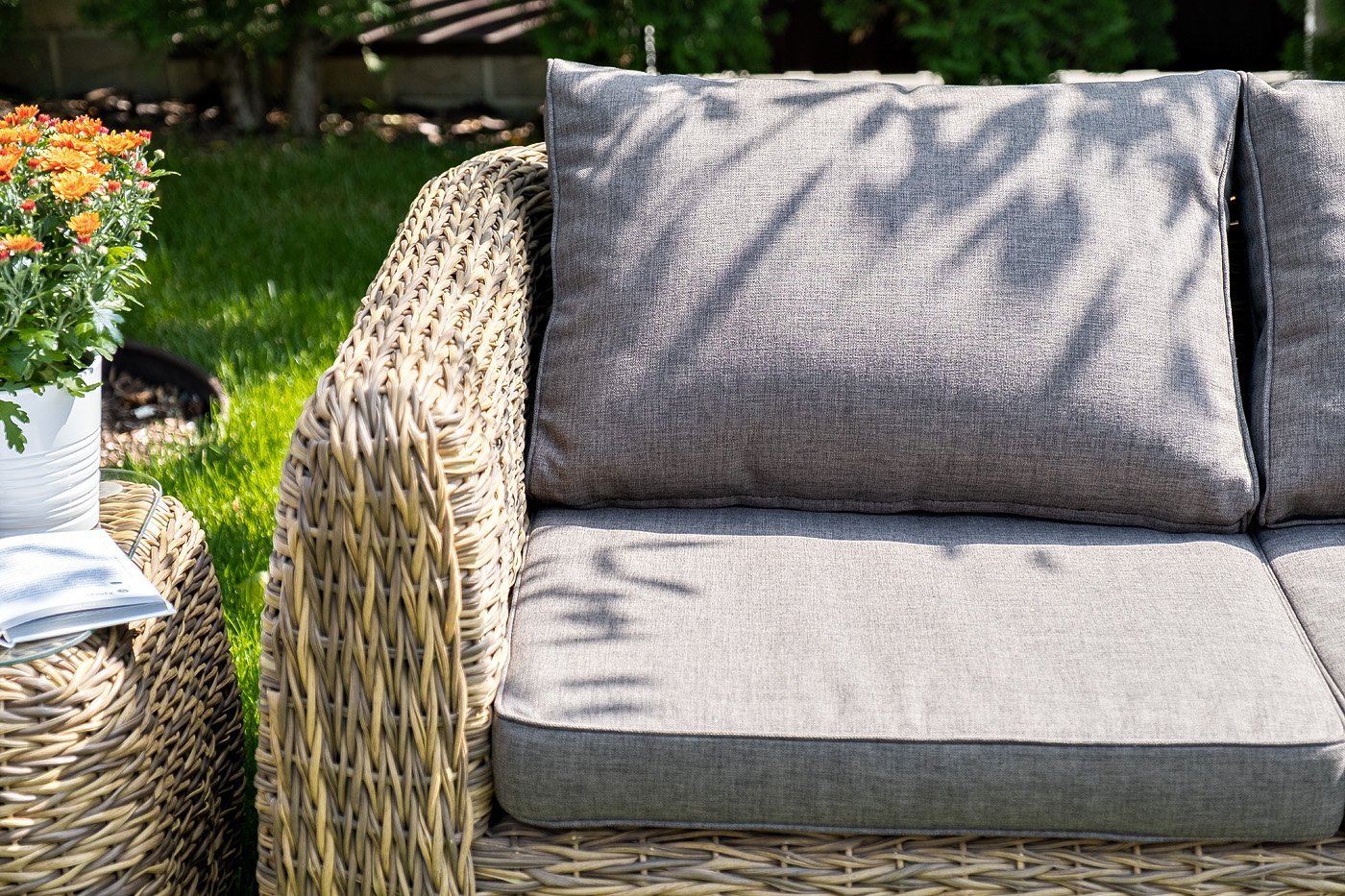 В комплекте с трехместным диваном идут мягкие подушки для комфортного расположения. Чехлы съёмные серо-коричневого цвета из высококлассного полиэстера с плотностью 230гр/м2. Защитные свойства ткани усиливаются при помощи влагоотталкивающей пропитки.