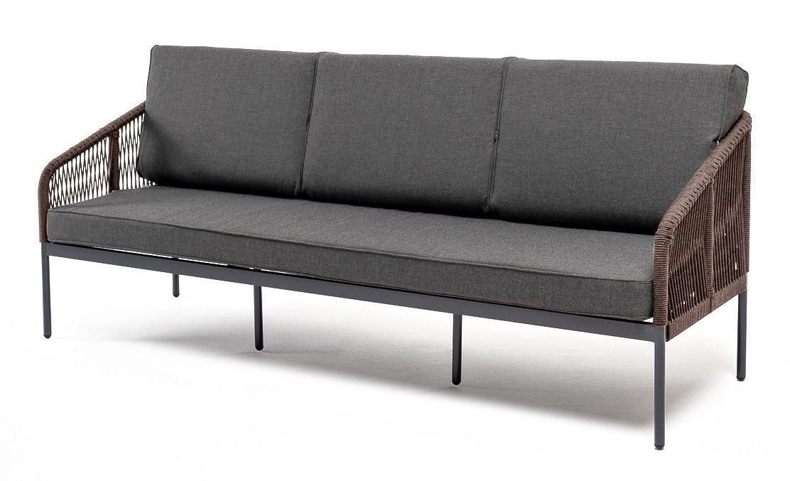 Диван имеет алюминиевый каркас, окрашенный порошковой краской в темно-серый (RAL7024) цвет. Боковины каркаса и спинка вручную оплетены роупом - эластичными синтетическими лентами, изготовленными из высокопрочных полиэфирных волокон. Цвет оплетки в тон каркасу - коричневый.