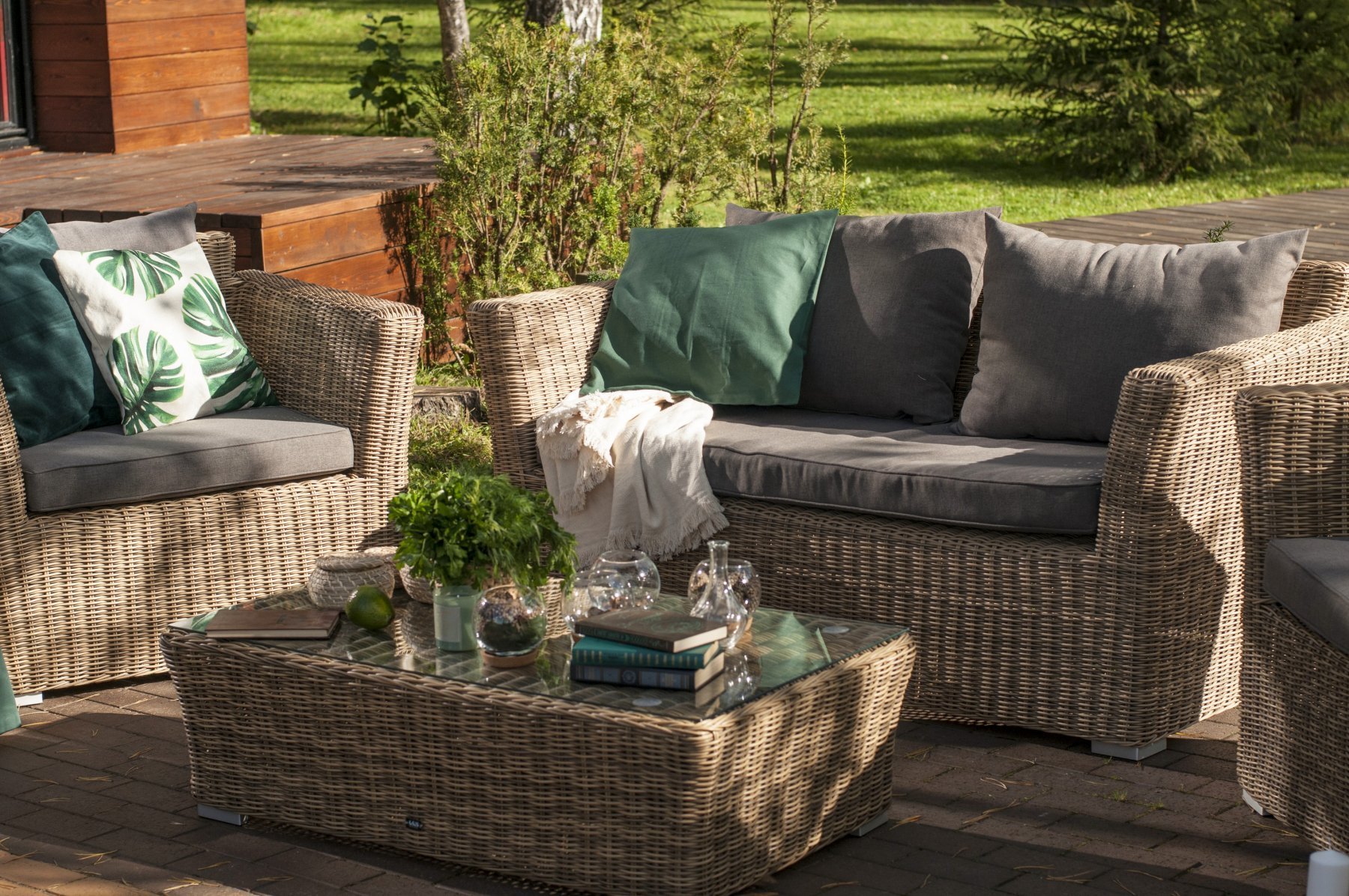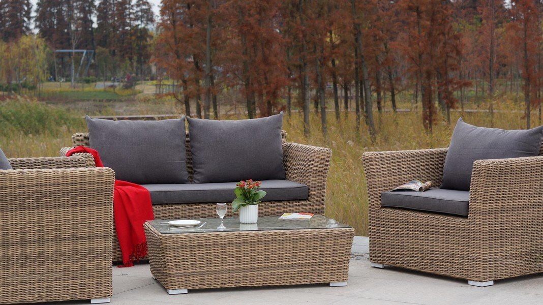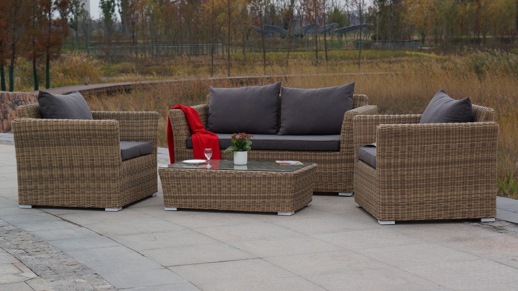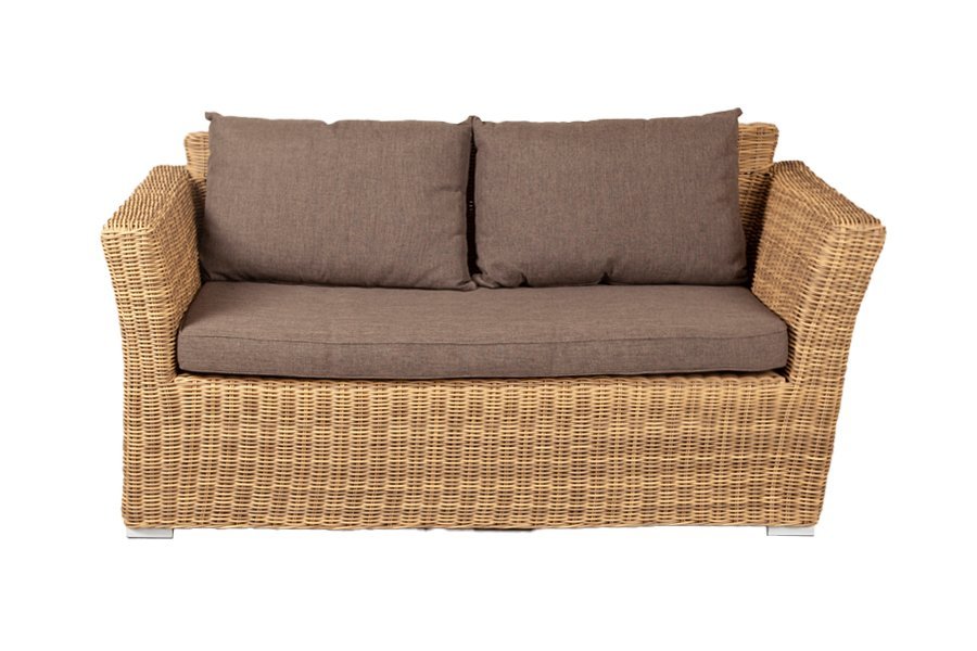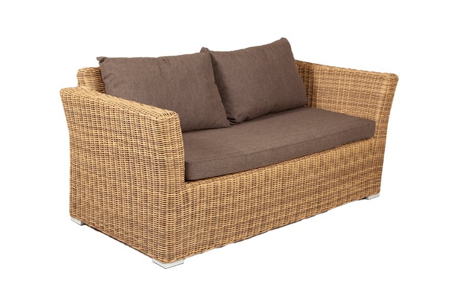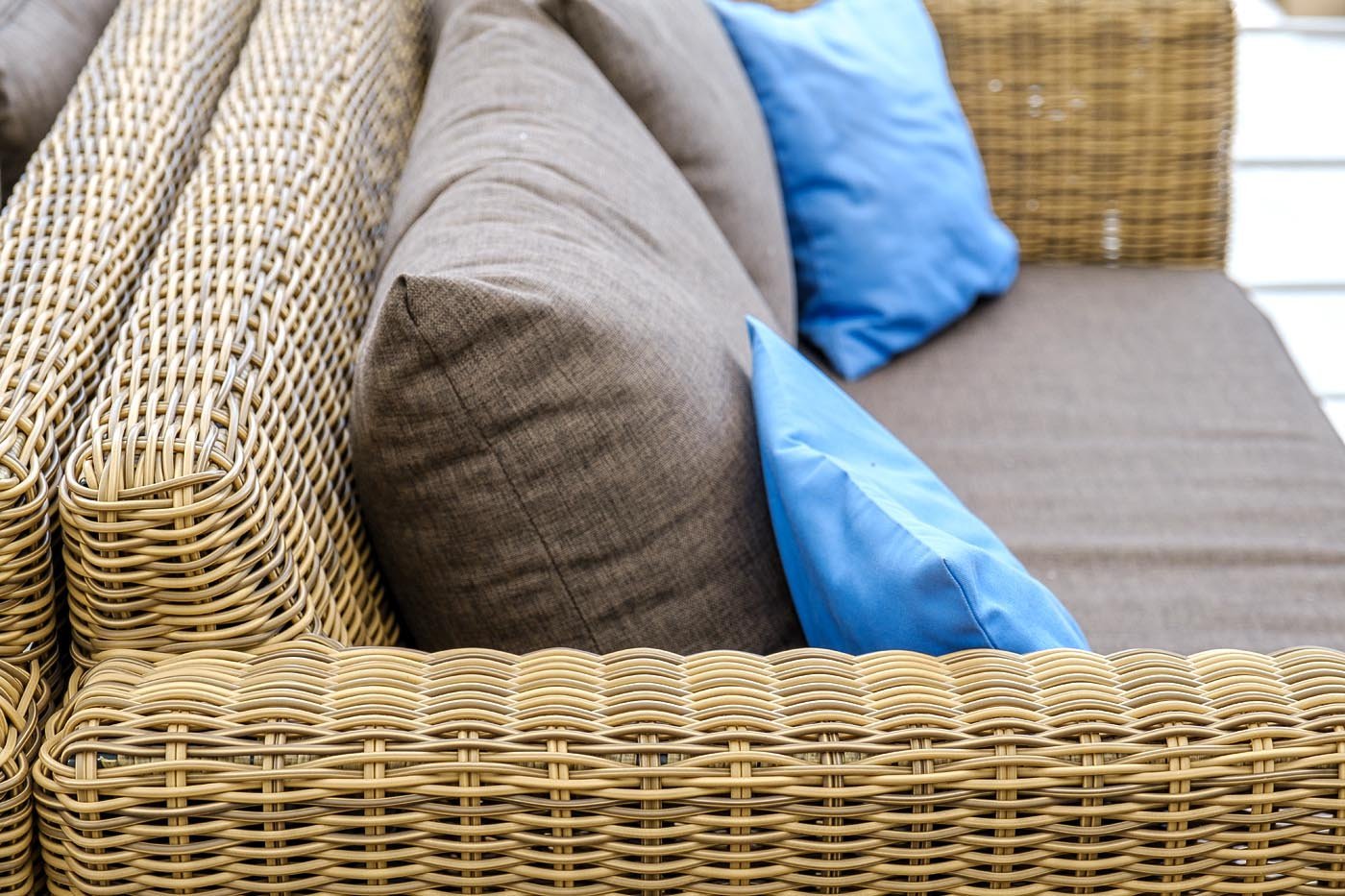 Диван выполнен из круглого искусственного ротанга соломенного цвета, оплетенного вручную.