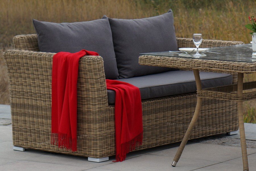Диван выполнен из круглого искусственного ротанга соломенного цвета, оплетенного вручную.