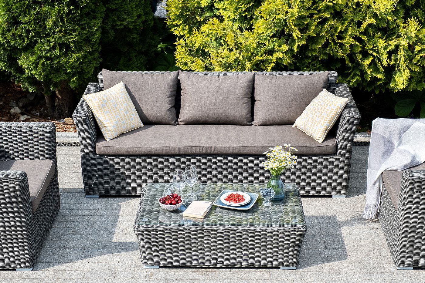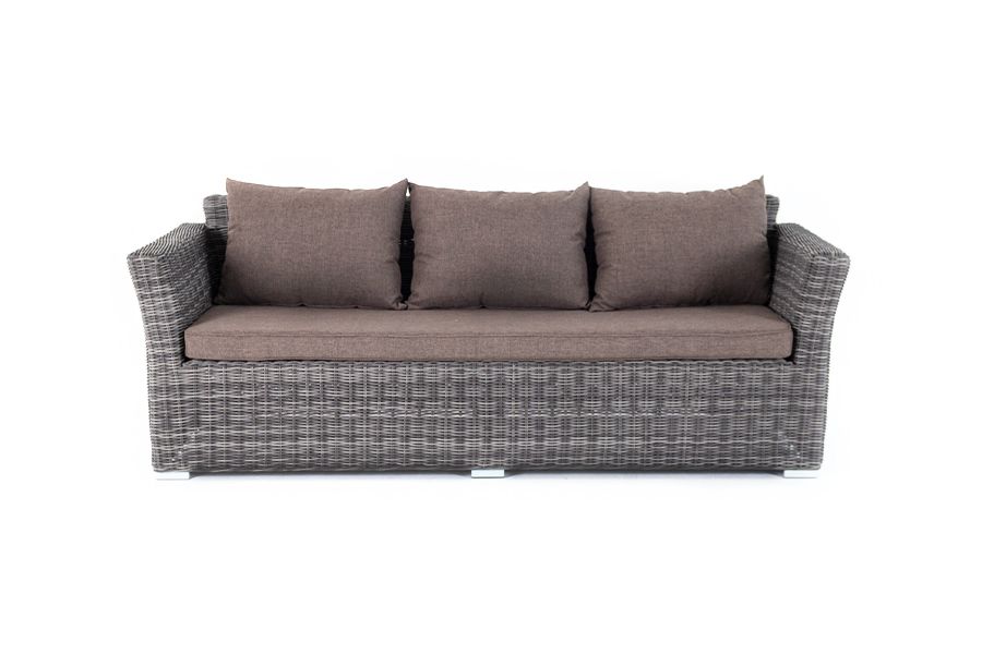 Размеры модели: 2220×865×815 мм, которые позволяют разместить трех человек. Подушки, входящие в комплект, выполнены из высококачественного полиэстера с влагоотталкивающей пропиткой.