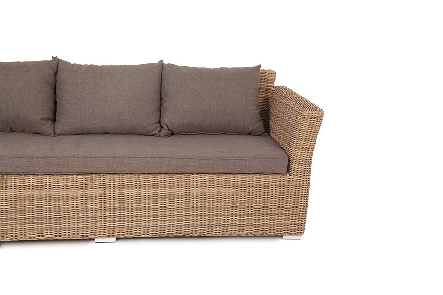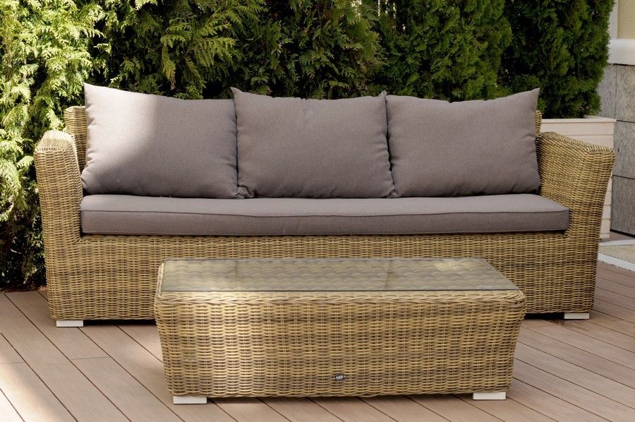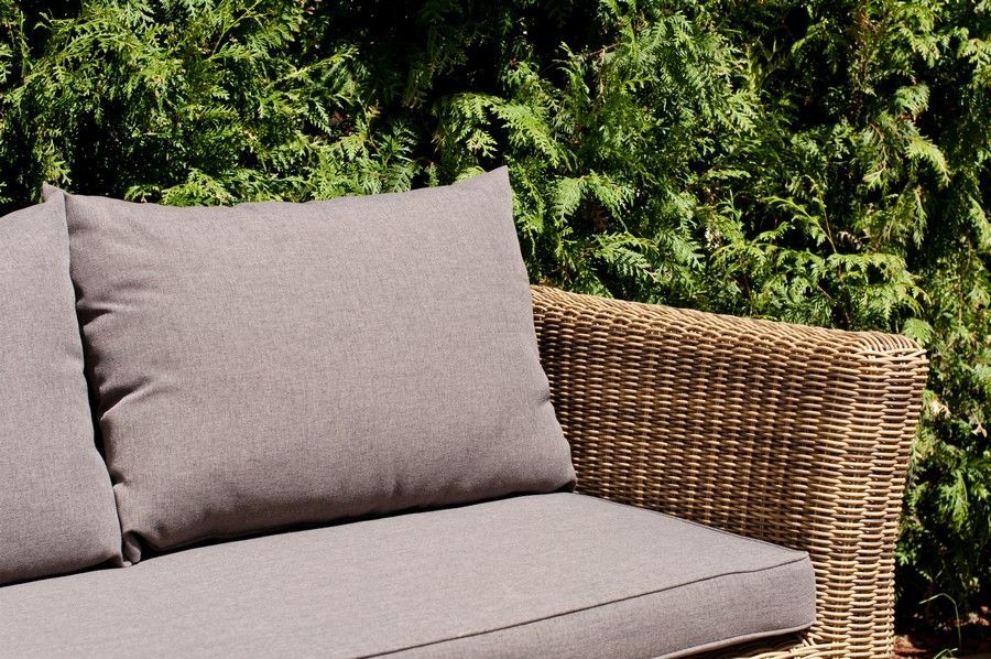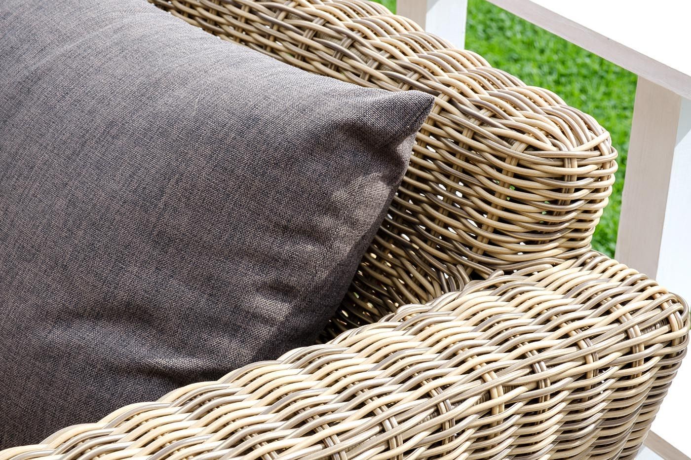 Мебель декорирована ручным круглым плетением, выполненным из искусственного ротанга соломенного цвета.