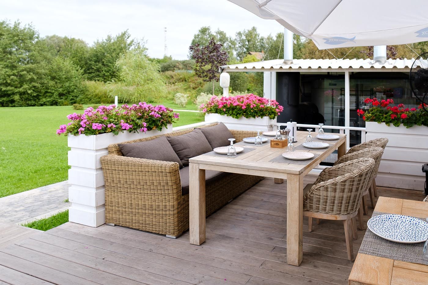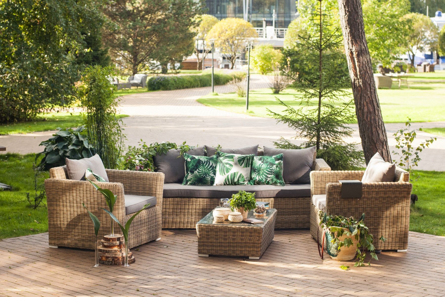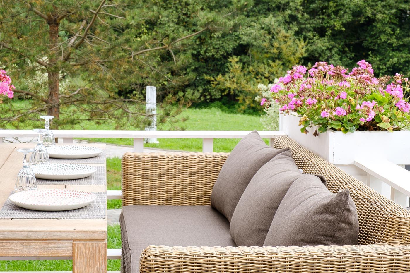 Мебель декорирована ручным круглым плетением, выполненным из искусственного ротанга соломенного цвета.