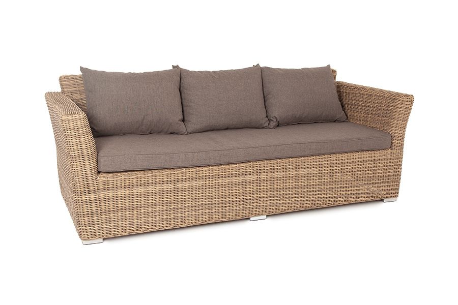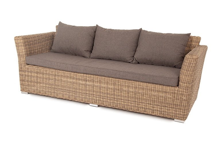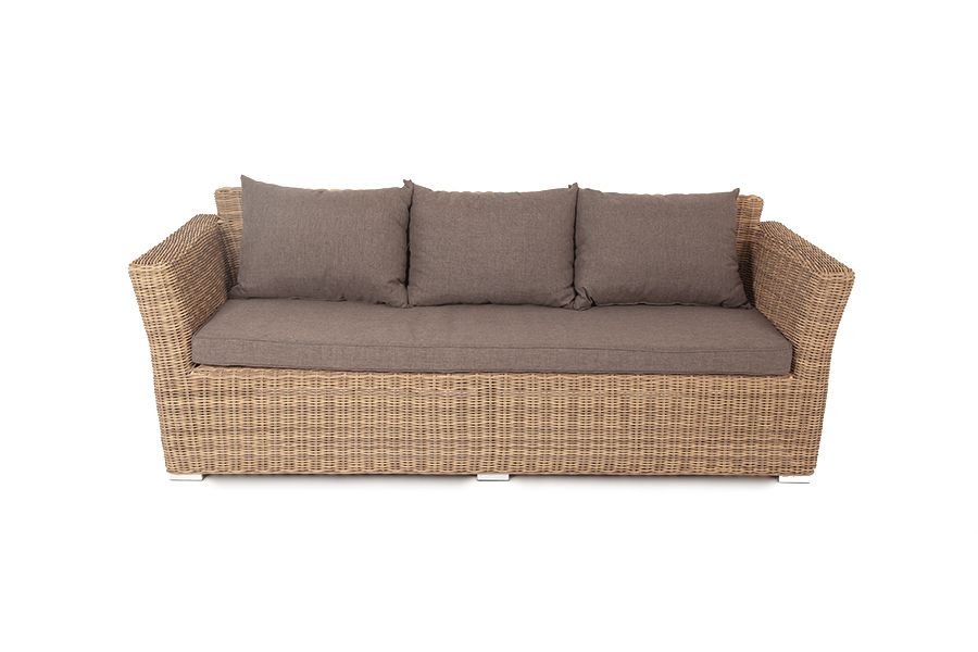 Трехместный диван укомплектован мягкими подушками, которые защищены съёмными чехлами в серо-коричневом оттенке. При их пошиве используется износостойкий полиэстер, плотность которого достигает 230гр/м2. Предусмотрена влагоотталкивающая пропитка.
