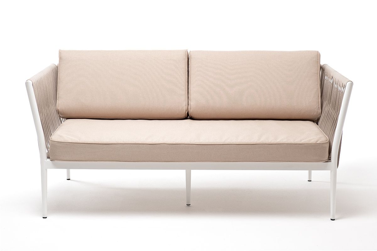 Диван имеет алюминиевый каркас, окрашенный порошковой краской в светло-серый (RAL7035) цвет. Боковины каркаса вручную оплетены роупом - эластичными синтетическими лентами, изготовленными из высокопрочных полиэфирных волокон. Цвет оплетки - серо-коричневый.