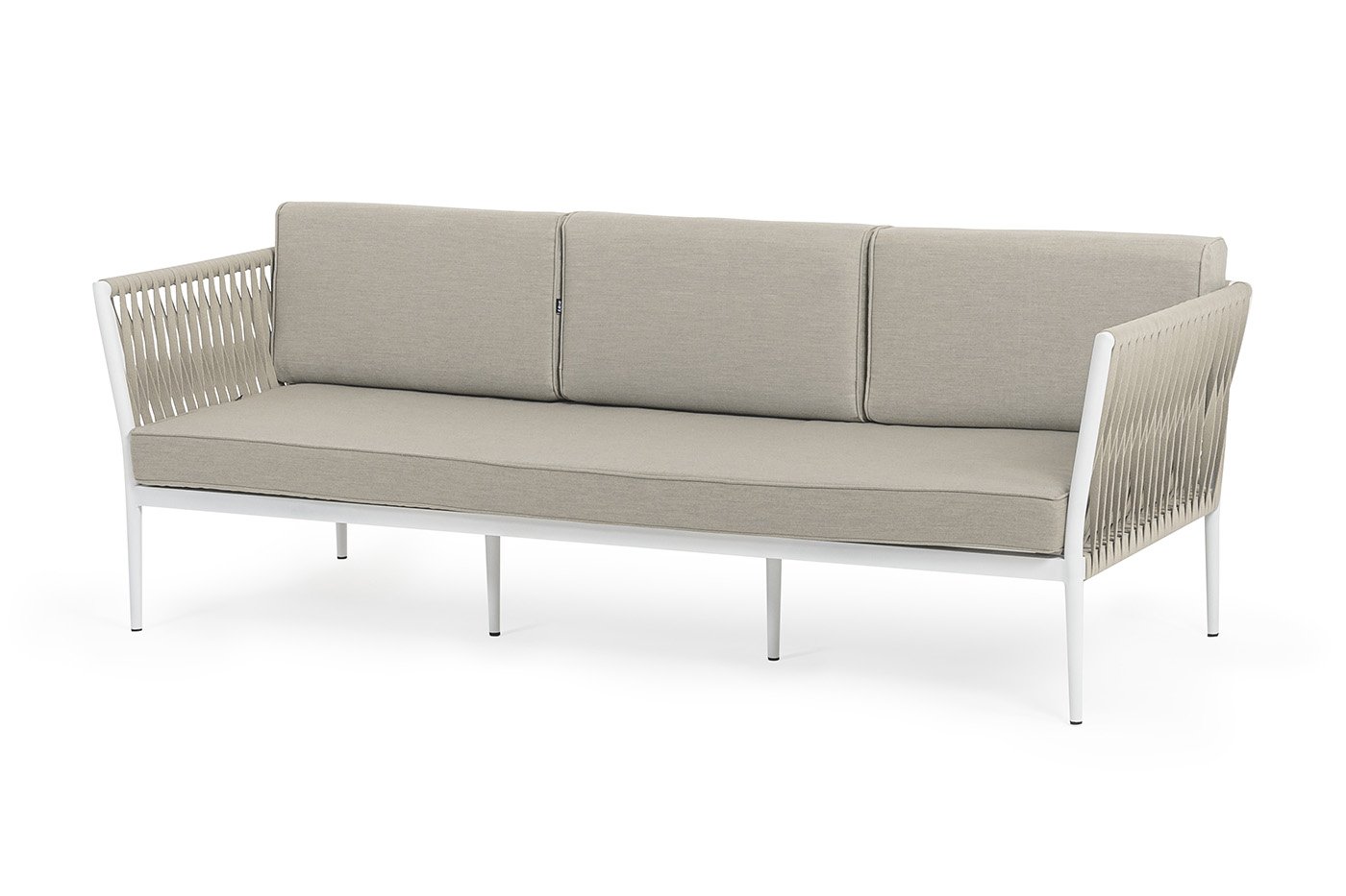 Диван имеет алюминиевый каркас, окрашенный порошковой краской в белый цвет. Боковины каркаса вручную оплетены роупом - эластичными синтетическими лентами, изготовленными из высокопрочных полиэфирных волокон. Цвет оплетки - бежевый.