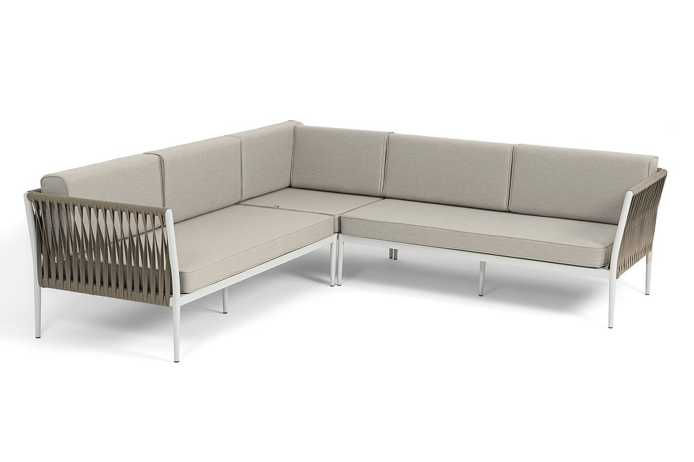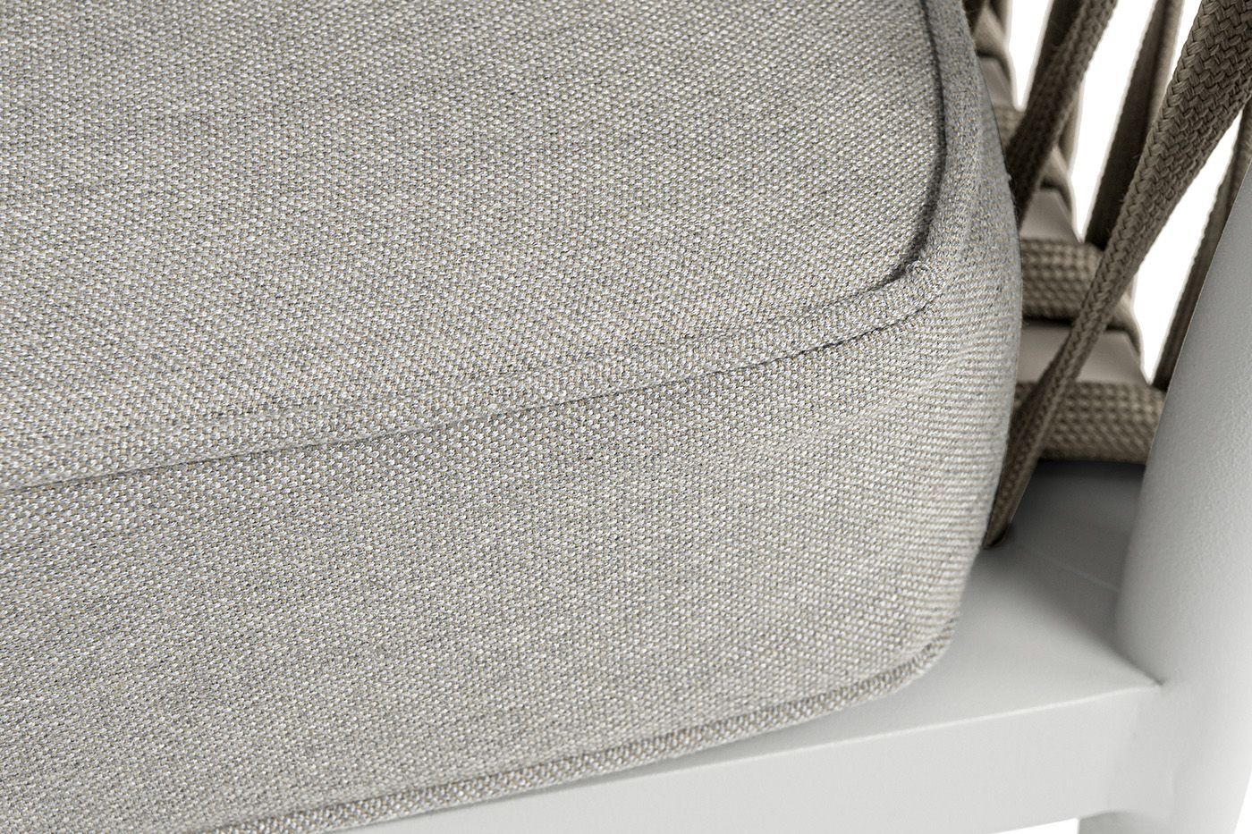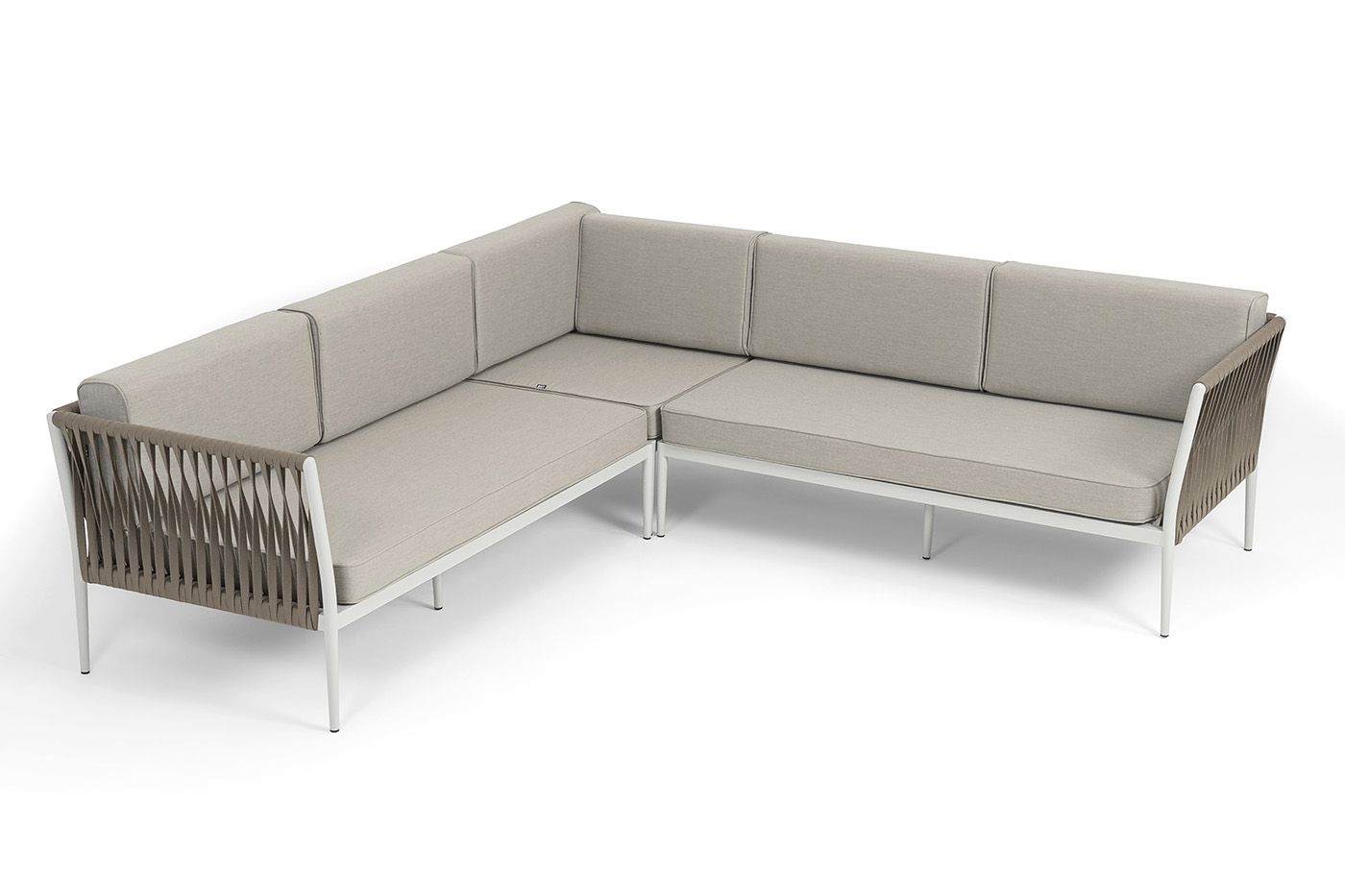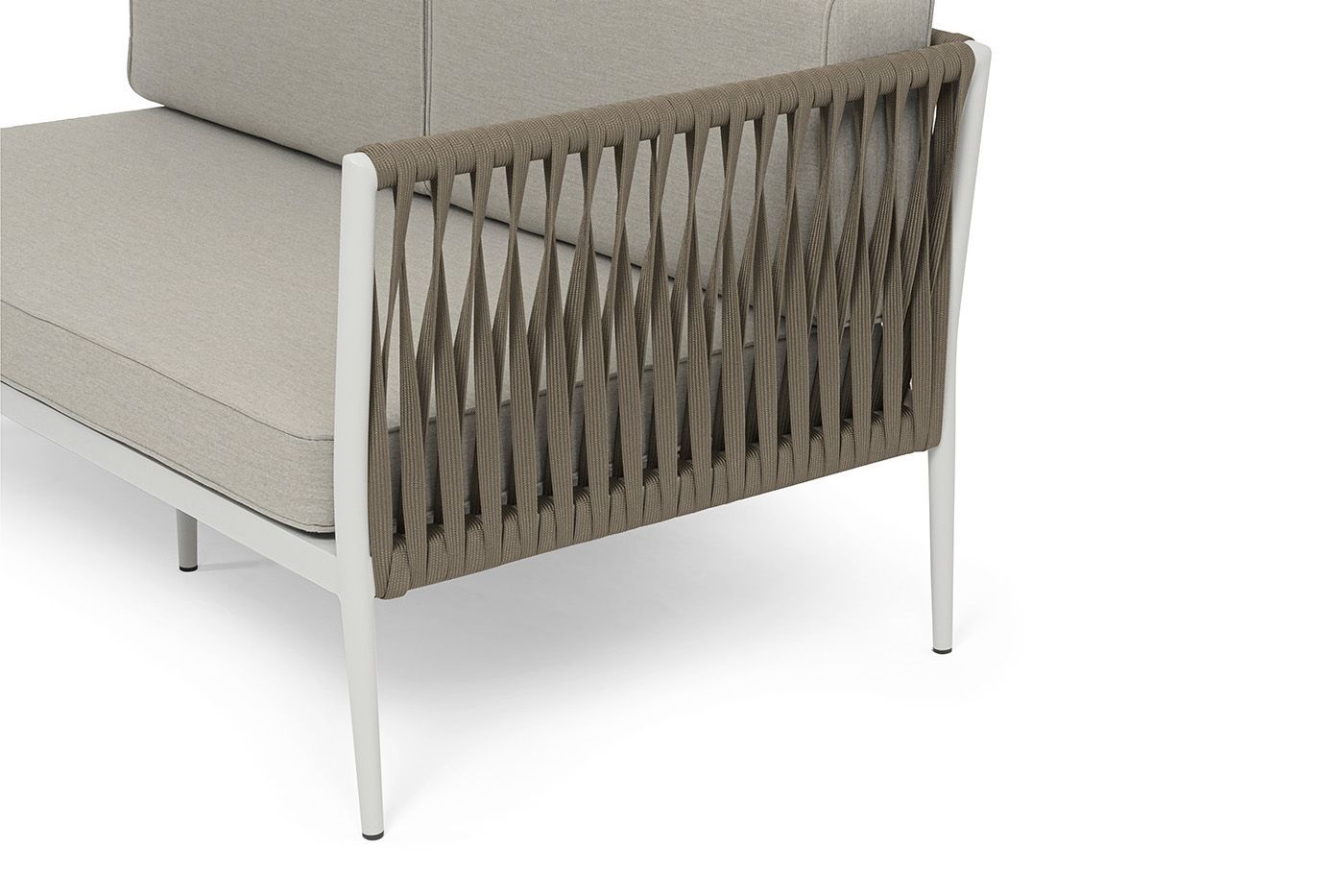 Диван имеет алюминиевый каркас, окрашенный порошковой краской в светло-серый (RAL7035) цвет. Боковины каркаса вручную оплетены плоским роупом - эластичными синтетическими лентами, изготовленными из высокопрочных полиэфирных волокон. Цвет оплетки - серо-коричневый.