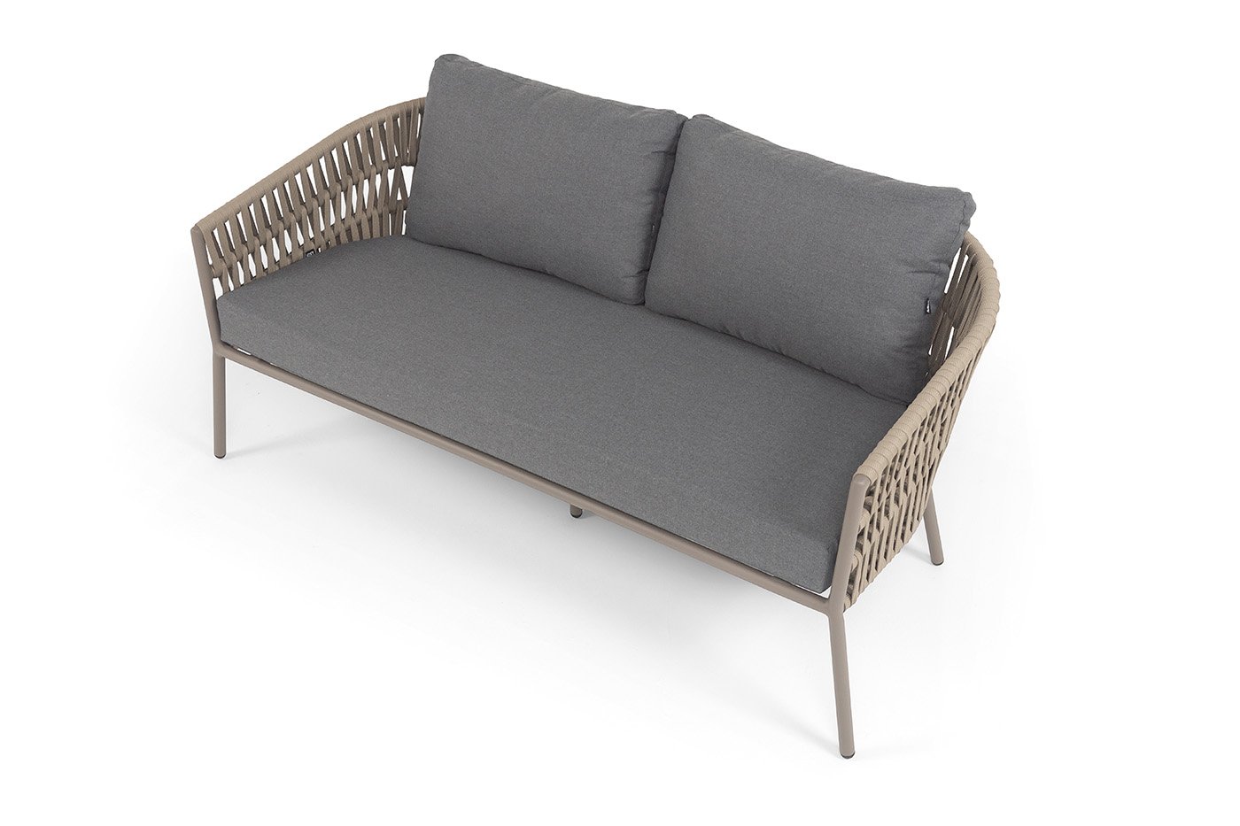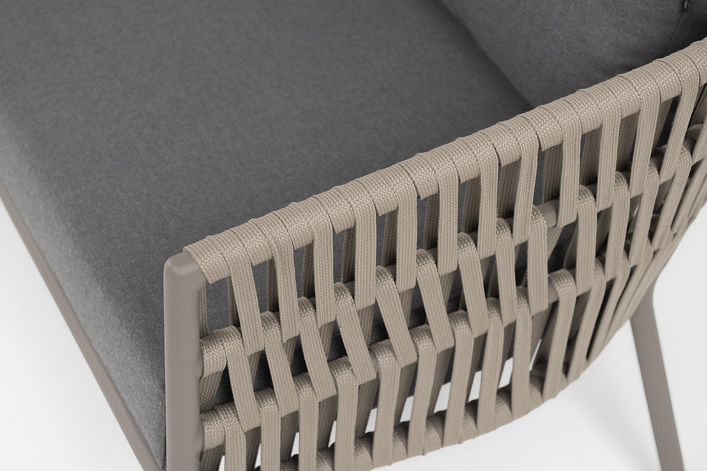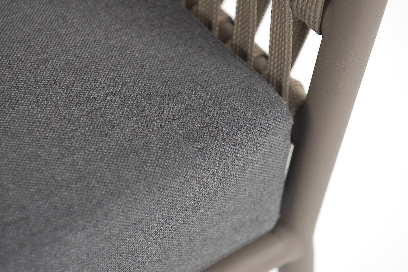 Синтетические ленты, изготовленные из высокопрочных полиэфирных волокон, образуют сложный узор, который притягивает взгляд. Серо-коричневый цвет плетения гармонично сочетается с цветом каркаса, создавая целостн