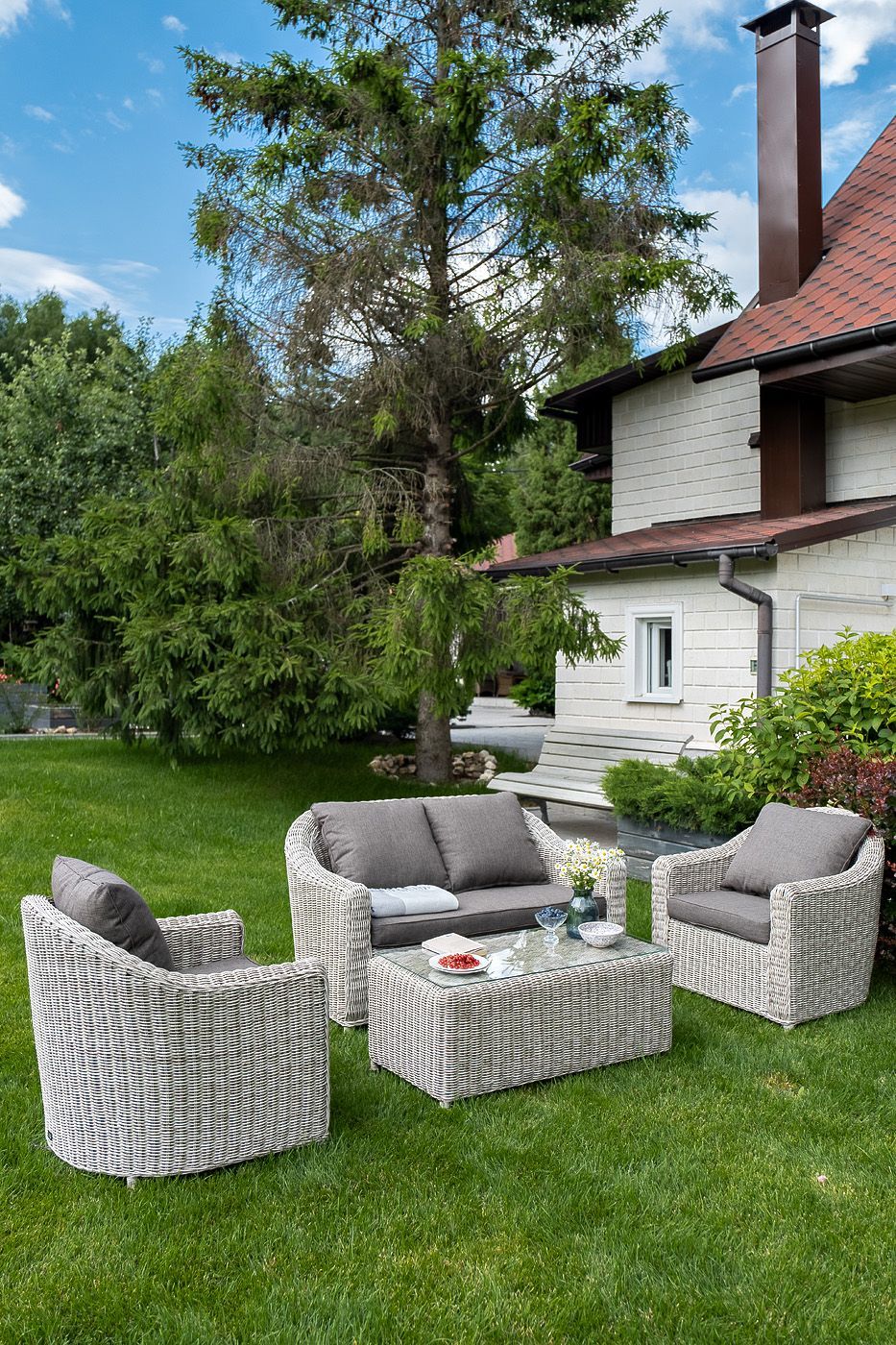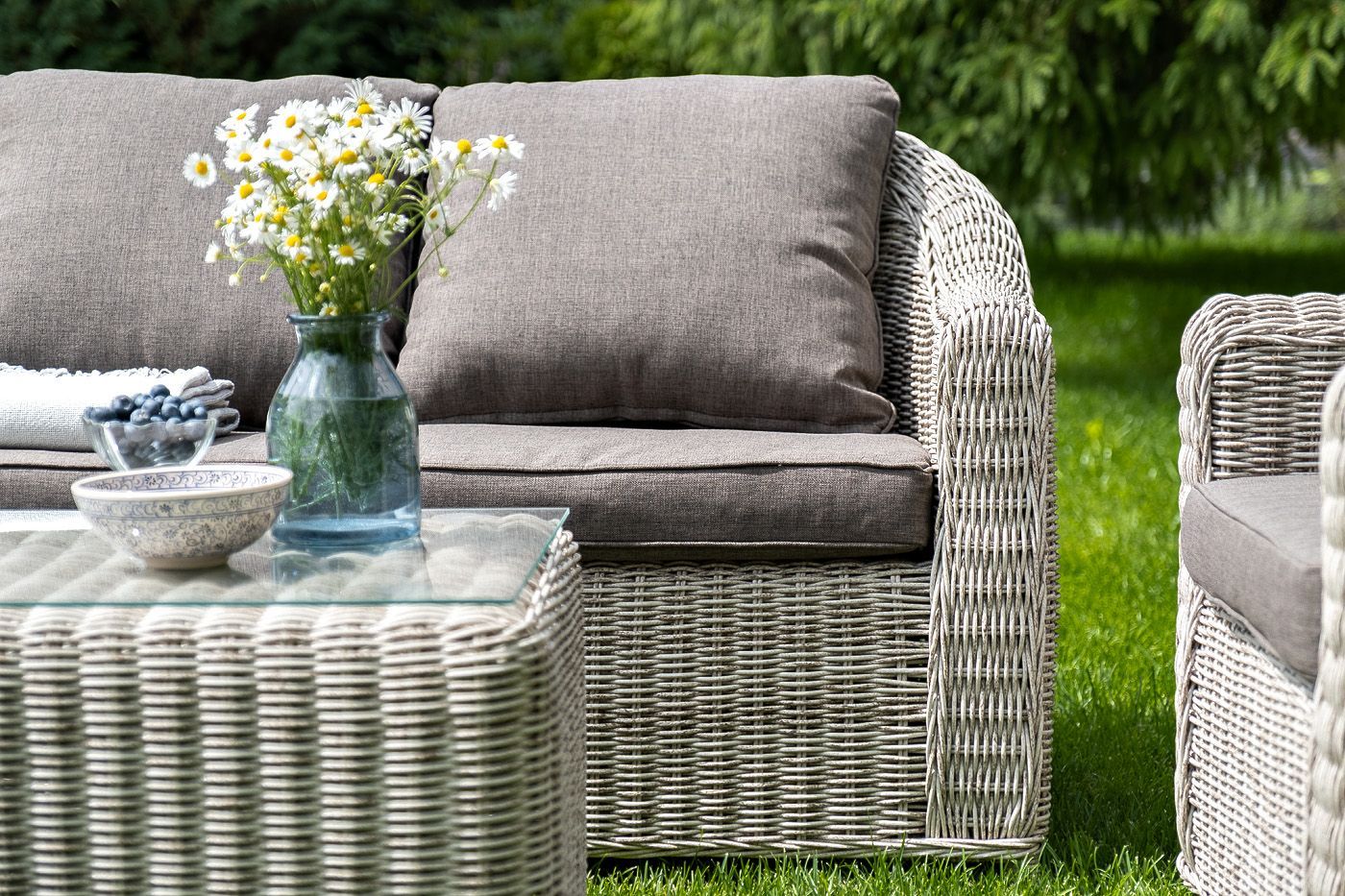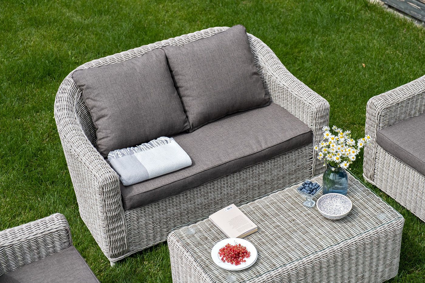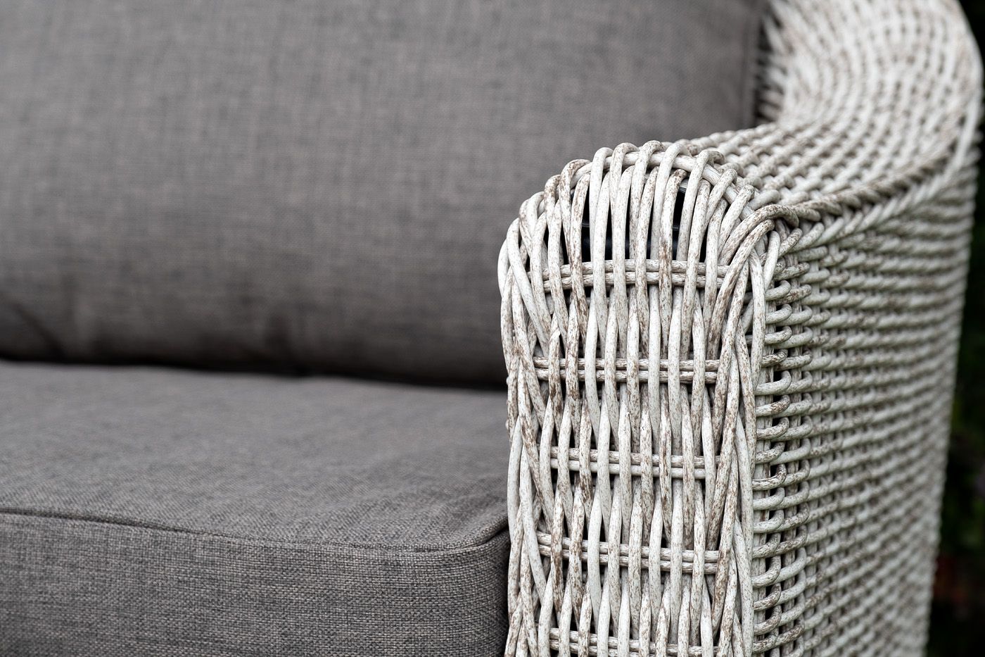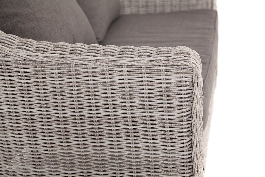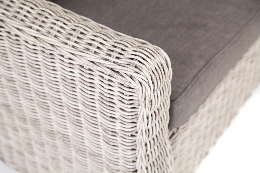 При производстве садового дивана был использован прочный алюминиевый каркас, который оплетен вручную круглым искусственным ротангом.