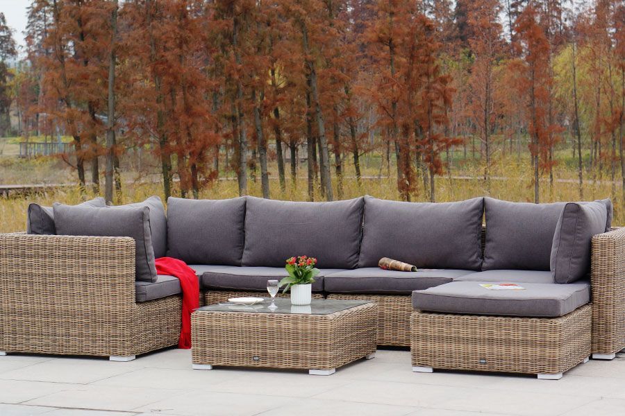 Комплект выполнен из круглого искусственного ротанга ручного плетения. Представлена в соломенном цвете.