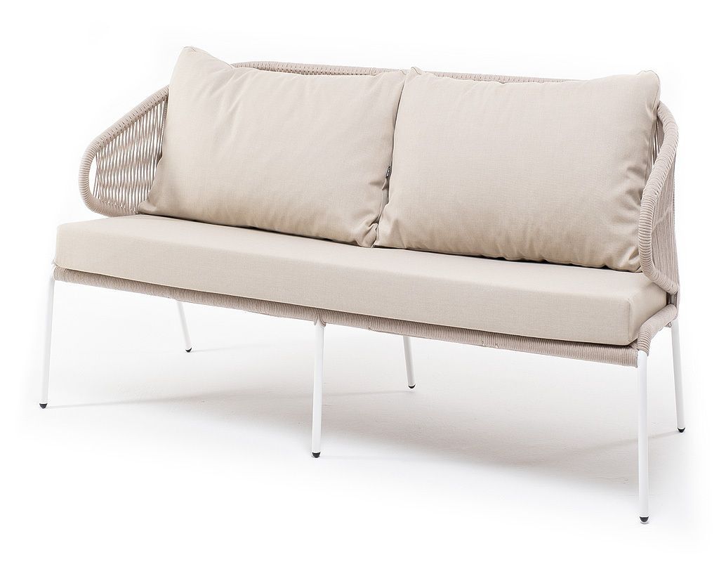 Диван имеет алюминиевый каркас, окрашенный порошковой краской в белый цвет. Боковины каркаса и спинка вручную оплетены роупом - эластичными синтетическими лентами, изготовленными из высокопрочных полиэфирных волокон. Цвет оплетки – бежевый.