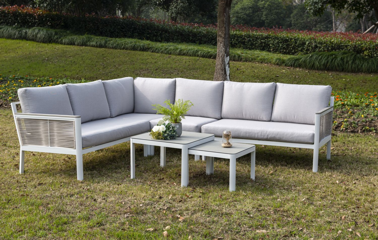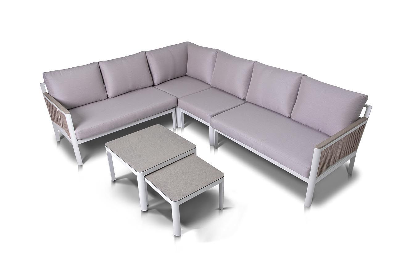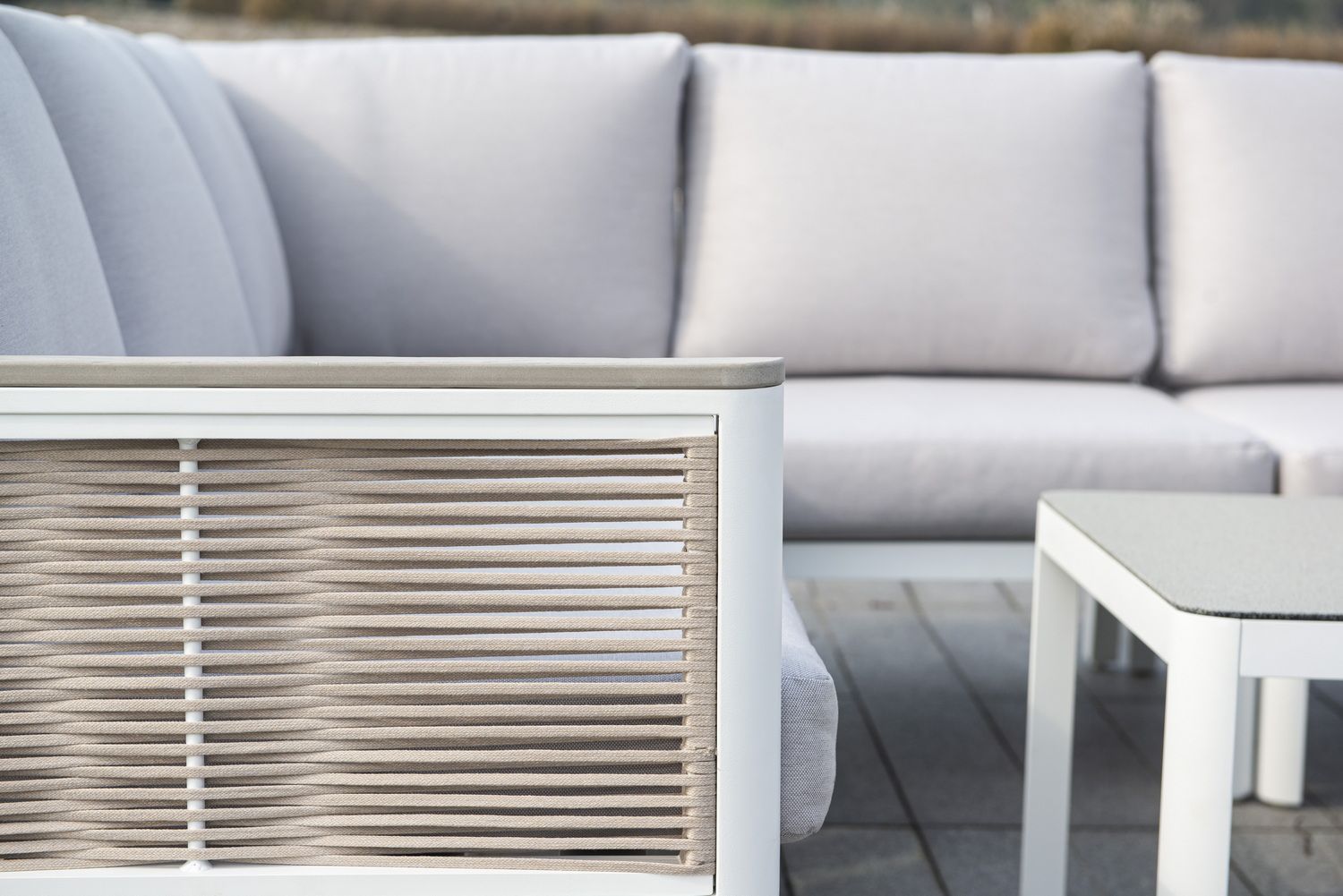 Диван можно трансформировать под нужный размер и расположение. Состоит из алюминиевого каркаса белого цвета, который дополняет бежевая оплетка из эластичных синтетических лент, состоящих из высокопрочных полиэфирных волокон.