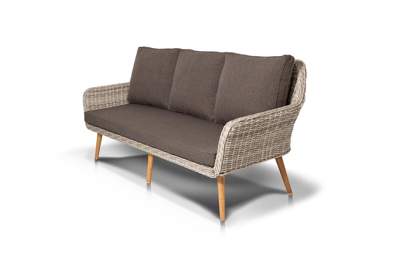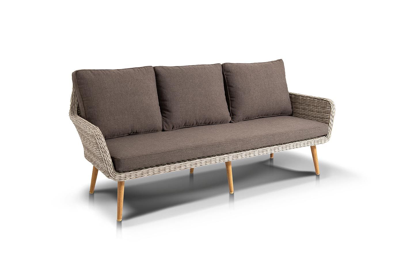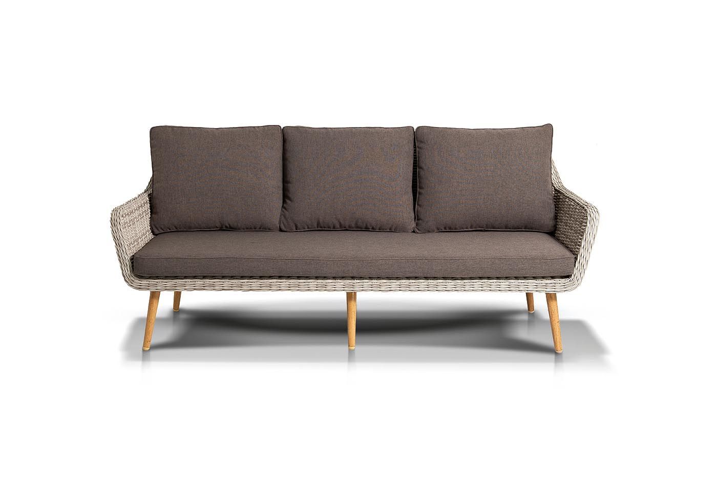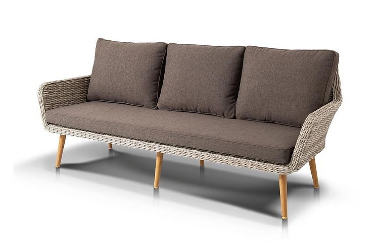 Трехместный диван дополняют мягкие подушки в серо-коричневом цвете со съёмными чехлами. Тканевые изделия выполнены из прочного полиэстера плотностью 230гр/м2. Материал имеет влагоотталкивающую пропитку.