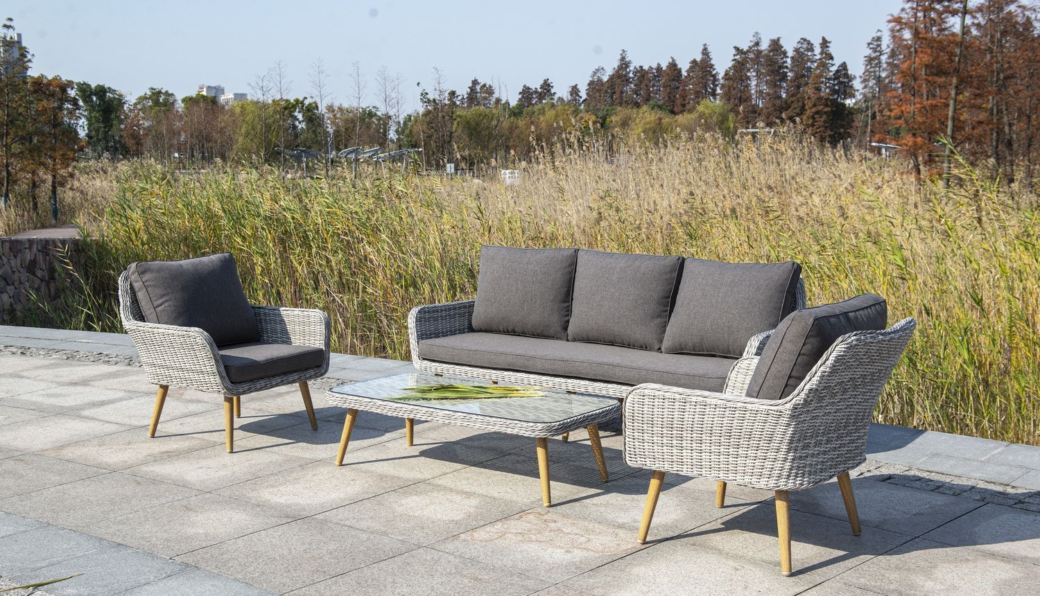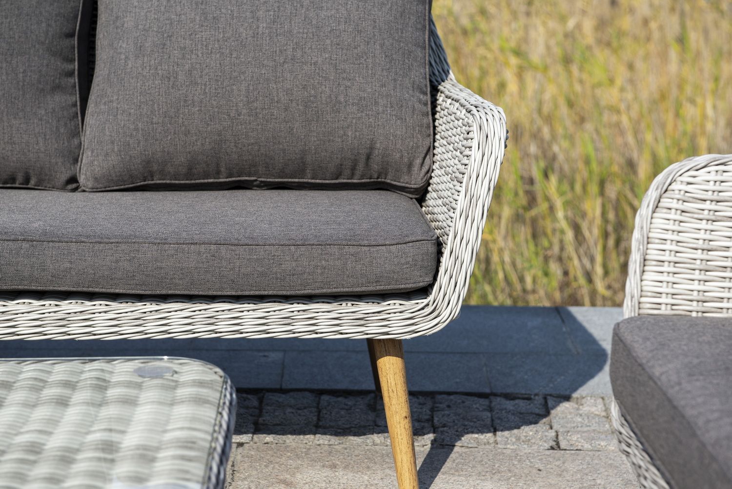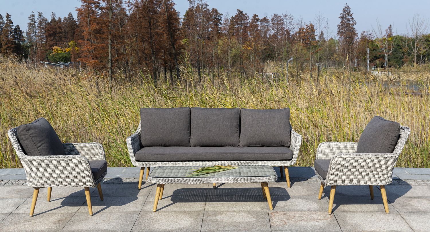 Трехместный диван дополняют мягкие подушки в серо-коричневом цвете со съёмными чехлами. Тканевые изделия выполнены из прочного полиэстера плотностью 230гр/м2. Материал имеет влагоотталкивающую пропитку.