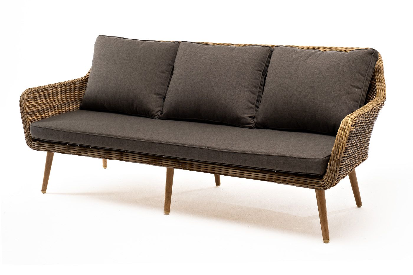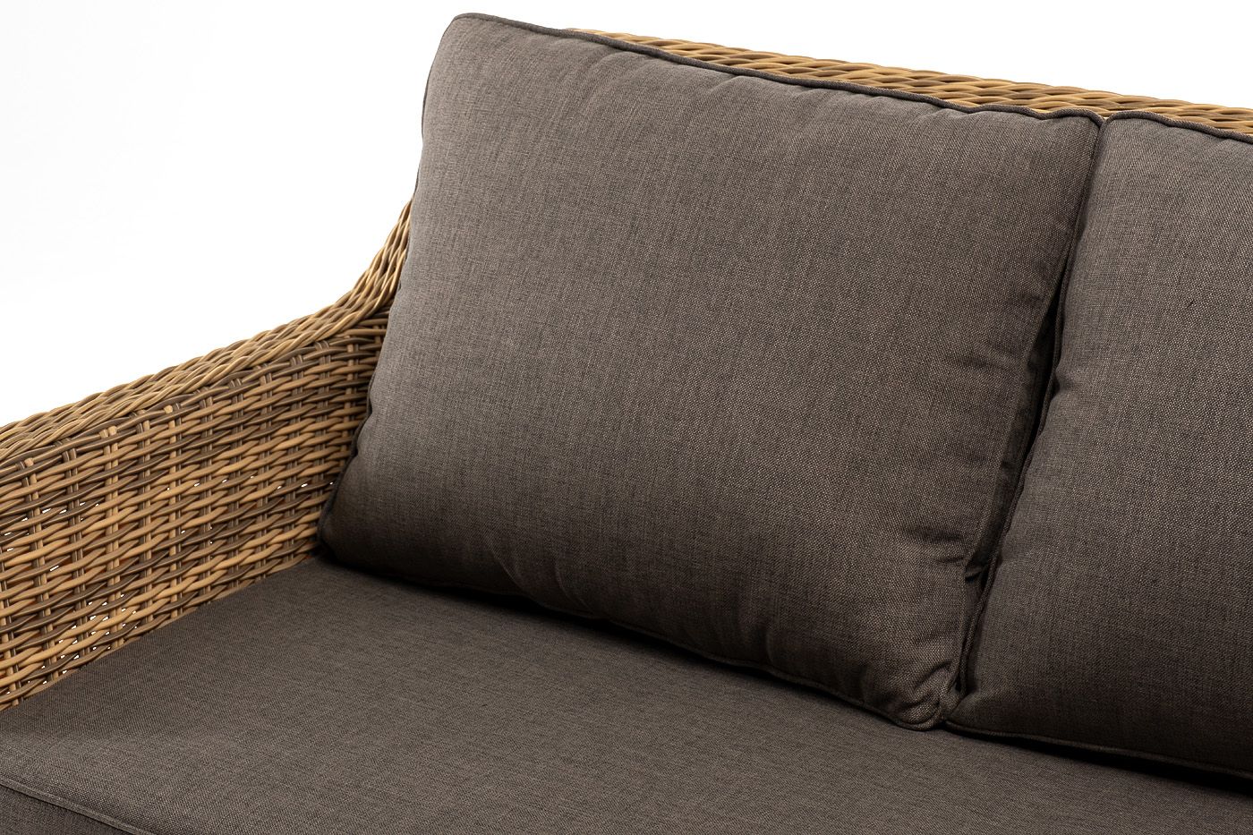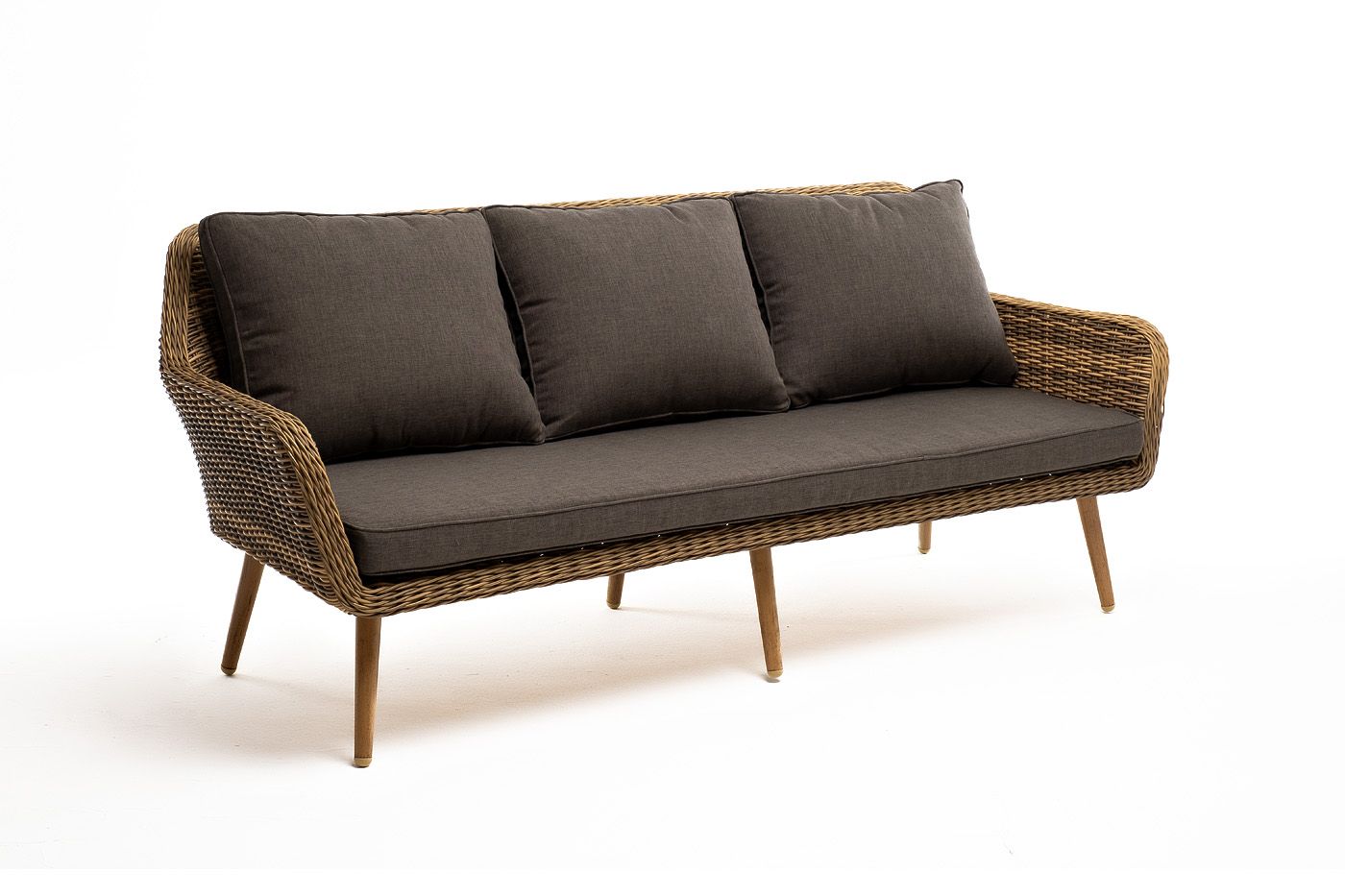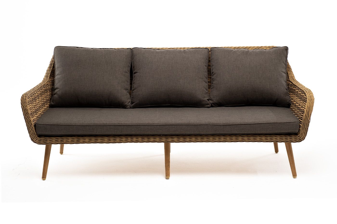Трехместный диван дополняют мягкие подушки в серо-коричневом цвете со съёмными чехлами. Тканевые изделия выполнены из прочного полиэстера плотностью 230гр/м2. Материал имеет влагоотталкивающую пропитку.