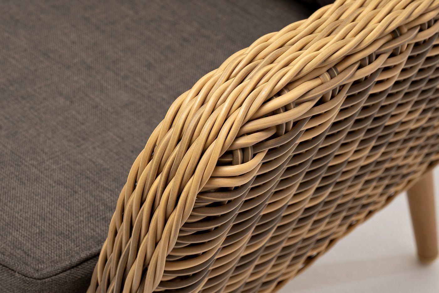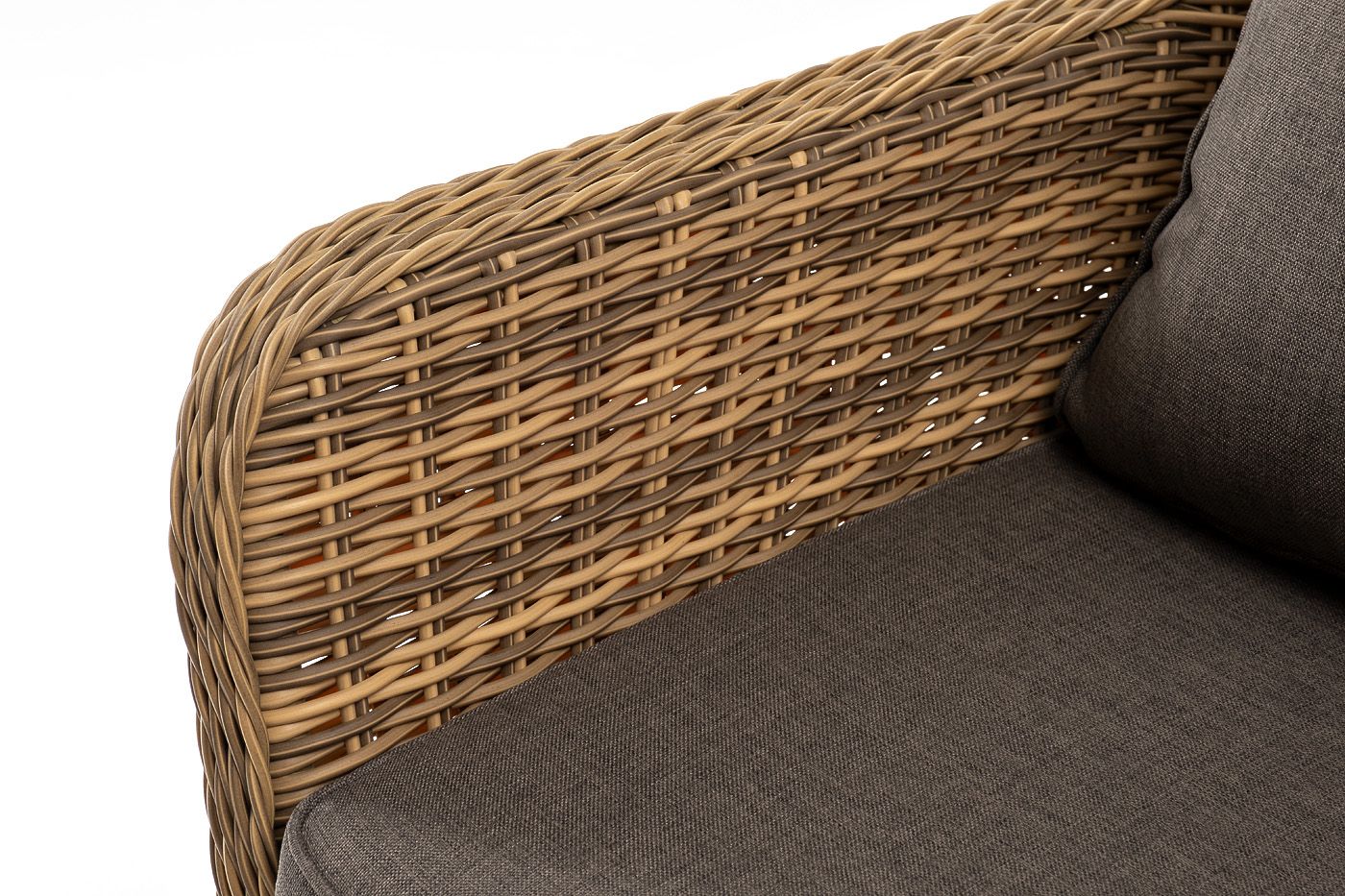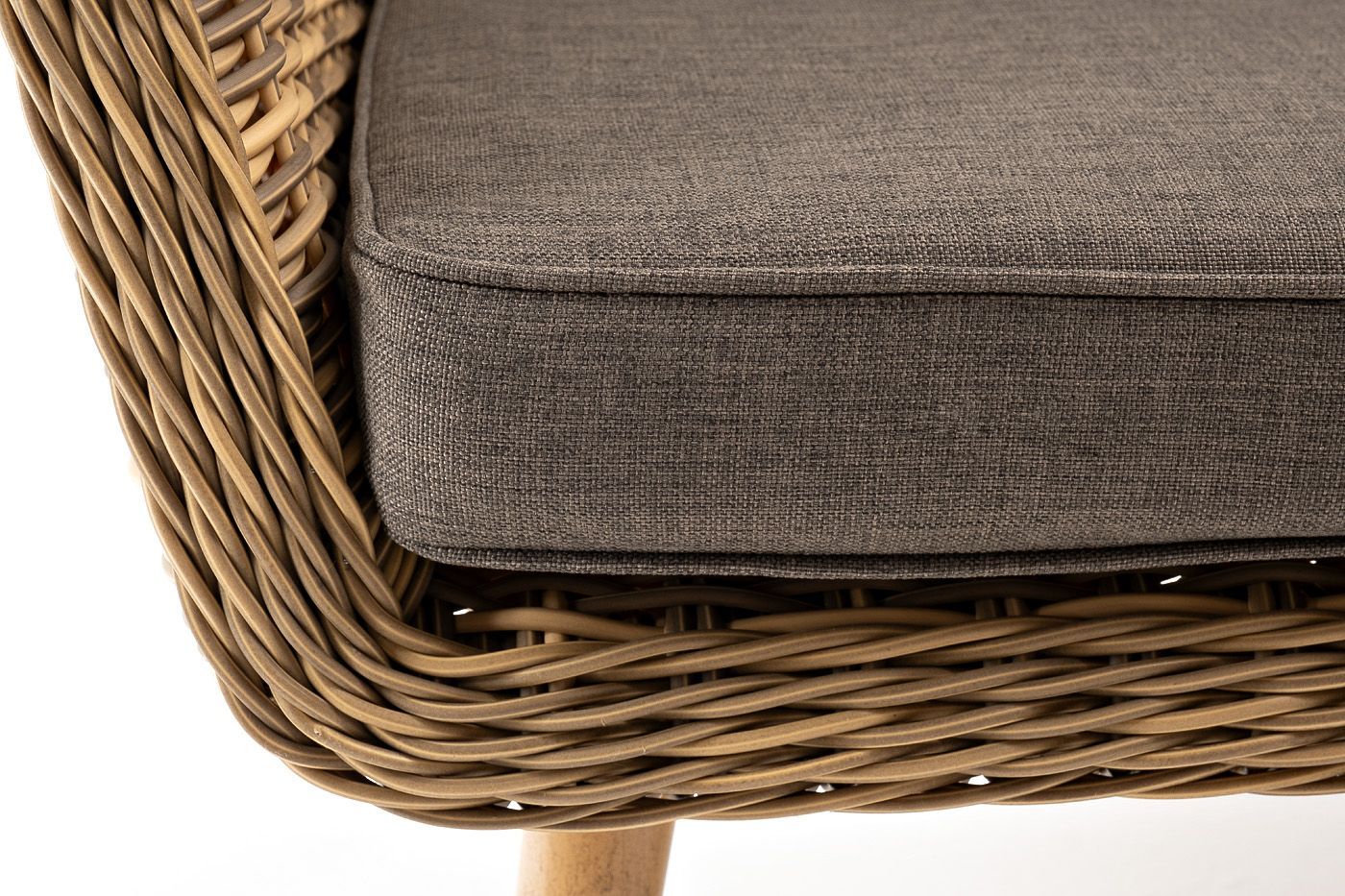 Размер модели – 1900×800×770 мм. Для оплетки каркаса используется высококачественный искусственный ротанг. Мебель выполнена в соломенном оттенке.