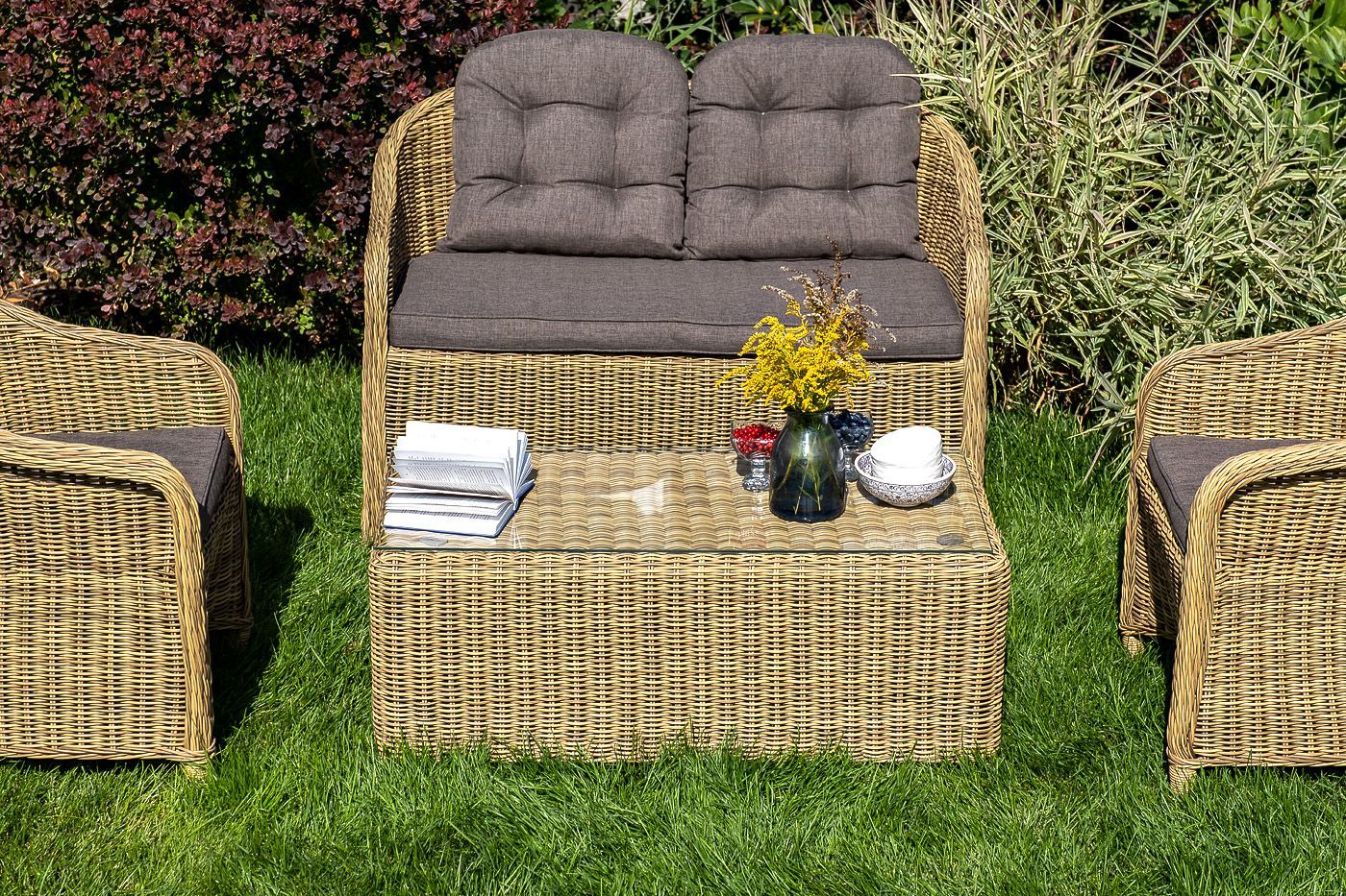 Диван выполнен из круглого искусственного ротанга, в основе алюминиевый каркас. Цвет соломенный.