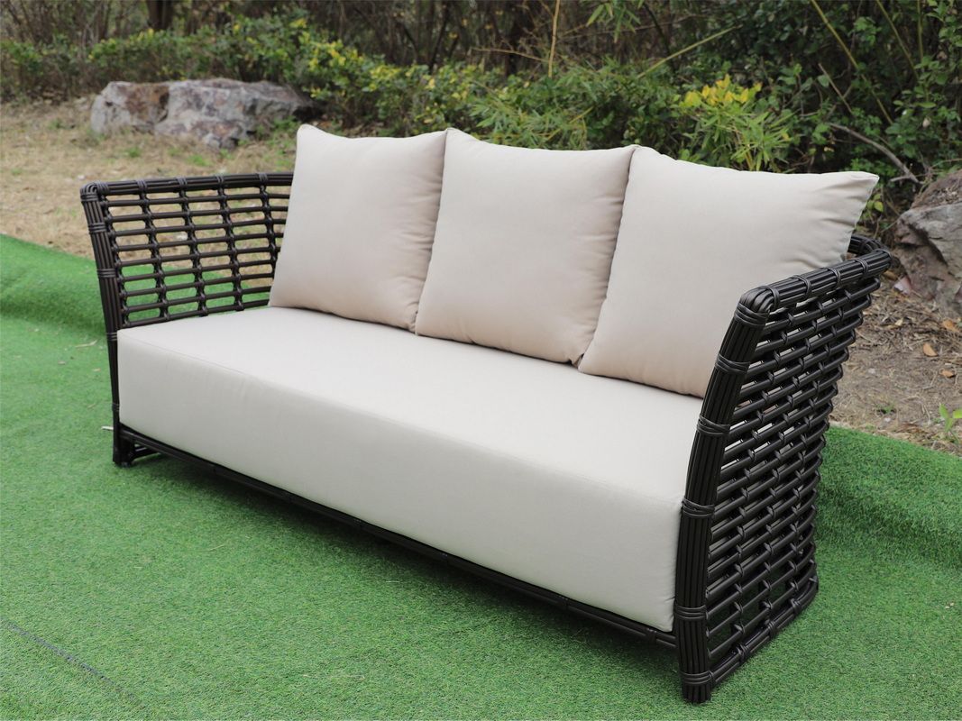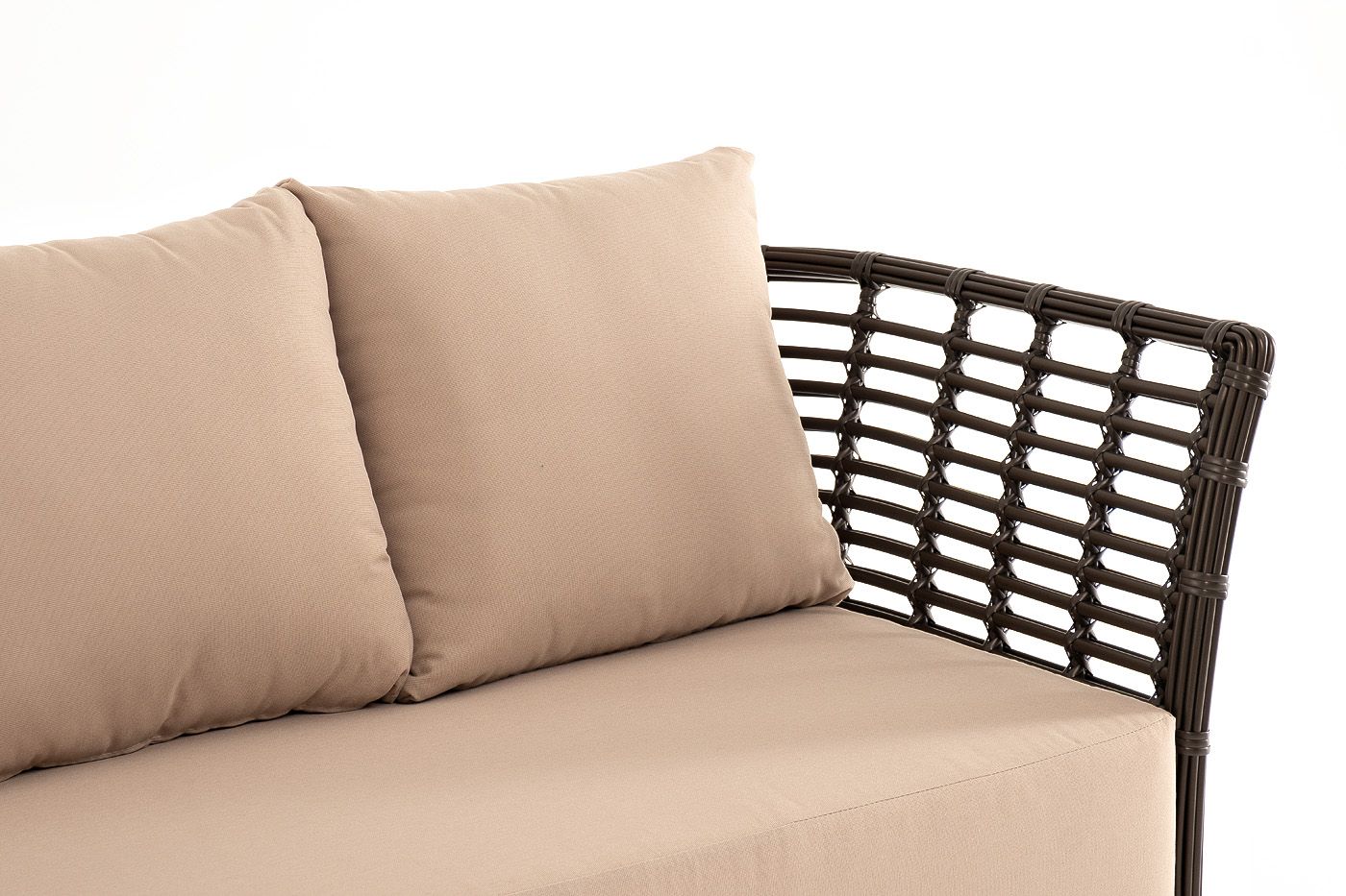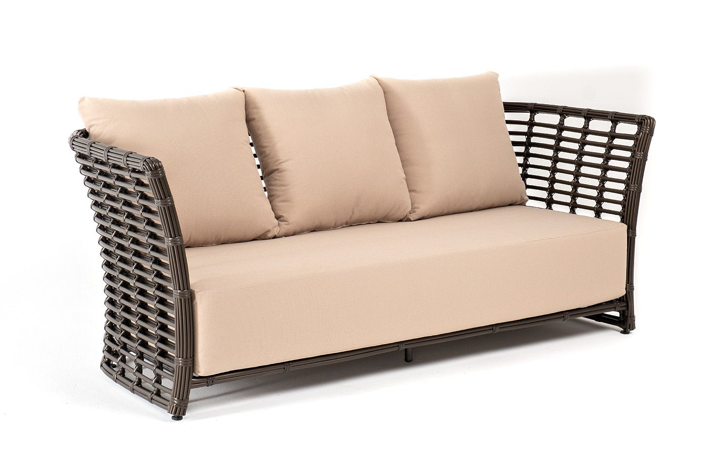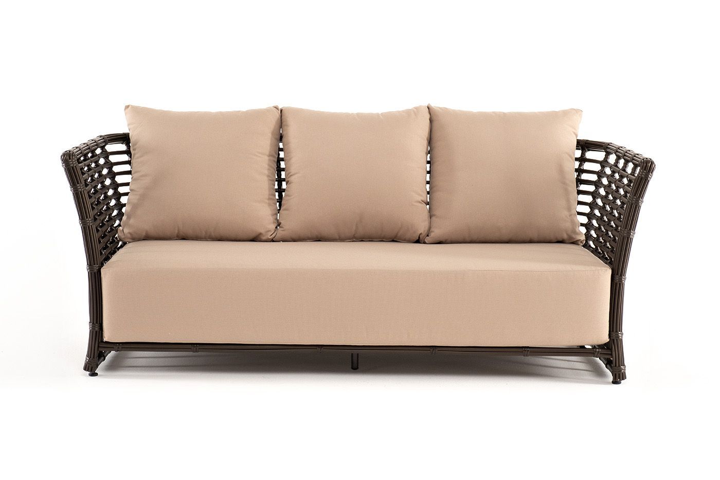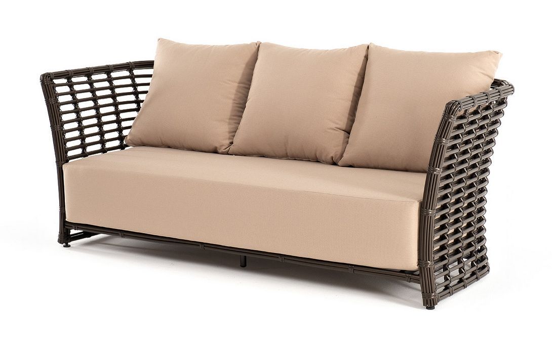 В комплекте с трехместным диваном идут мягкие подушки для комфортного расположения. Чехлы съёмные бежевого цвета из высококлассного полиэстера с плотностью 300гр/м2. Защитные свойства ткани усиливаются при помощи влагоотталкивающей пропитки.