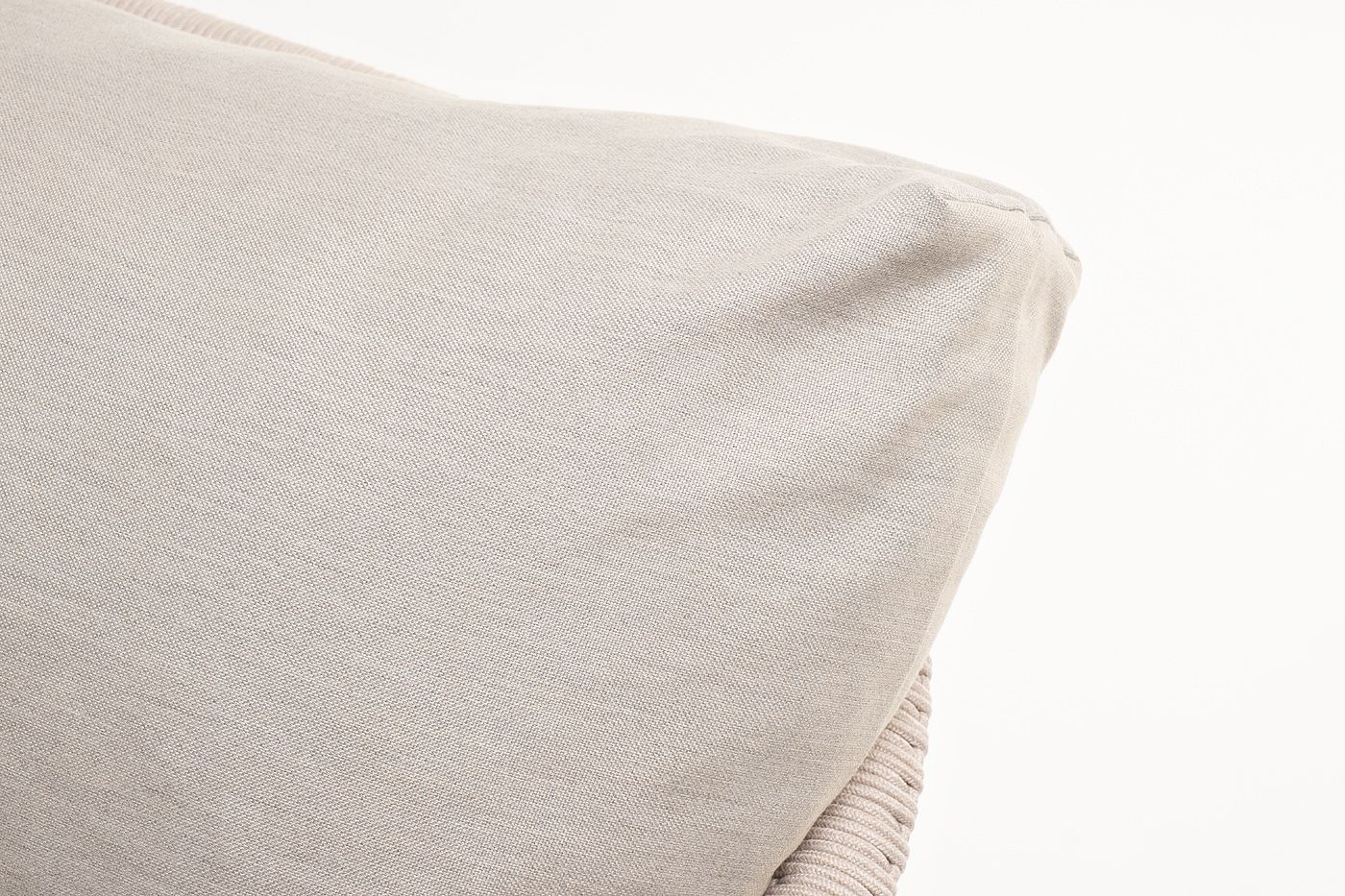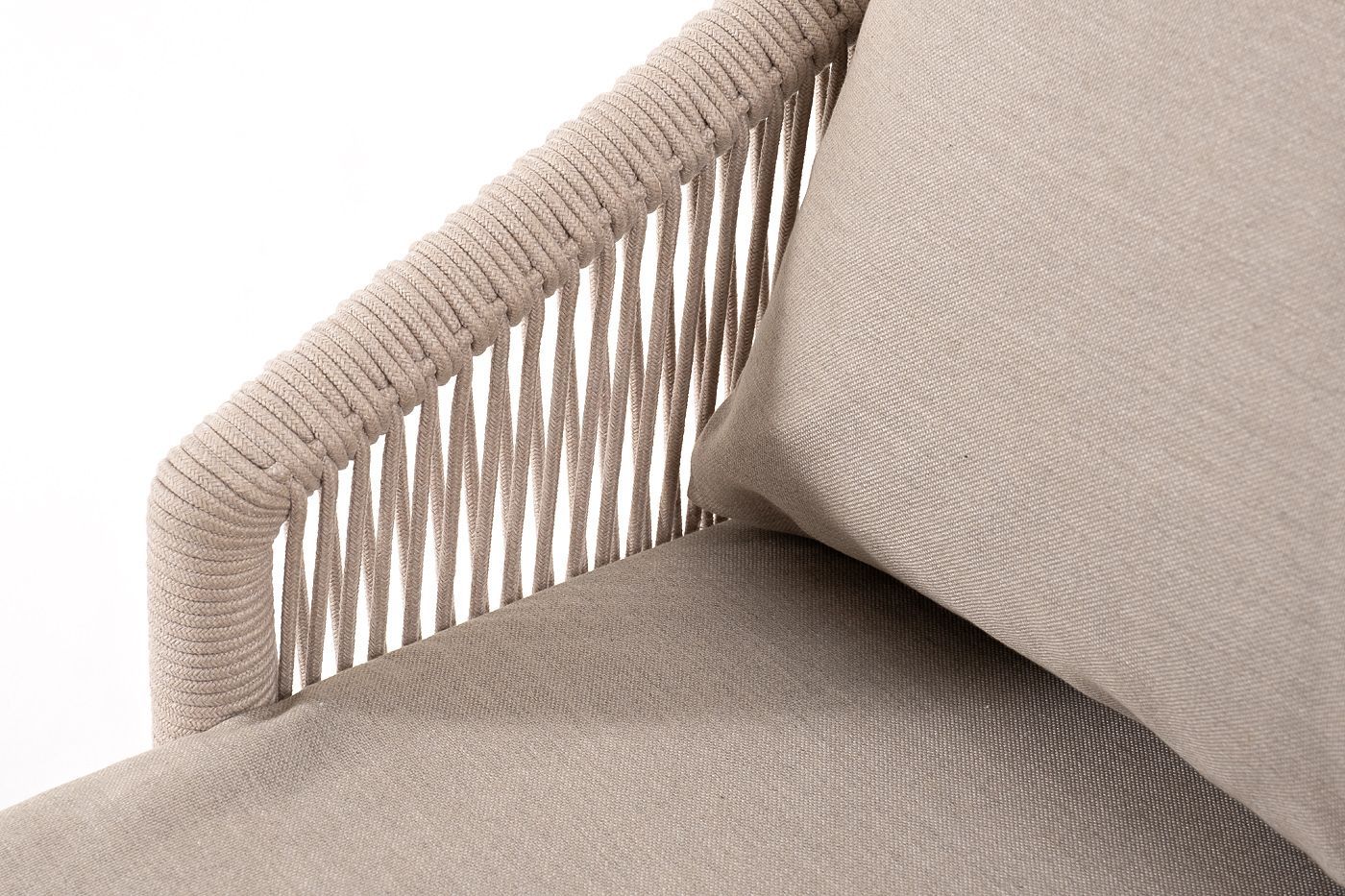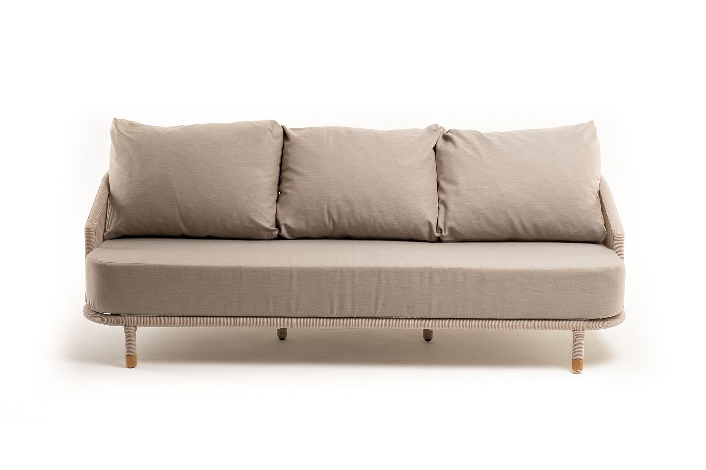 Диван имеет алюминиевый каркас, окрашенный порошковой краской в белый цвет. Боковины каркаса и спинка вручную оплетены роупом - эластичными синтетическими лентами, изготовленными из высокопрочных полиэфирных волокон. Цвет оплетки в тон каркасу - бежевый. На ножках дивана идут дубовые наконечники (заглушки).