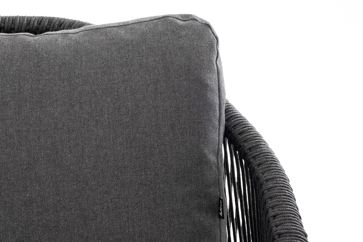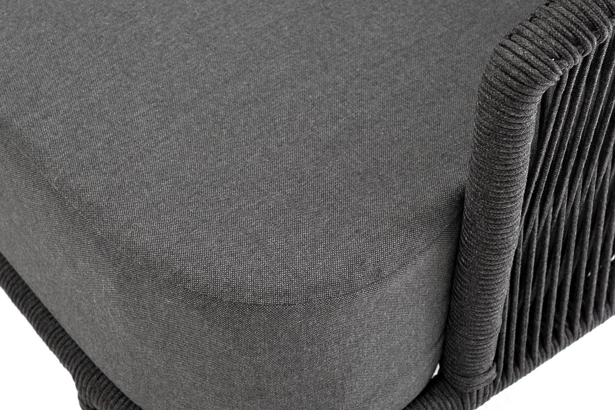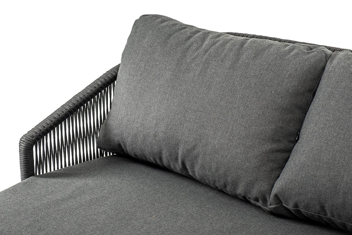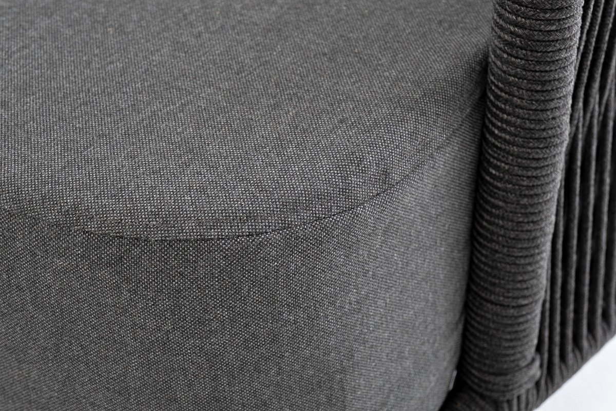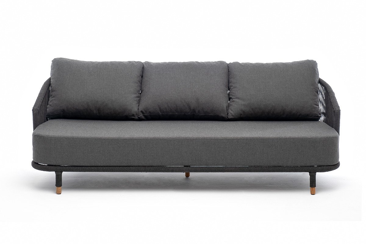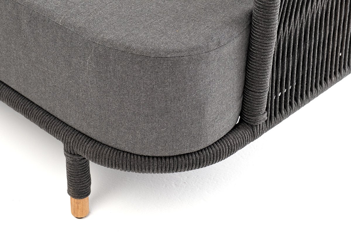 Диван имеет алюминиевый каркас, окрашенный порошковой краской в темно-серый (RAL7024) цвет. Боковины каркаса и спинка вручную оплетены роупом - эластичными синтетическими лентами, изготовленными из высокопрочных полиэфирных волокон. Цвет оплетки в тон каркасу - темно-серый. На ножках дивана идут дубовые наконечники (заглушки).