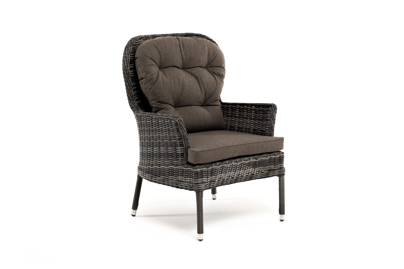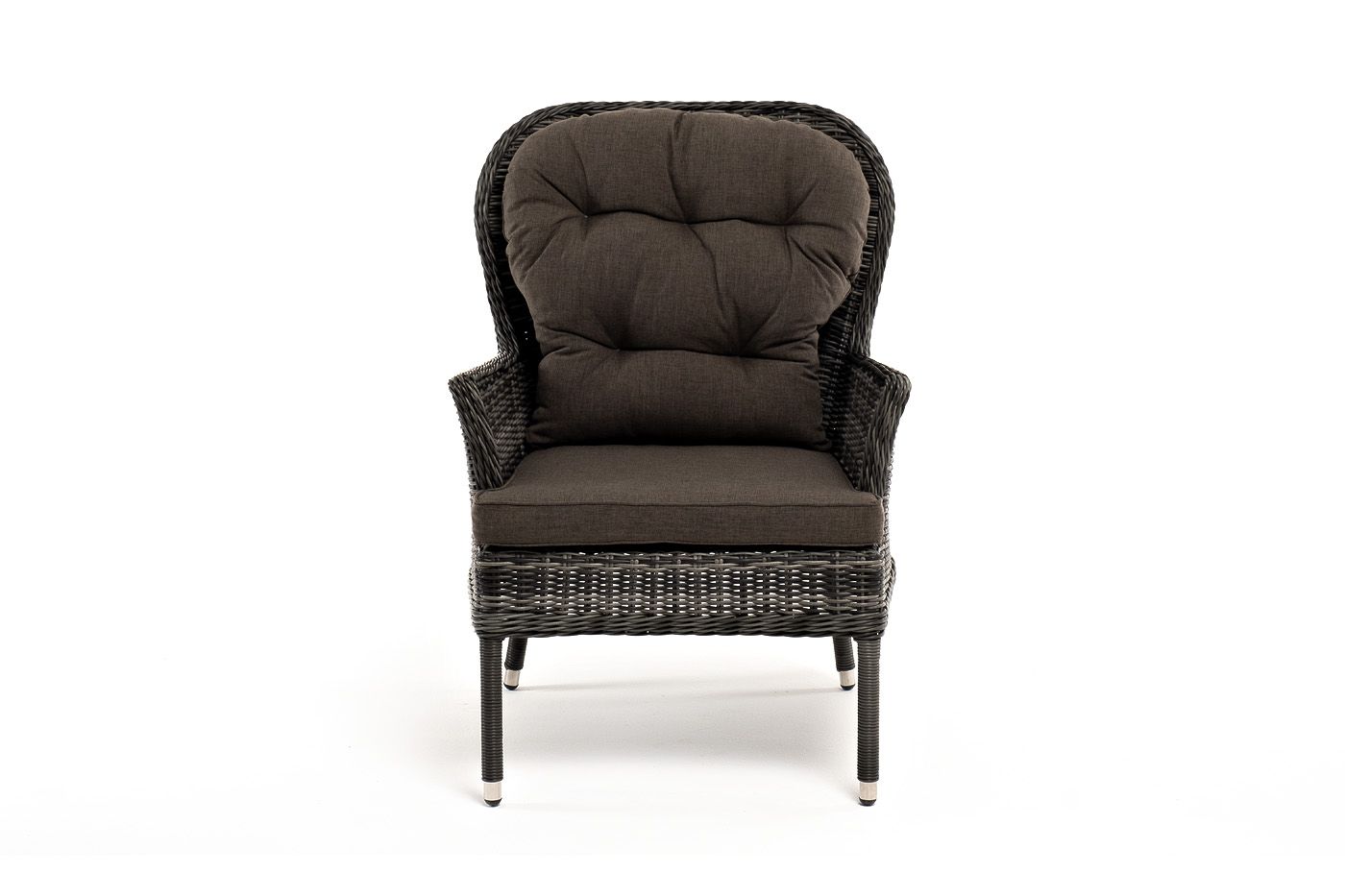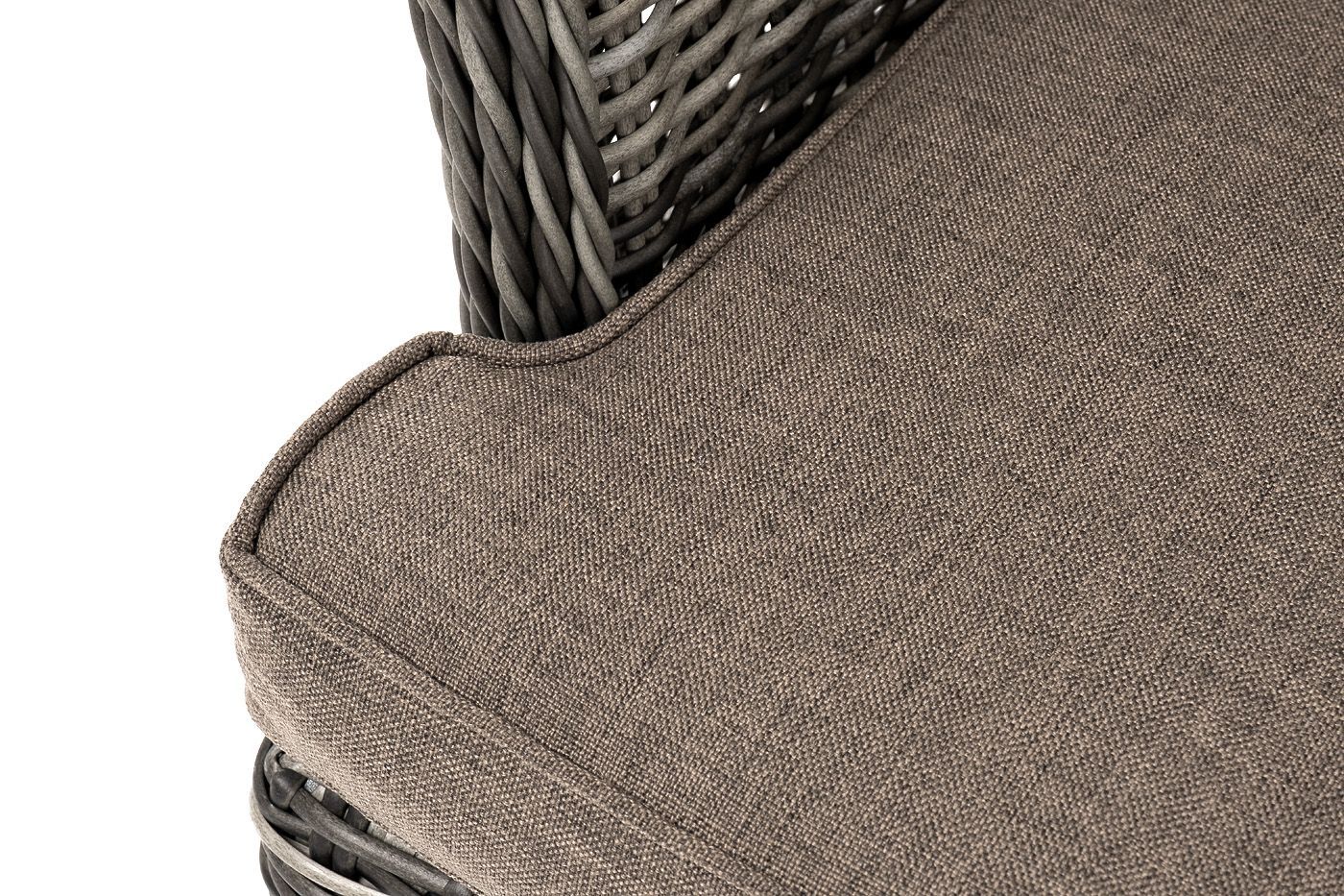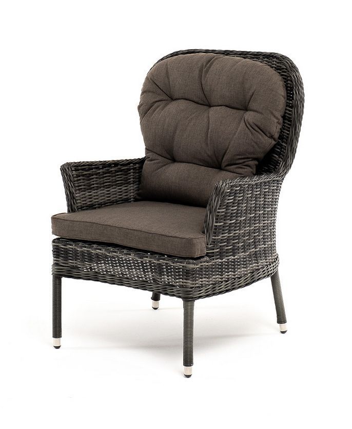 В садовое кресло укомплектовывается мягкими подушками. Они пошиты из износостойкого полиэстера серо-коричневого оттенка с плотностью 230гр/м2. Защитные свойства синтетического материала усиливаются благодаря влагоотталкивающей пропитке.